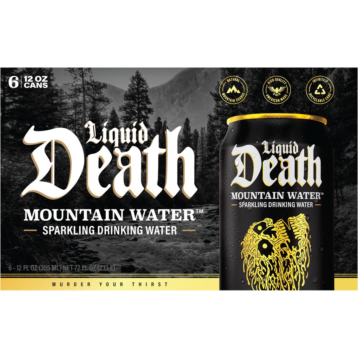 Natural mountain source. High quality American made. Murder your thirst. Death to plastic. Life changing sparkling water! Once I hit that lottery, I would only drink this if I could. - Shanise. By a long shot the best water I have ever had. I used this to stop drinking beer. - Jones. Water Source: Rocky Mountains (Mackay, Idaho) and/or Blue Ridge Mountains (Bland, Virginia). liquiddeath.com. For a good time. For Water Quality & Info: 1-888-980-4760 or Visit: liquiddeath.com. We donate a portion of the profits from every can sold to help kill plastic pollution. Infinitely recyclable cans.