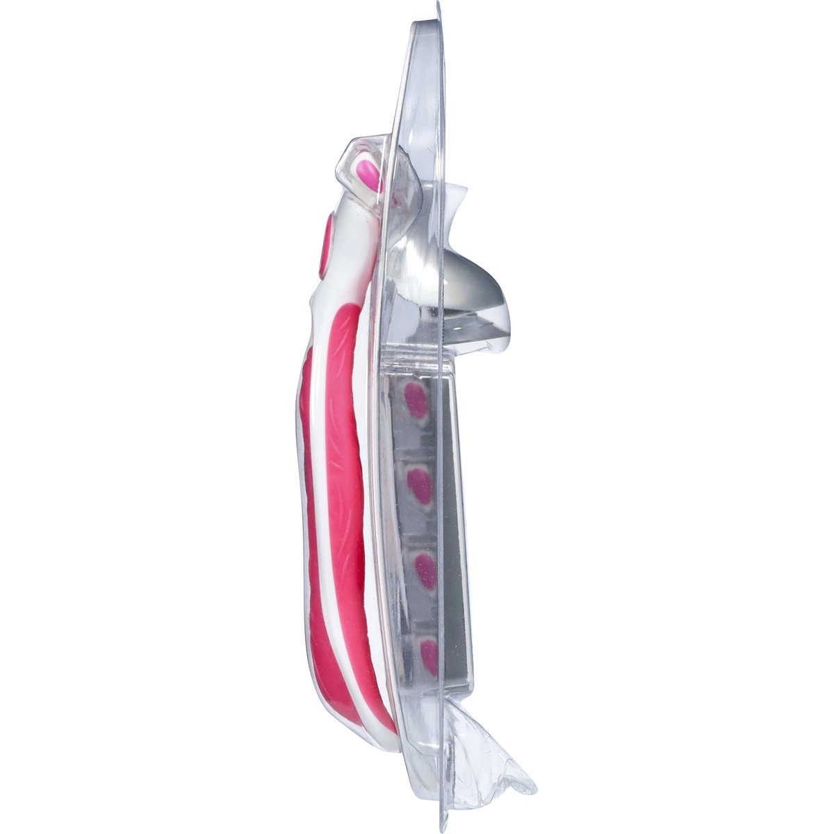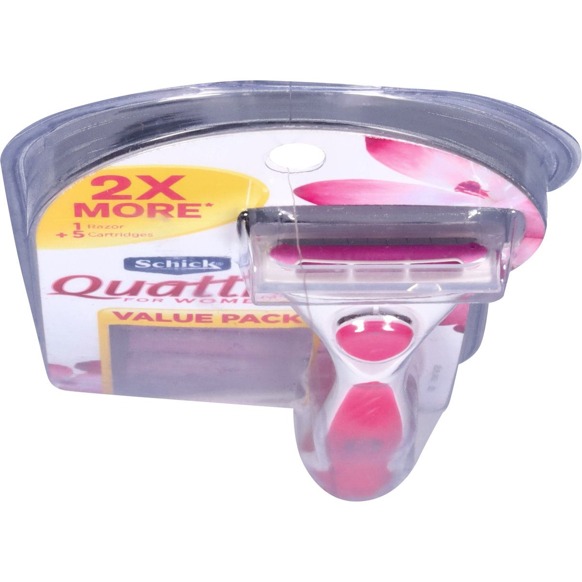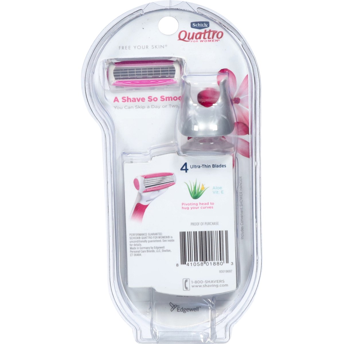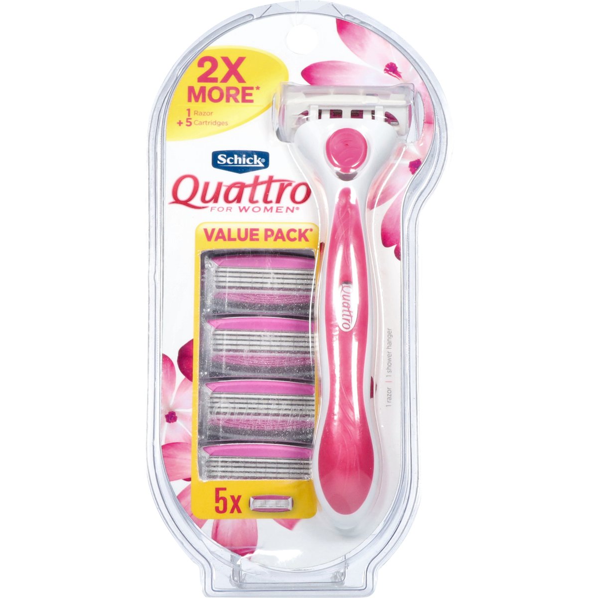 1 razor + 5 cartridges. 2x more. Free your skin. A shave so smooth. You can skip a day or two. 4 Ultra-thin blades. Aloe vit. E. Pivoting head to hug your curves. Includes convenient shower hanger. Performance Guarantee: Schick Quattro for Women is unconditionally guarantee. See inside for details. www.shaving.com. Made in Germany.