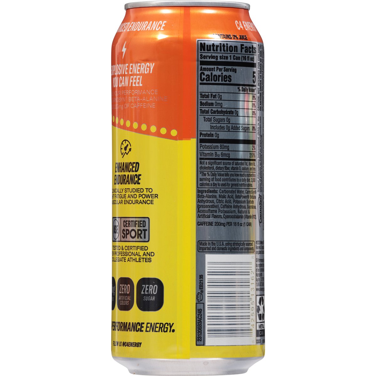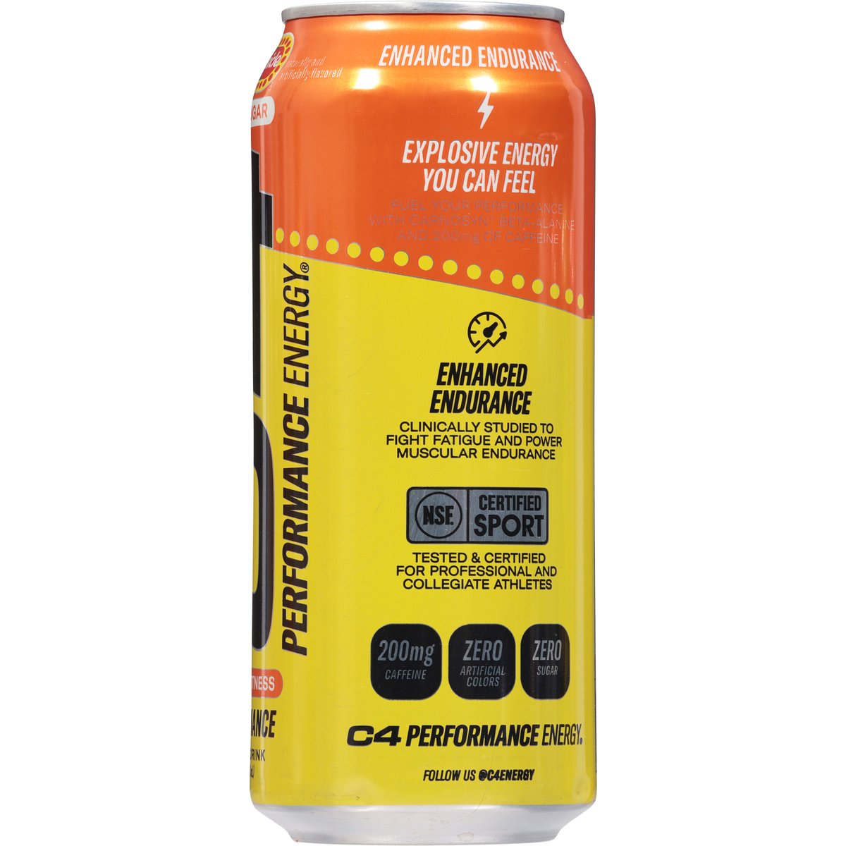 Naturally & artificially flavored. Zero sugar. 200 mg caffeine. Caffeine 200 mg per 16 fl oz (1 can). Performance energy. Sport + fitness. C4 performance energy. Enhanced endurance. Explosive energy you can feel. Fuel your performance with carnosyn beta-alanine and 200 mg of caffeine. Enhanced endurance. Clinically studied to fight fatigue and power muscular endurance. Tested & certified for professional and collegiate athletes. NSF Certified Sport. Tested & certified for professional and collegiate athletes. how2recycle.info. www.c4energy.com. Follow us @c4energy. 1.866.927.9686 Made in the U.S.A. using strategically sourced imported and domestic ingredients and components.