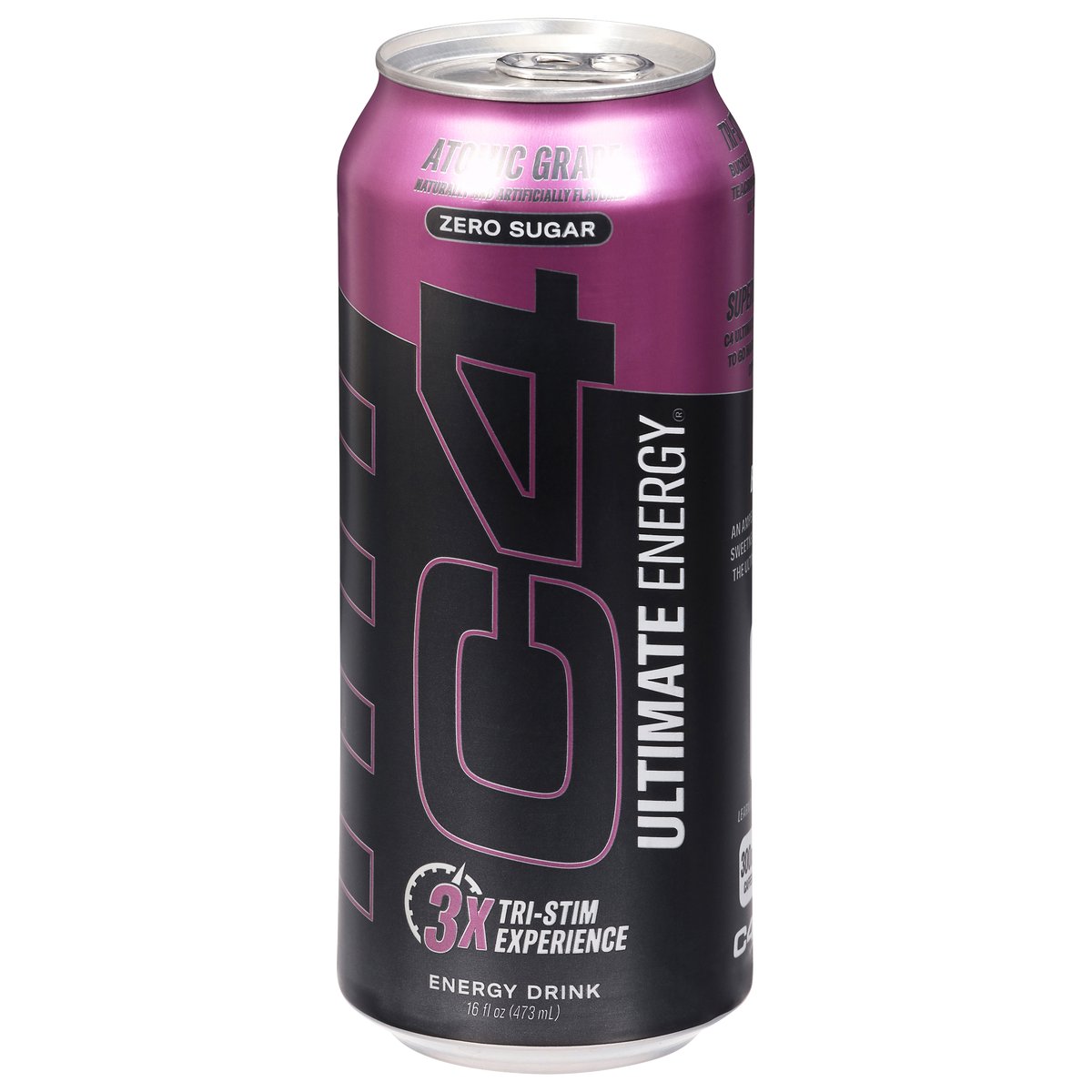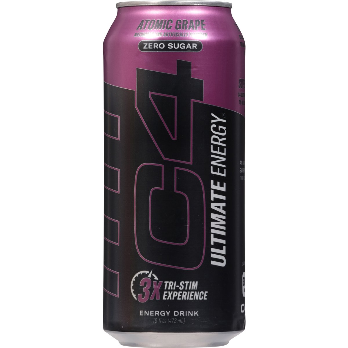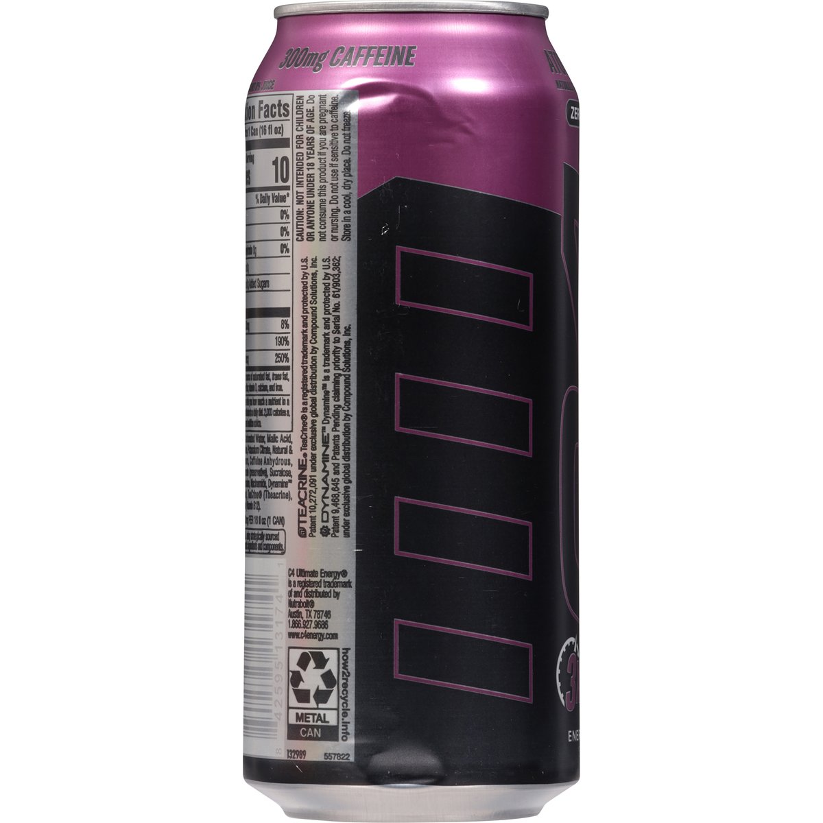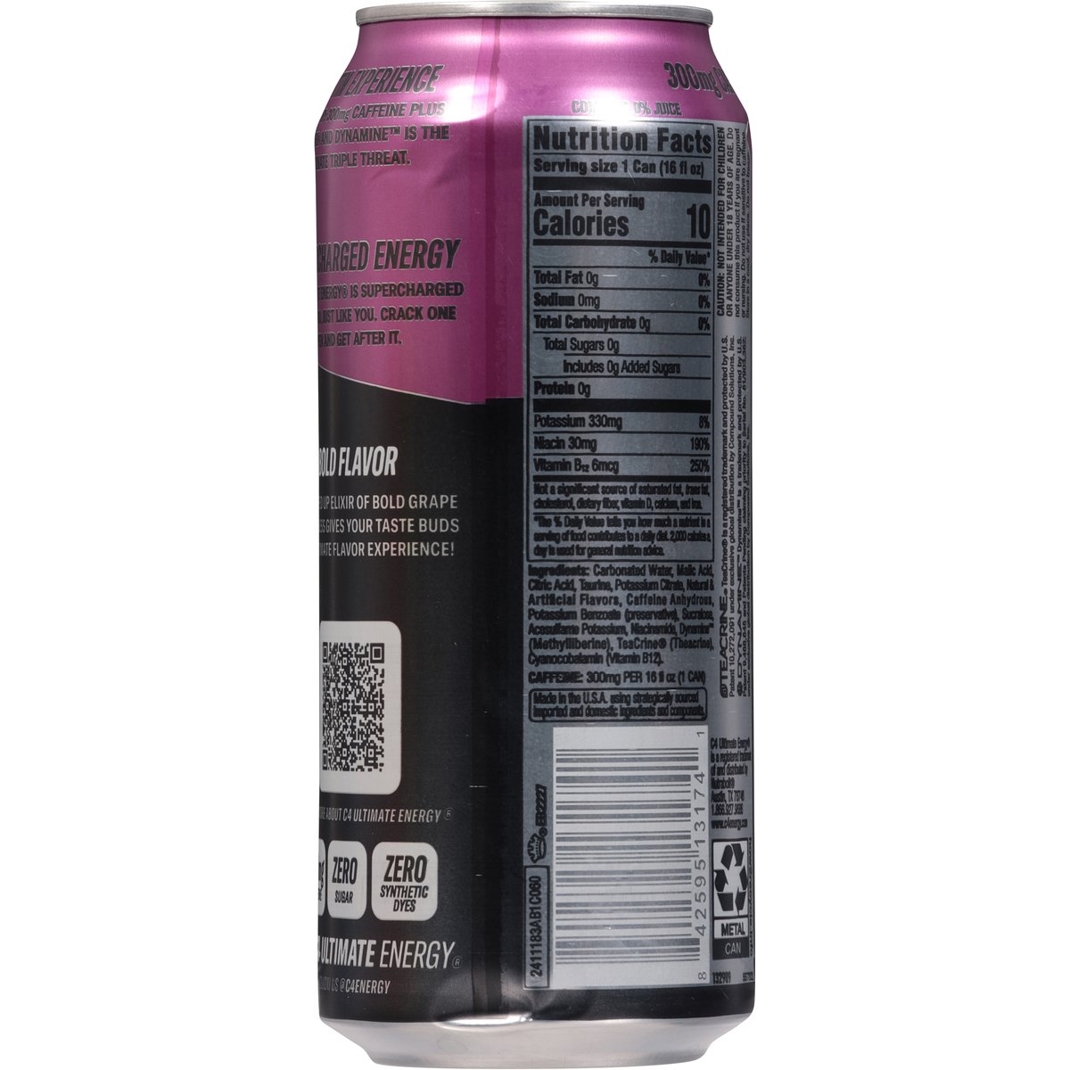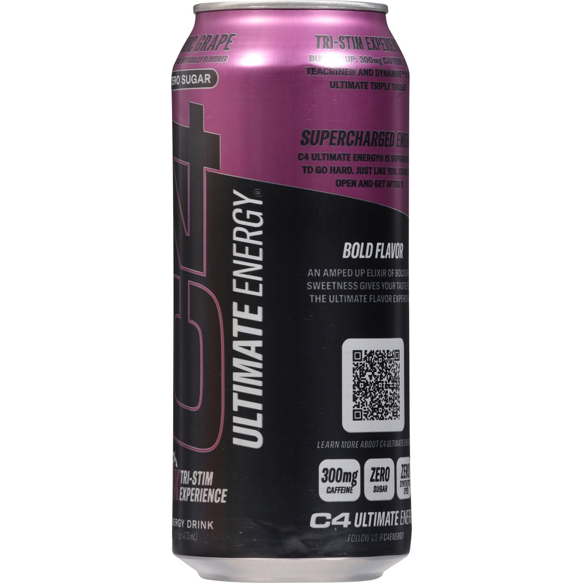 Naturally and artificially flavored. Zero sugar. 300 mg caffeine. Caffeine: 300 mg per 16 fl oz (1 can). 3x tri-stim experience. Tri-Stim Experience: Buckle Up: 300 mg caffeine plus. Teacrine and dynamine is the ultimate triple threat. Supercharged Energy: C4 Ultimate Energy is supercharged to go hard. Just like you. Crack one open and get after it. Bold Flavor: An amped up elixir of bold grape sweetness gives your taste buds the ultimate flavor experience! Zero synthetic dyes. www.c4energy.com. how2recycle.info. Learn more about C4 Ultimate Energy. Follow us @C4Energy. 1.866.927.9686. Made in the U.S.A. using strategically sourced imported and domestic ingredients and components.