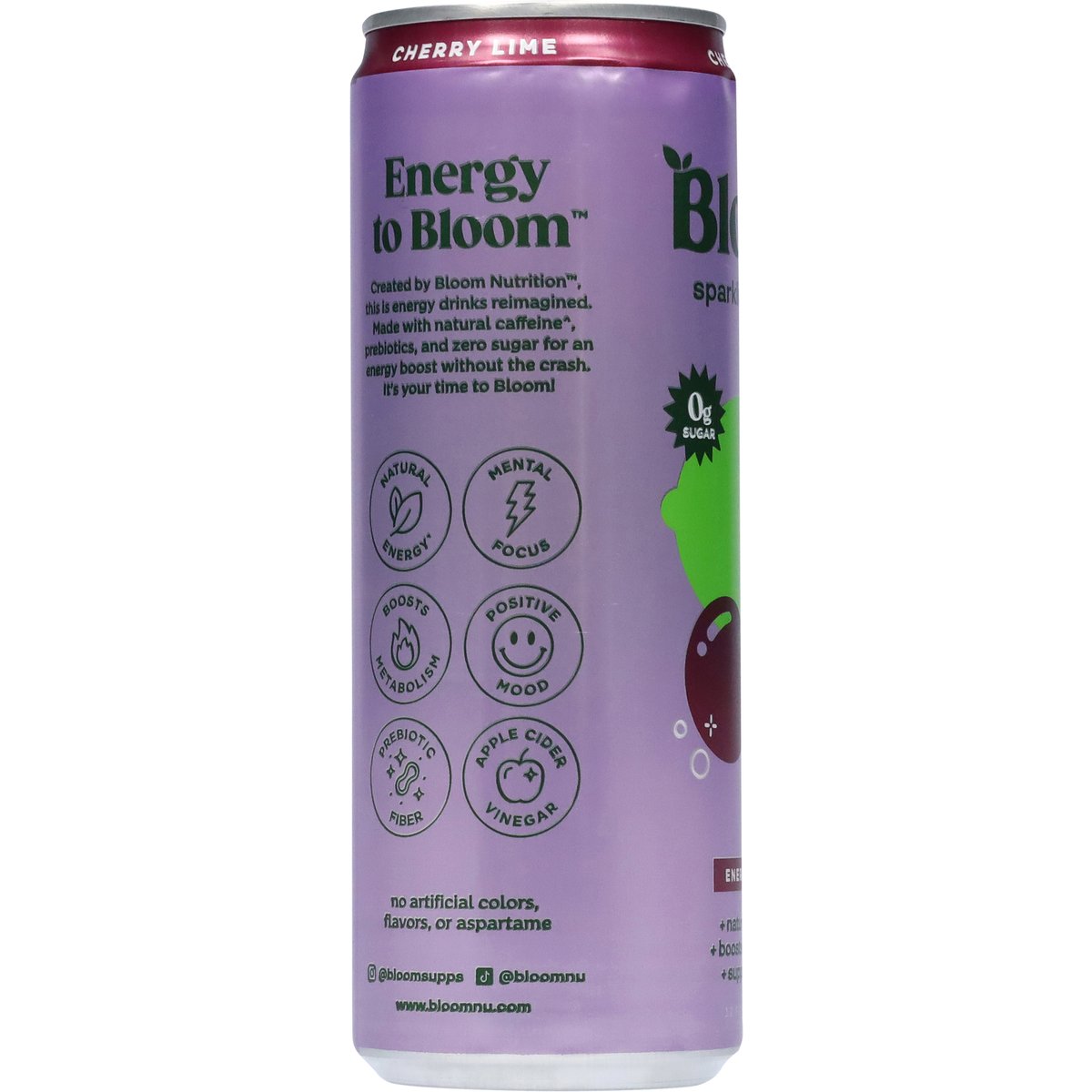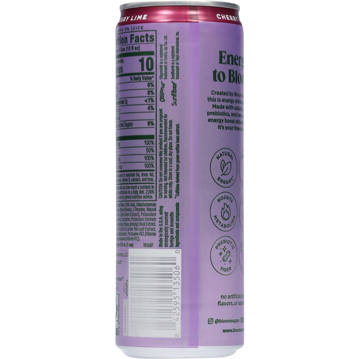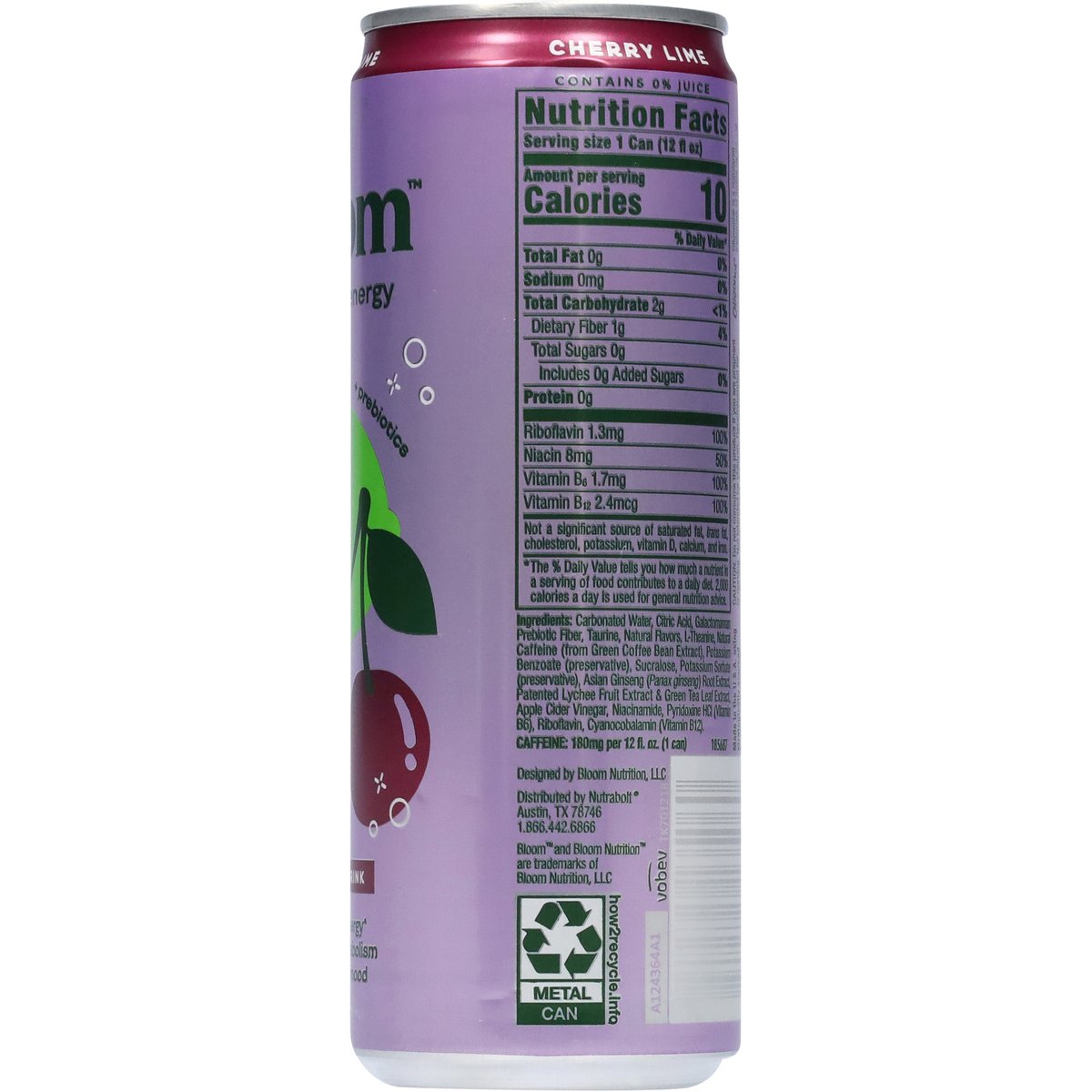 Flavor with other natural flavors. No artificial colors, flavors, or aspartame. 0 g sugar. Caffeine: 180 mg per 12 fl oz (can). + prebiotic. + natural energy(a). + boosts metabolism. + supports mood. Energy to Bloom. Created by Bloom Nutrition, this is energy drinks reimagined. Made with natural caffeine(a), prebiotics, and zero sugar for an energy boost without the crash. It's your time to Bloom!. Boost metabolism. Mental focus. Positive mood. Prebiotic fiber. Apple cider vinegar. (a) Caffeine derived from green coffee bean extract. www.bloomnu.com. how2recycle.info. Instagram: @bloomsupps. TikTok: @bloomnu. 1.866.442.6866. Made in the U.S.A. using strategically sourced foreign and domestic ingredients and components.