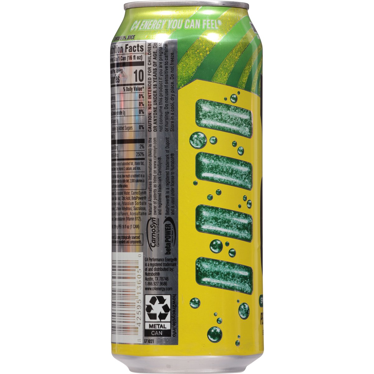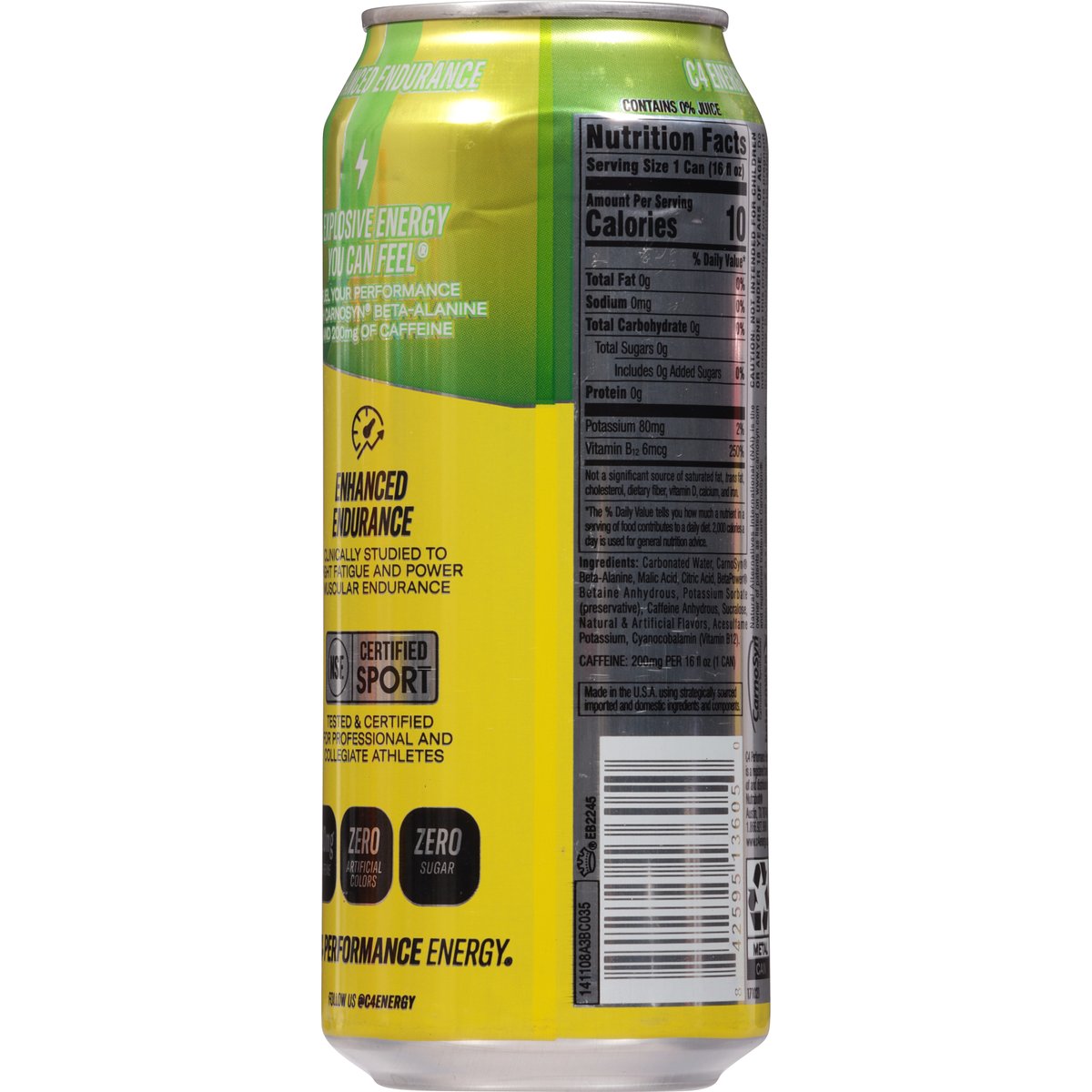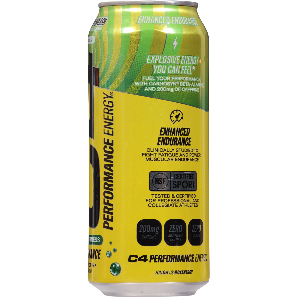 Naturally & artificially flavored. Zero sugar. Caffeine: 200 mg per (16 fl oz (1 can). 200 mg caffeine. Sport + fitness. Performance energy. C4 energy you can feel. Enhanced endurance. Explosive energy you can feel. Fuel your performance with CarnoSyn beta-alanine and 200mg of caffeine. Enhanced endurance. Clinically studied to fight fatigue and power muscular endurance. Zero artificial colors. NSF: Certified Sport. Tested & certified for professional and collegiate athletes. www.c4energy.com. how2recycle.info. Follow us @C4energy. 1.866.927.9686. Made in the U.S.A using strategically sourced imported and domestic ingredients and components.