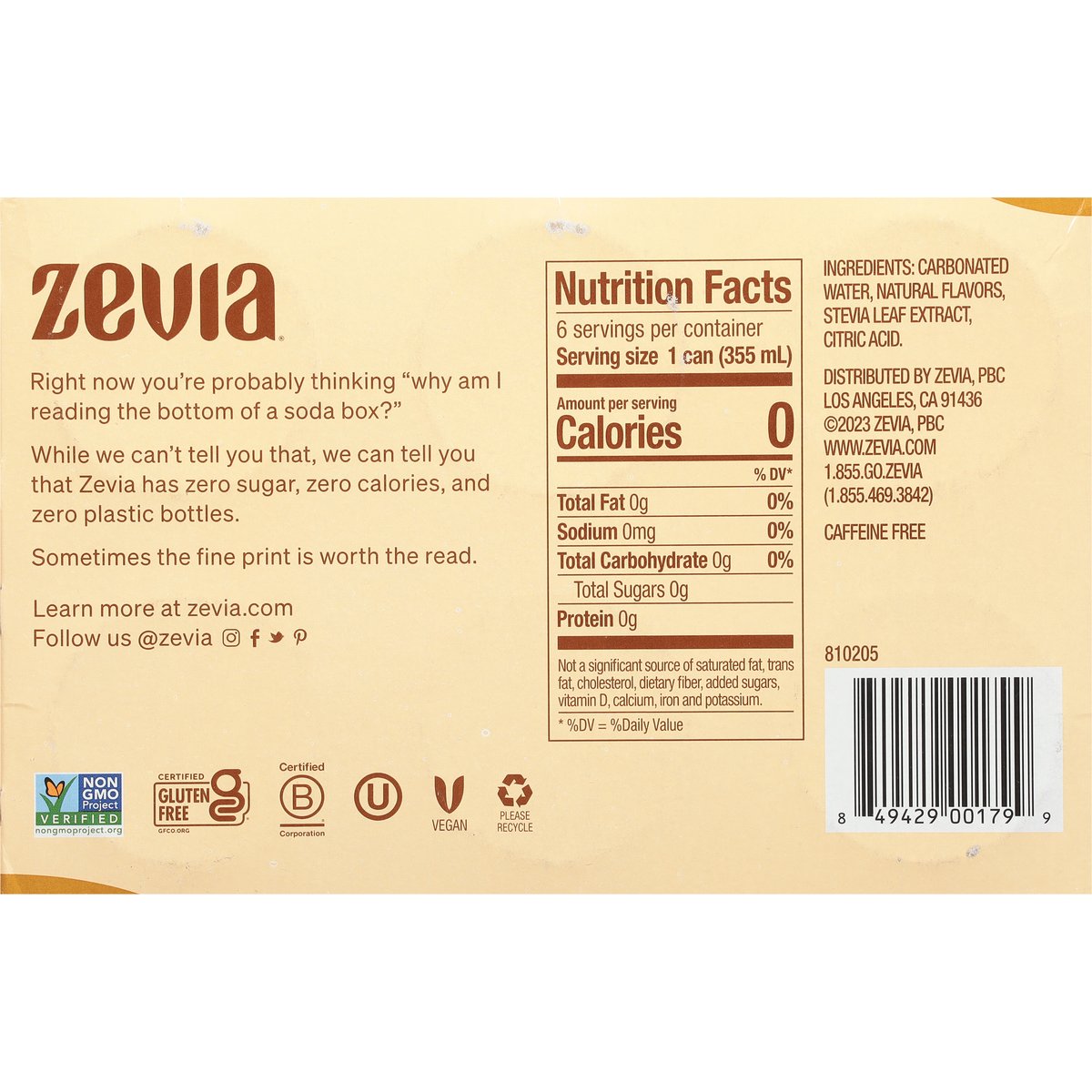 Naturally flavored. Zero sugar. Certified gluten free. Vegan. Caffeine free. Non-GMO Project verified. nongmoproject.org. Right now you're probably thinking why am I reading the bottom of a soda box? While we can't tell you that, we can tell you that Zevia has zero sugar, zero calories, and zero plastic bottles. Sometimes the fine print is worth the read. www.zevia.com. Follow us (at)zevia. Instagram. Facebook. Twitter. Pinterest. Learn more at zevia.com. Certified B Corporation. Please recycle. Product of Canada.