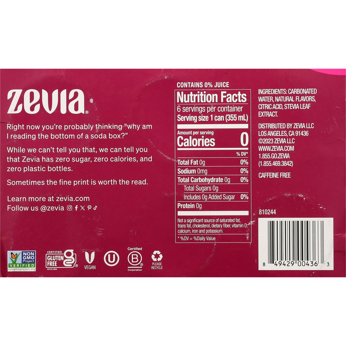 Naturally flavored. Certified gluten free. gfco.org. Zero sugar. Vegan. Zero calories. Caffeine free. Non-GMO Project verified. nongmoproject.org. Right now you're probably thinking why am i reading the bottom of a soda box? While we can't tell you that, we can tell you that Zevia has zero sugar, zero calories, and zero plastic bottles. Sometimes the fine print is worth the read. www.zevia.com. Follow us (at)zevia. Instagram. Facebook. X. Pinterest. TikTok. Learn more at zevia.com. 1.855.GO.ZEVIA (1.855.469.3842). Certified B Corporation. Please recycle.