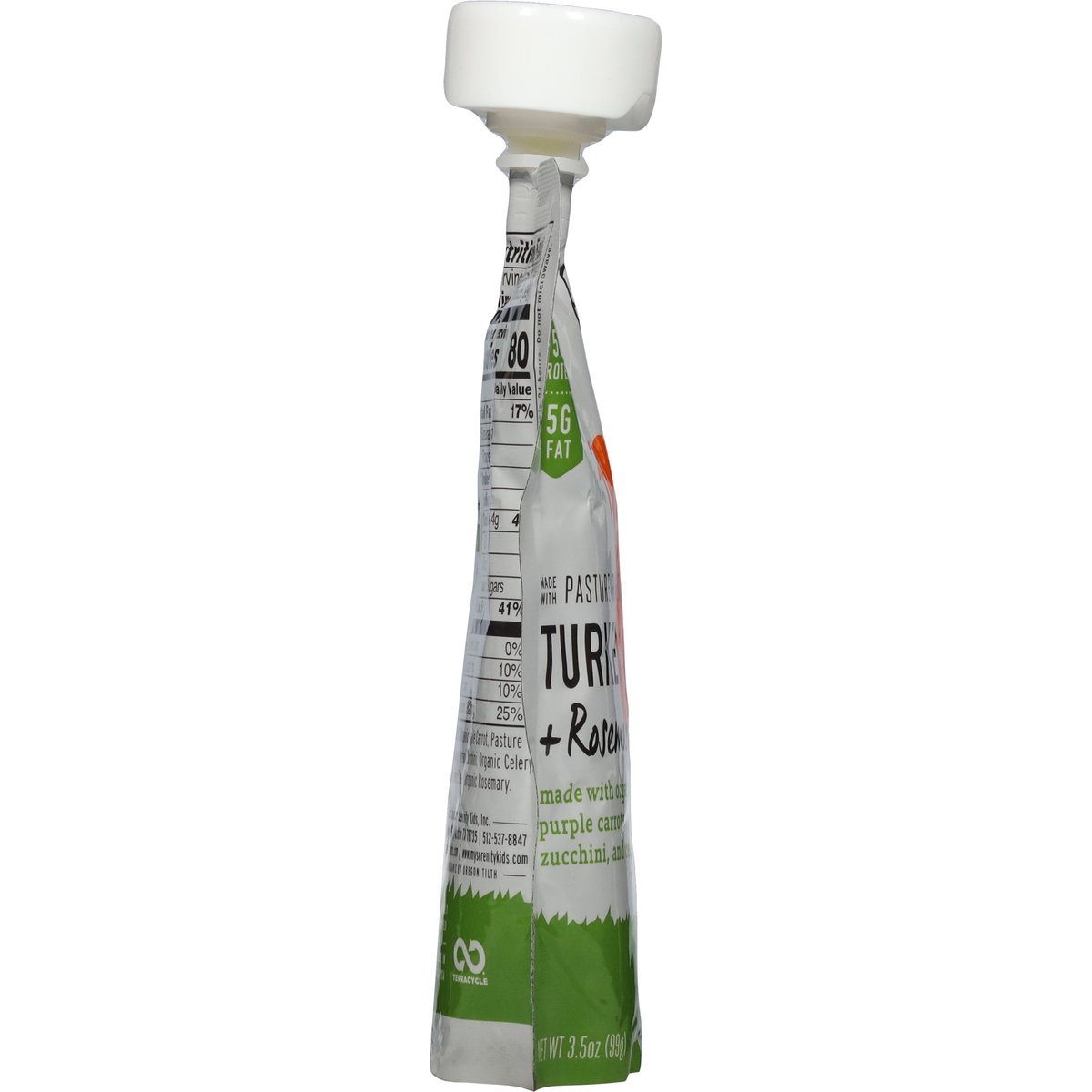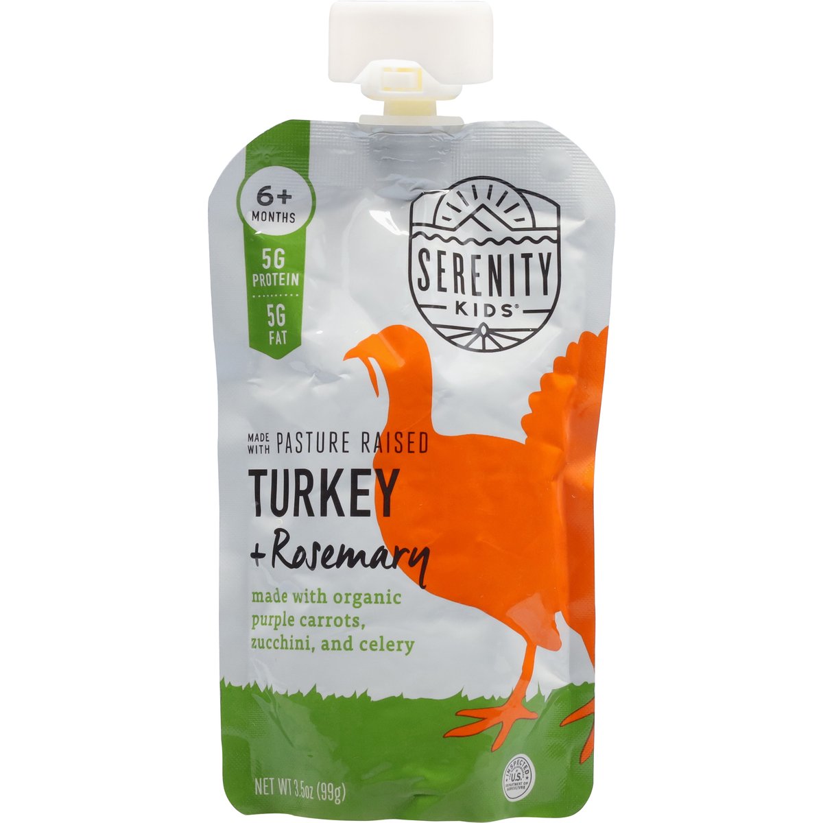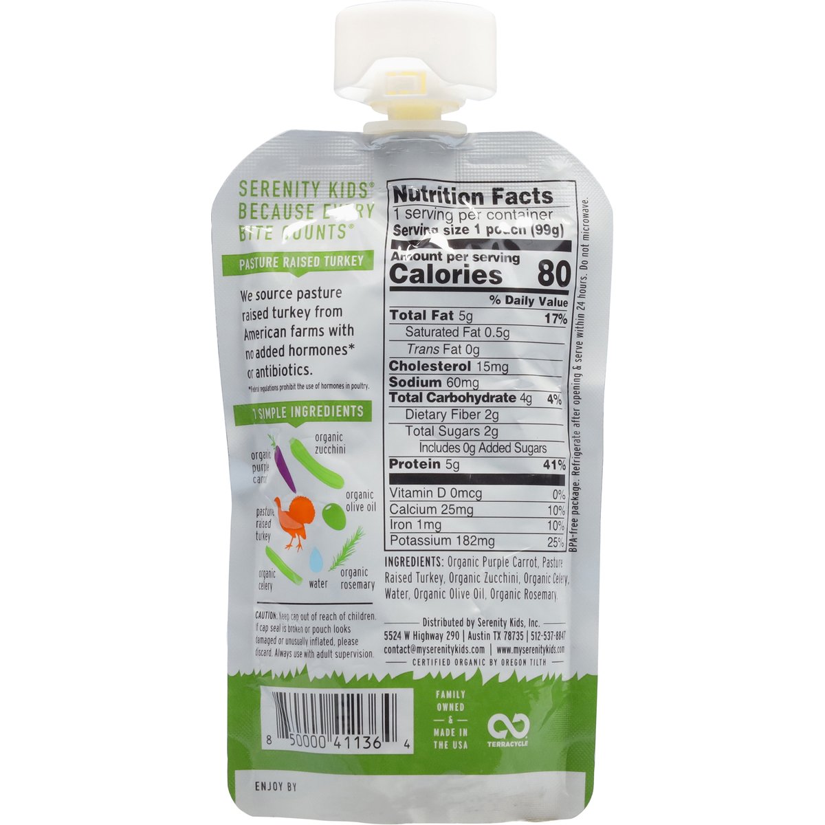 6+ months. 5 g protein. 5 g fat. Certified Organic by Oregon Tilth. Serenity Kids because every bite counts. Pasture Raised Turkey: We source pasture raised turkey from American farms with no added hormones* or antibiotics. 7 Simple Ingredients: Organic purple carrot; Organic zucchini; Pasture raised turkey; Organic olive oil; Organic celery; Organic rosemary. *Federal regulations prohibit the use of hormones in poultry. Inspected for wholesomeness by U.S. Department of Agriculture. www.myserenitykids.com. 512-537-8847 | contact@myserenitykids.com. BPA-free package. Terracycle. Family owned & made in the USA.