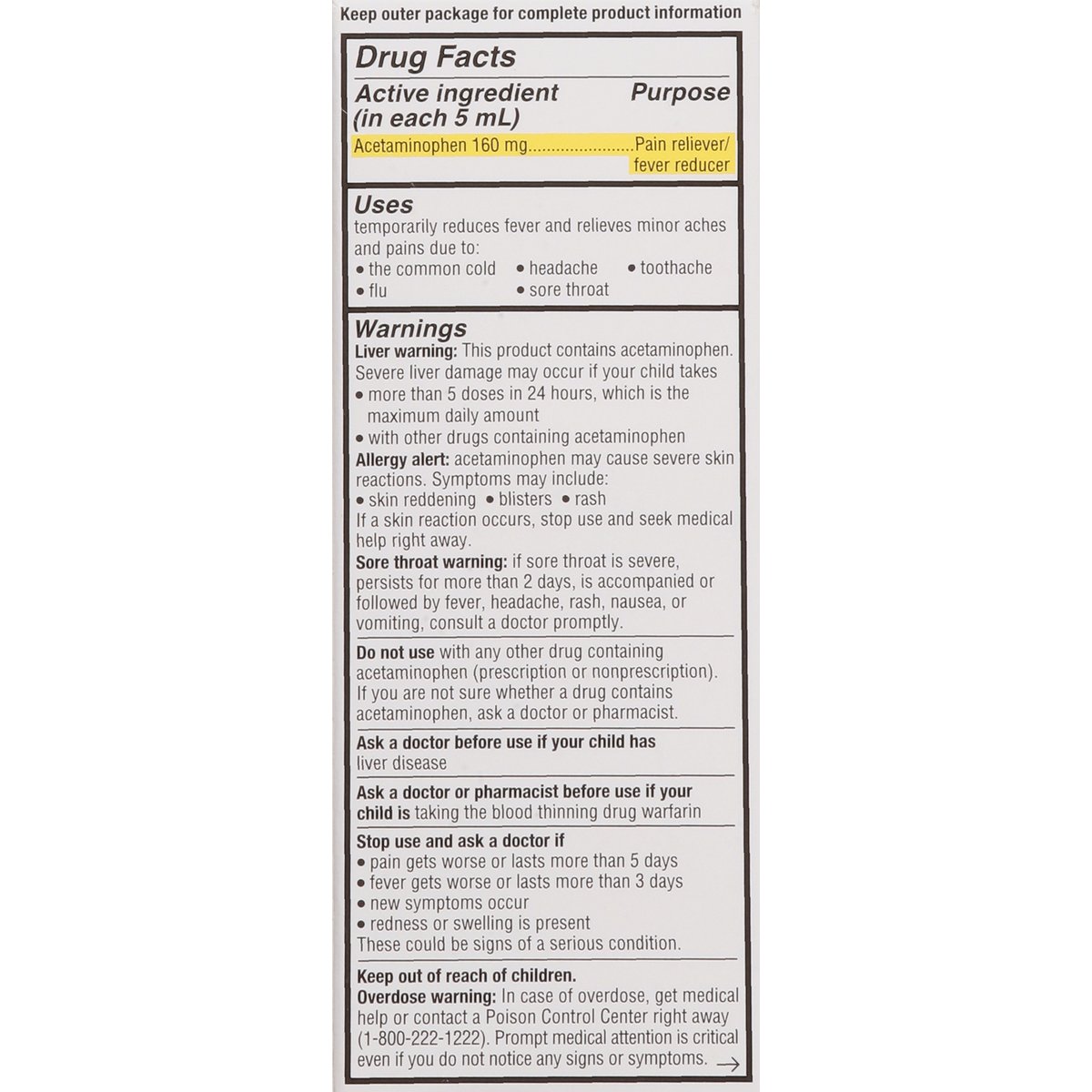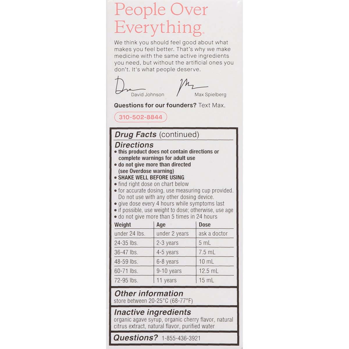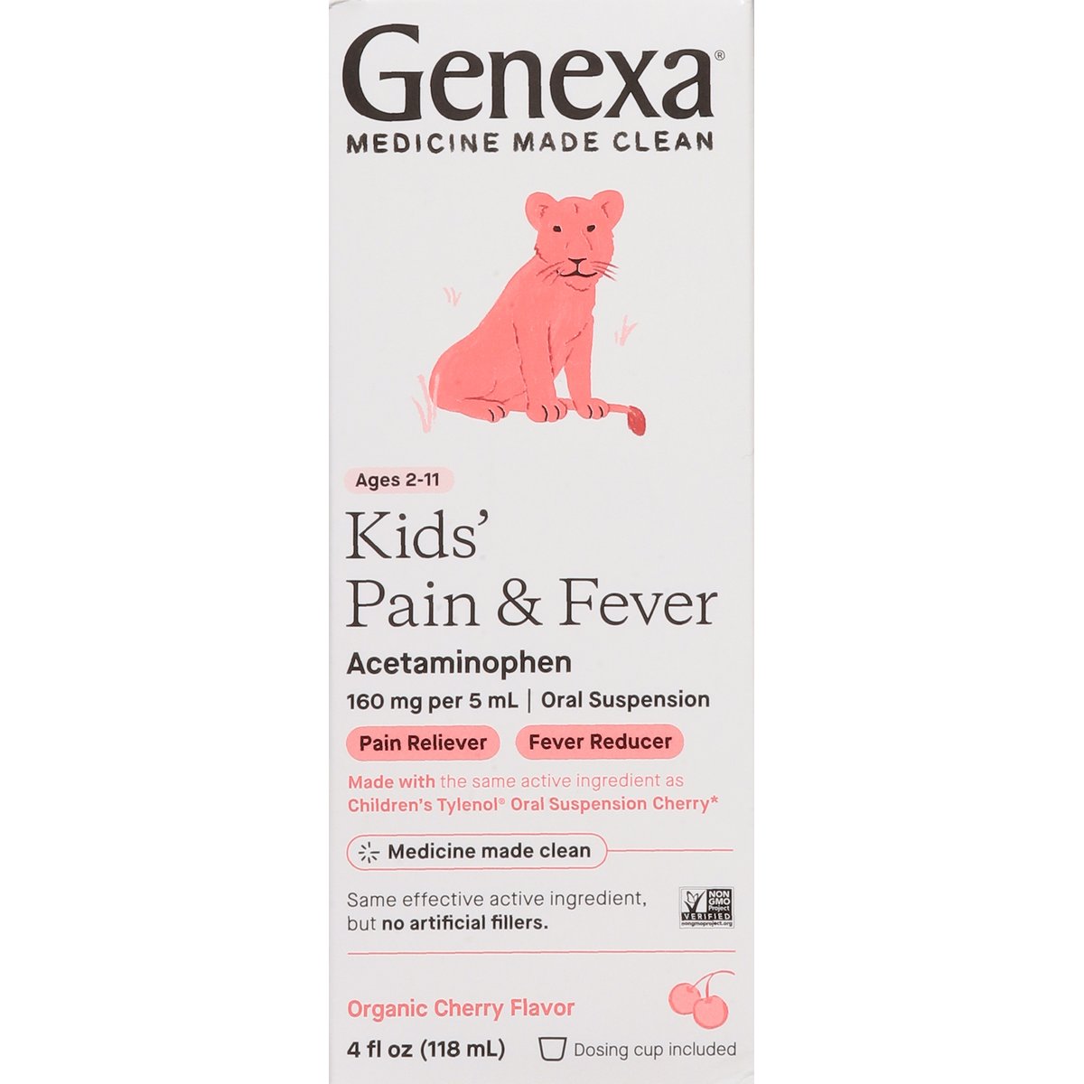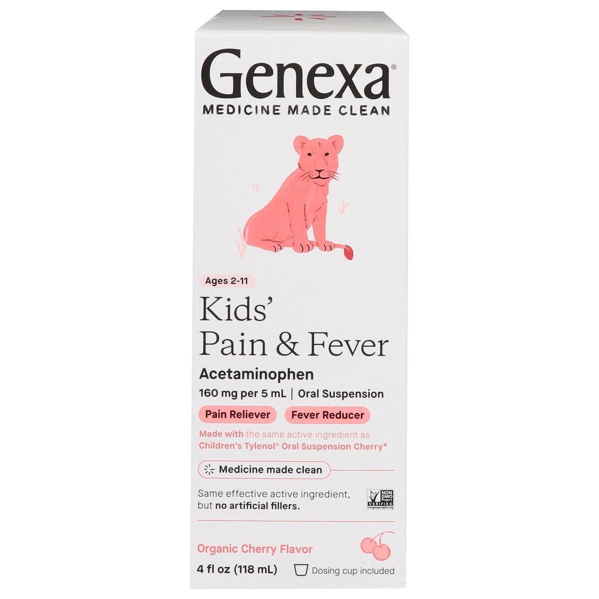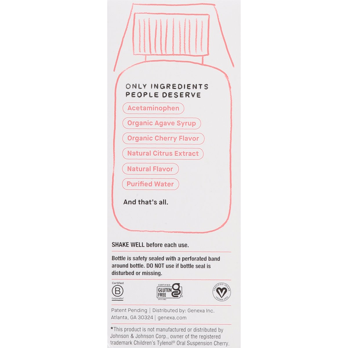 Ages 2-11. Acetaminophen. 160 mg per 5 ml. Oral suspension. Pain reliever. Fever reducer. Certified gluten free. gfco.org. Certified vegan. Vegan.org. Non-GMO Project verified. nongmoproject.org. Made with the same active ingredient as Children's Tylenol Oral Suspension Cherry (This product is not manufactured or distributed by Johnson & Johnson Corp., owner of the registered trademark Children's Tylenol Oral Suspension Cherry). Medicine made clean. Same effective active ingredient, but no artificial fillers. Dosing cup included. People Over Everything: We think you should feel good about what makes you feel better. That's why we make medicine with the same active ingredients you need, but without the artificial ones you don't. It's what people deserve. - David Johnson, Max Spielberg. genexa.com. Questions for our founders? Text Max. 310-502-8844. Questions? 1-855-436-3921. Certified B Corporation. Please recycle. Made in the USA with globally sourced ingredients.