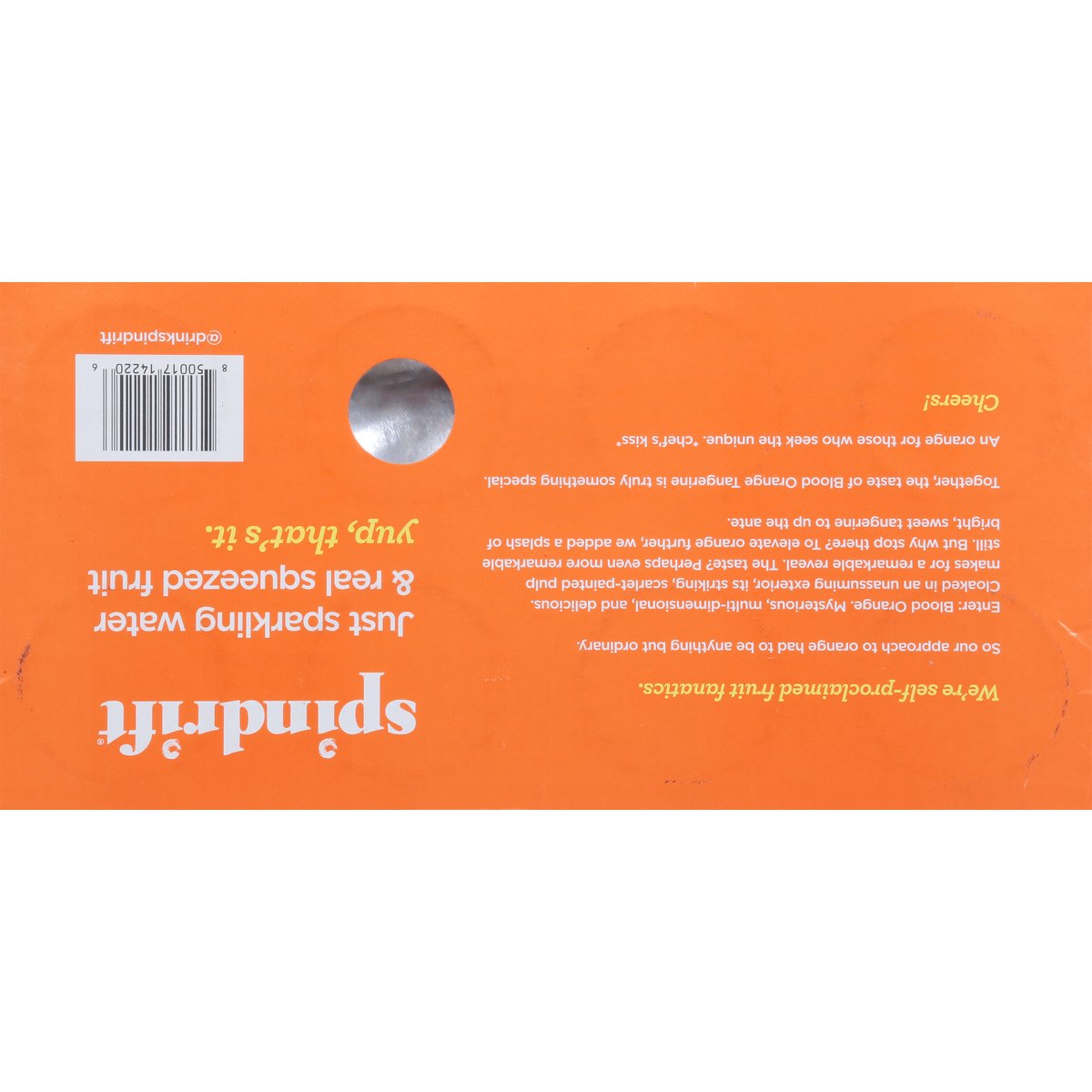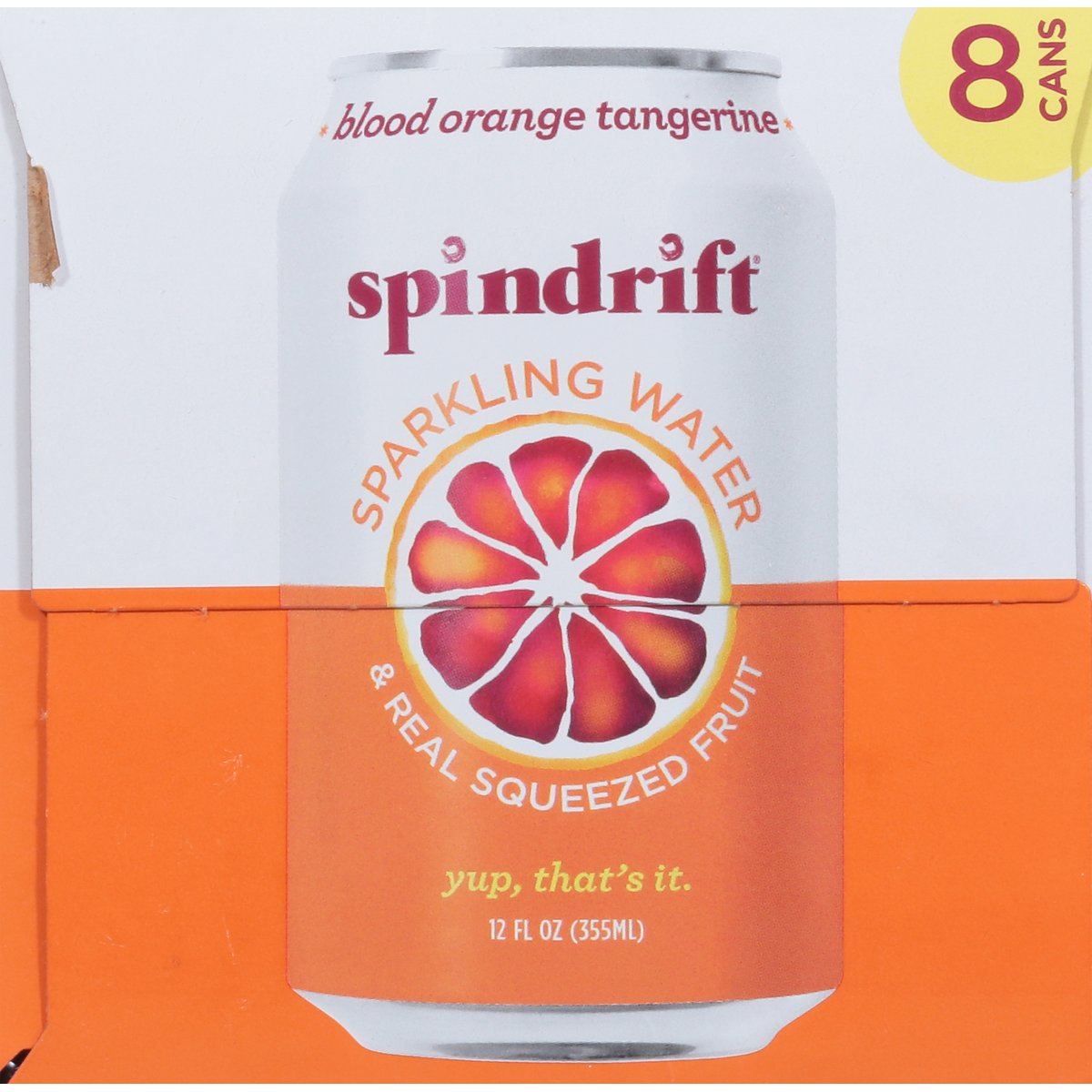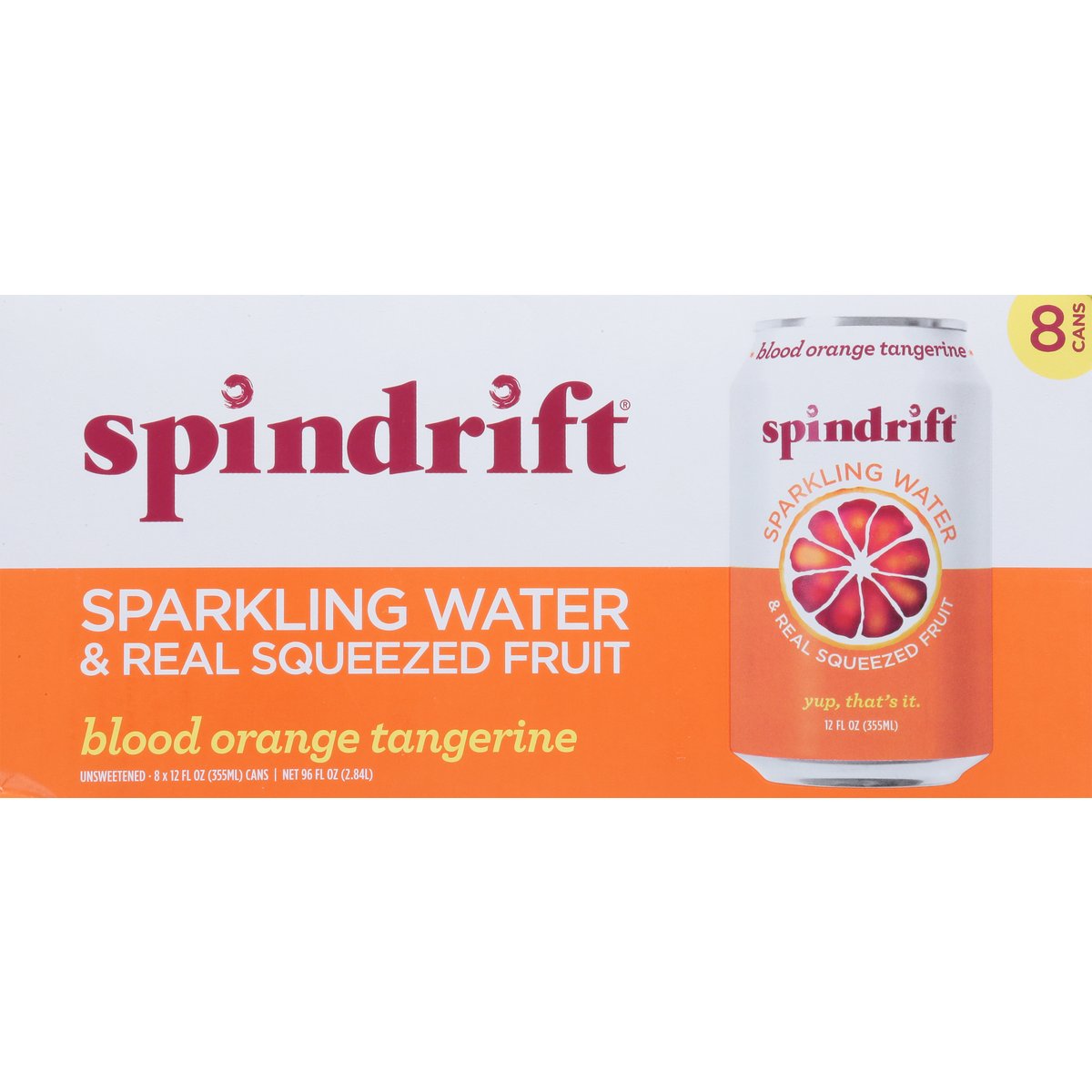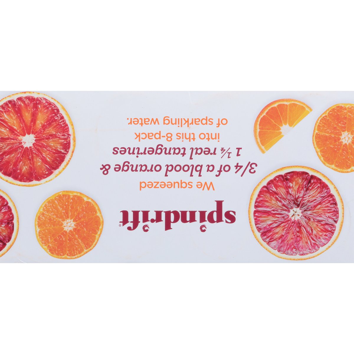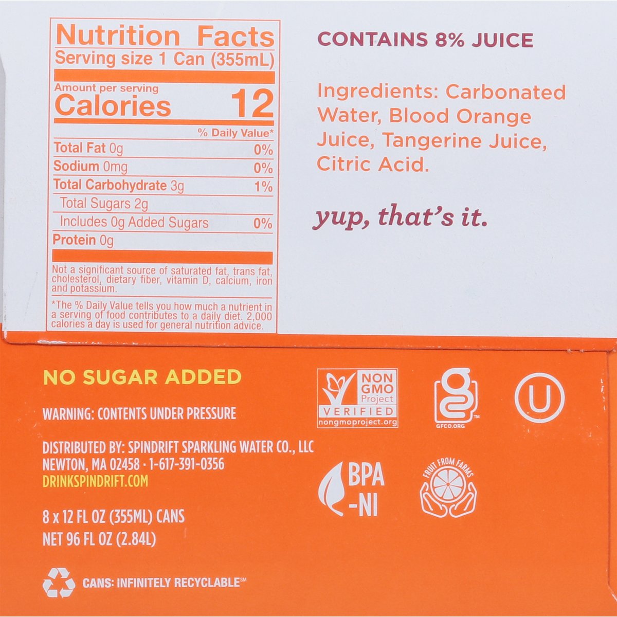 Certified gluten free. gfco.org. No sugar added. Non-GMO Project verified. nongmoproject.org. Yup, that's it. We squeezed 3/4 of a blood orange & 1-1/4 real tangerines into this 8-pack of sparkling water. Fruit from farms. We're self-proclaimed fruit fanatics. So our approach to orange had to be anything but ordinary. Enter: Blood orange. Mysterious, multi-dimensional, and delicious. Cloaked in an unassuming exterior, its striking, scarlet-painted pulp makes for a remarkable reveal. The taste? Perhaps even more remarkable still. But why stop there? To elevate orange further, we added a splash of bright, sweet tangerine to up the ante. Together, the taste of blood orange tangerine is truly something special. An orange for those who seek the unique. Chef's kiss. Cheers! Just sparkling water & real squeezed fruit. drinkspindrift.com. (at)drinkspindrift. BPA -ni. Cans: Infinitely recyclable.