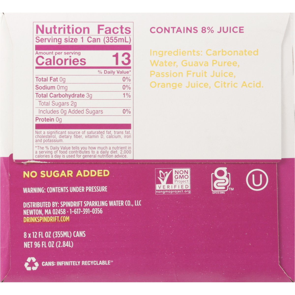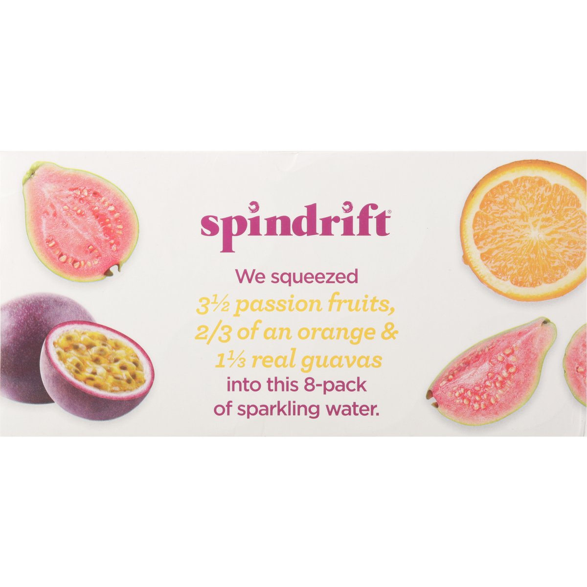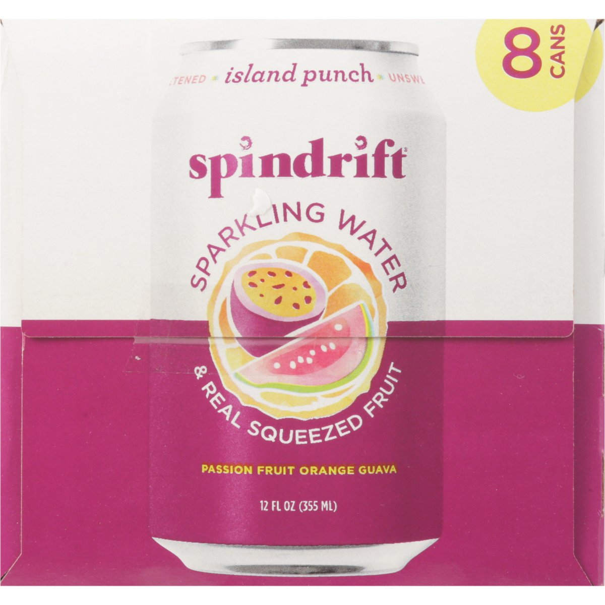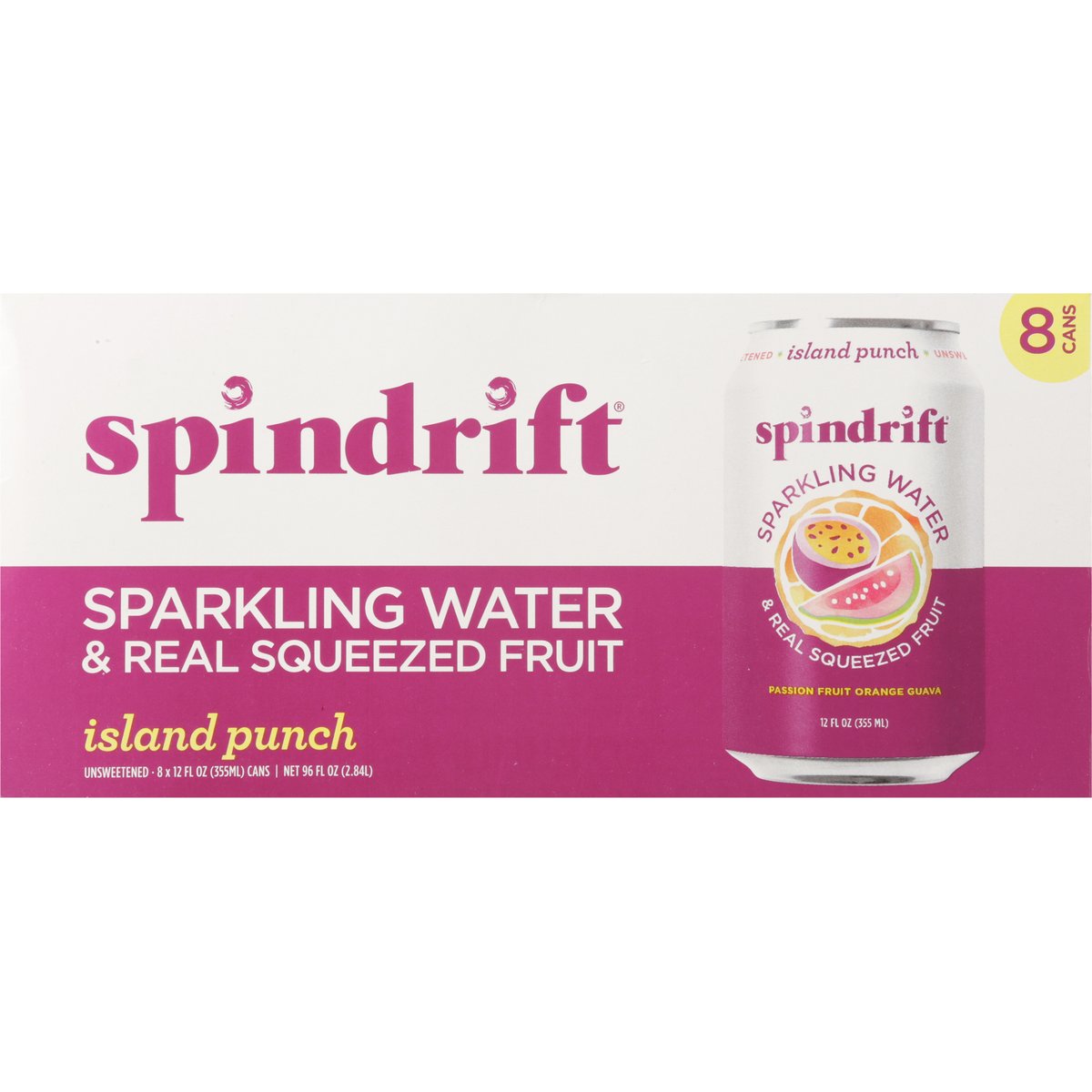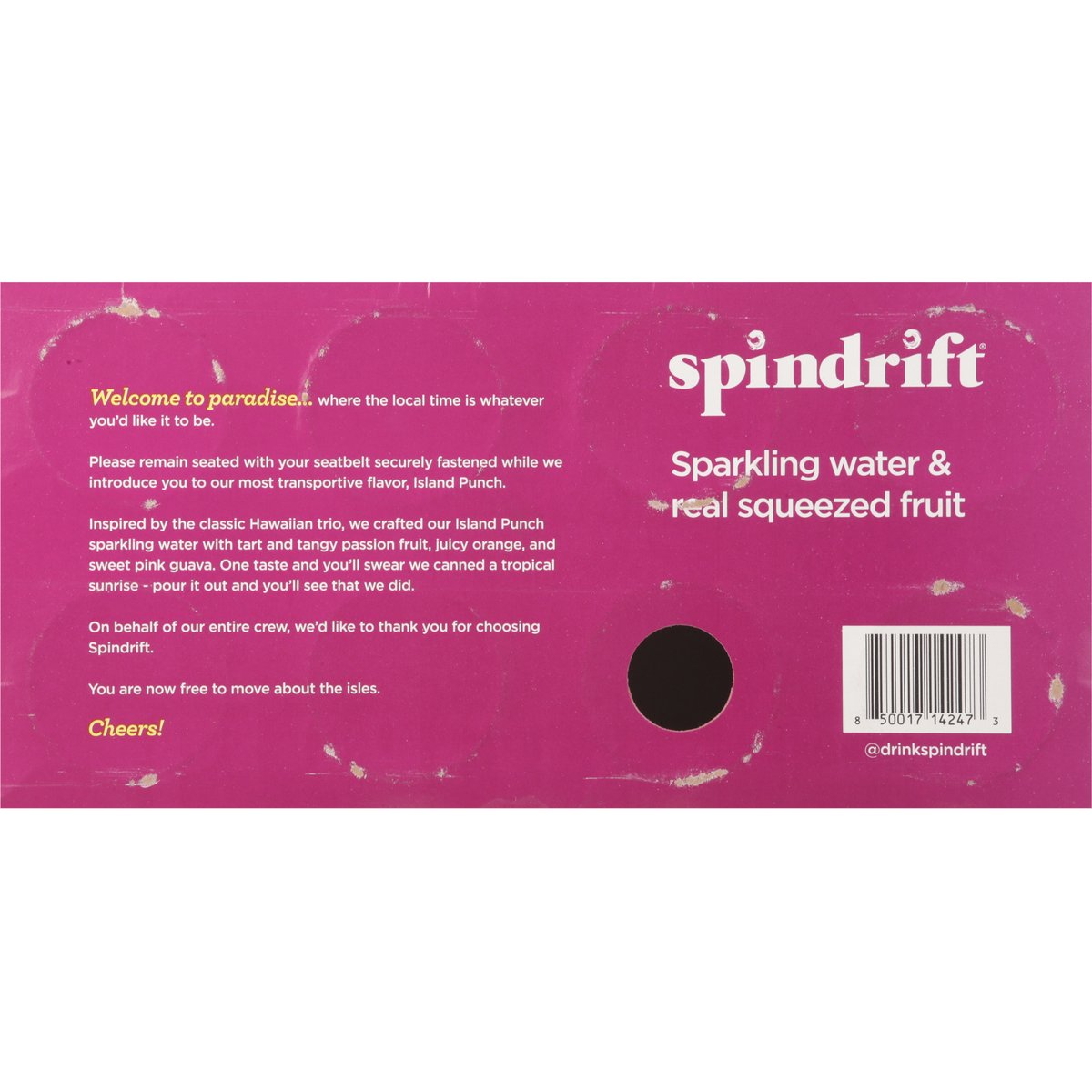 Sparkling water & real squeezed fruit. Certified gluten free. gfco.org. No sugar added. Non-GMO Project verified. nongmoproject.org. Unsweetened. We squeezed 3-1/2 passion fruits, 2/3 of an orange & 1-1/3 real guavas into this 8-pack of sparkling water. Welcome to paradise... where the local time is whatever you'd like it to be. Please remain seated with your seatbelt securely fastened while we introduce you to our most transportive flavor, Island Punch. Inspired by the classic Hawaiian trio, we crafted our Island Punch sparkling water with tart and tangy passion fruit, juicy orange, and sweet pink guava. One taste and you'll swear we canned a tropical sunrise - pour it out and you'll see that we did. On behalf of our entire crew, we'd like to thank you for choosing Spindrift. You are now free to move about the Isles. Cheers! drinkspindrift.com. @drinkspindrift. 1-617-391-0356. Cans: Infinitely recyclable.