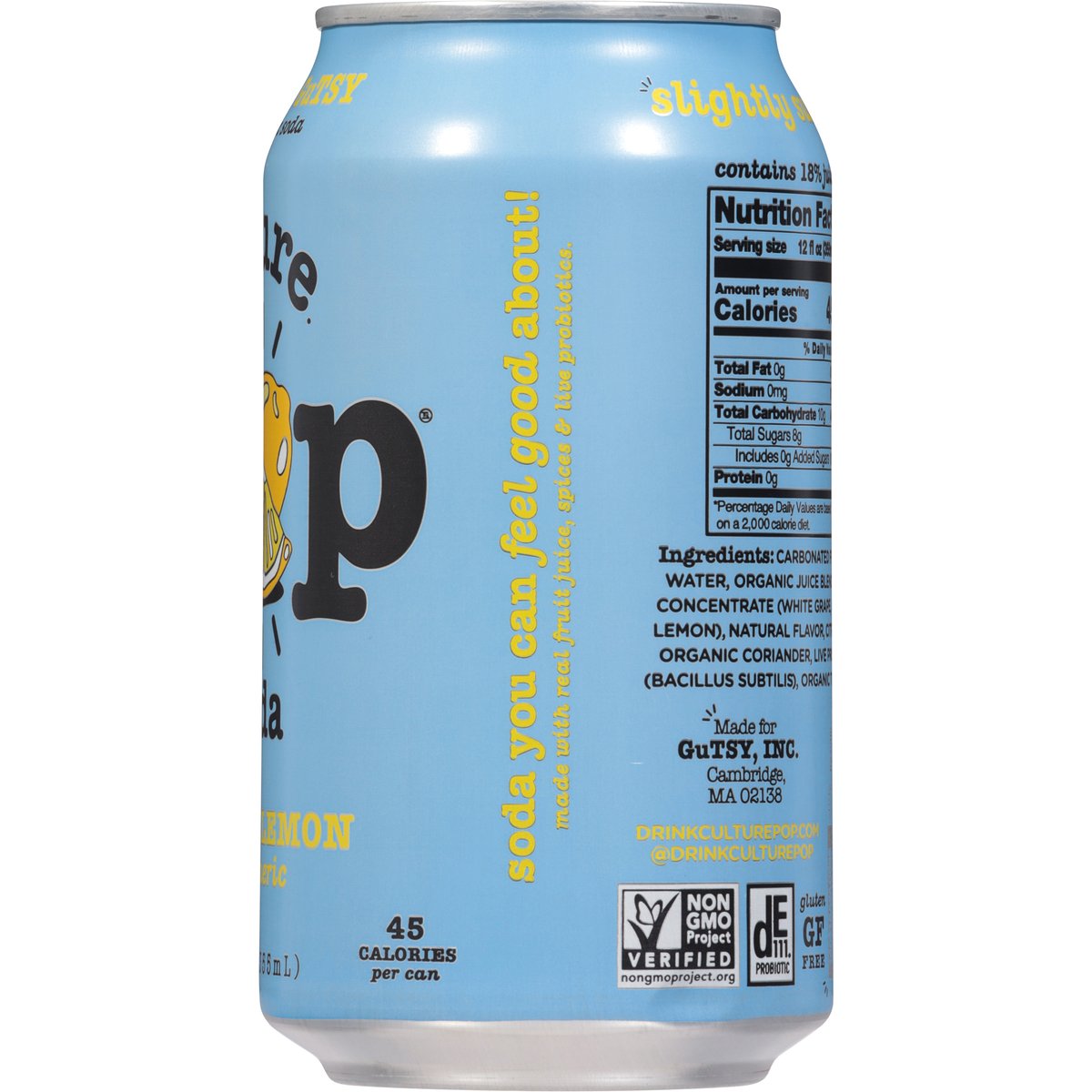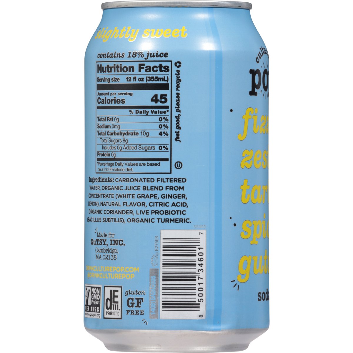 45 calories per can. Vegan. Gluten free. Non-GMO Project verified. nongmoproject.org. Fizzy & gusty probiotic soda. Slightly sweet. Fizzy, zesty, tarty, spicy, gutsy. Soda you can feel good about! drinkculturepop.com. nongmoproject.org. @)Drinkculturepop. Feel good, always recycle.