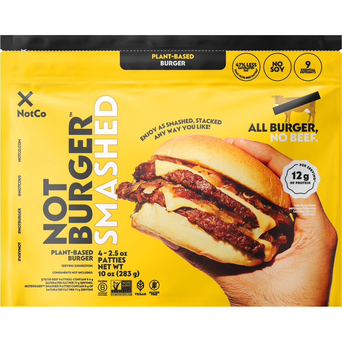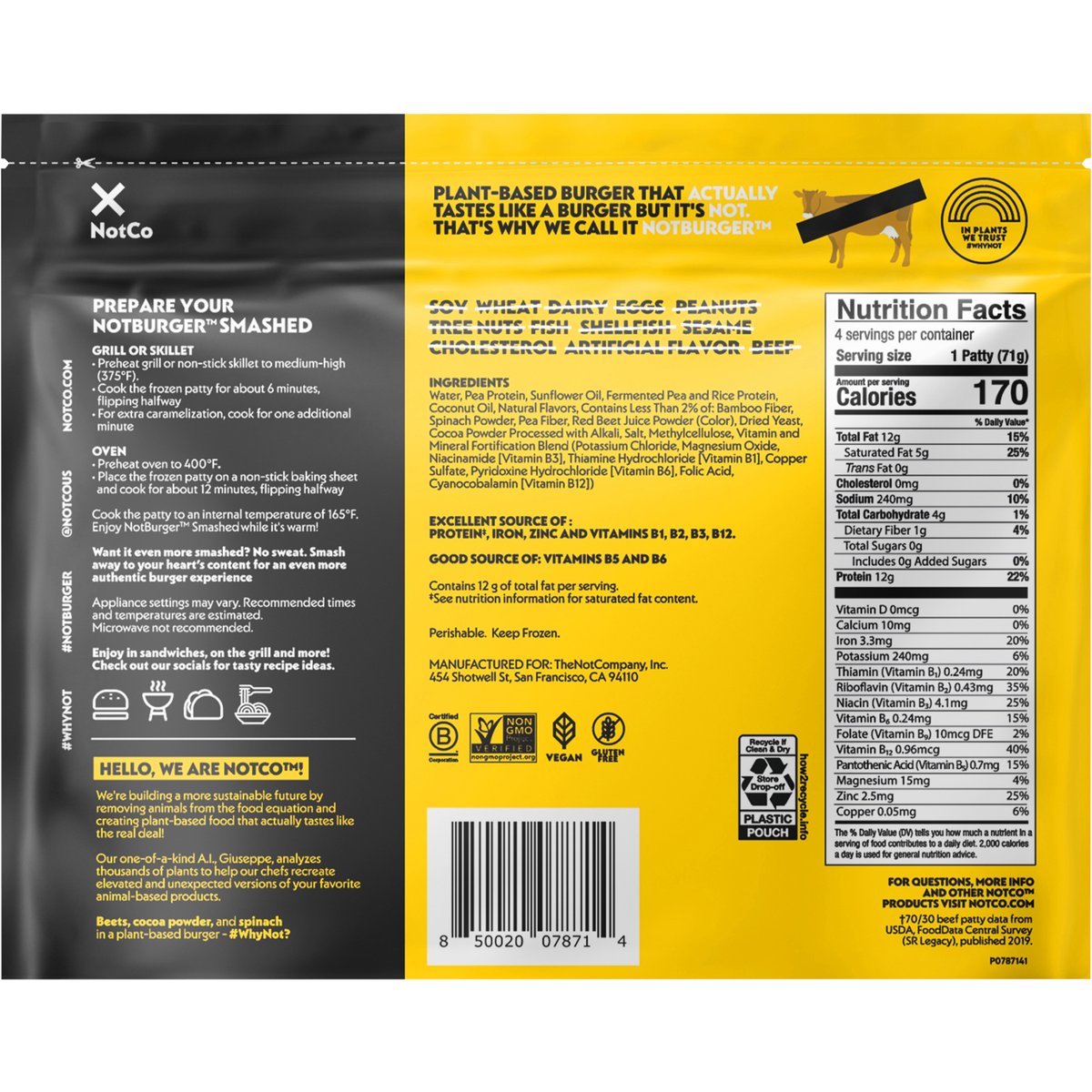 No artificial flavors. Per serving(c): 12 g of protein. Contains 12 g of total fat per serving. (c) See nutrition information for saturated fat content. Vegan. Gluten free. 47% Less saturated fat than 70/30 beef patties (a). (a) 70/30 beef patties: Contains 9.4 g saturated fat per 71g serving. No soy. 12g of protein per serving (a). (a) See nutrition information for saturated fat content. Excellent source of protein (a). iron, zinc and vitamin B1, B2, B3, B12. (a) See nutrition information for saturated fat content. Good source of: Vitamins B5 and B6. No wheat; No dairy; No eggs; No peanuts; No tree nuts; No fish; No shellfish; No sesame; No cholesterol; No beef. Non-GMO Project verified. nongmoproject.org. Enjoy as smashed, stacked any way you like! All burger, no beef! Plant-based burger that actually tastes like a burger but it's not. That's why we call it NotBurger. how2recycle.info. Notco.com. #whynot. #notburger. @notcous. notco.com. For questions, more info and other notco products visit Notco.com. Certified B Corporation. In plant we trust #whynot. Hello, we are Notco! We're building a more sustainable future by removing animals from the food equation and creating plant-based food that actually tastes like the real deal! Our one-of-a-kind A.I., Giuseppe, analyzes thousands of plants to help our chefs recreate elevated and unexpected versions of your favorite animal-based products. Peach, corn and bamboo in plant-based chicken - #why not?