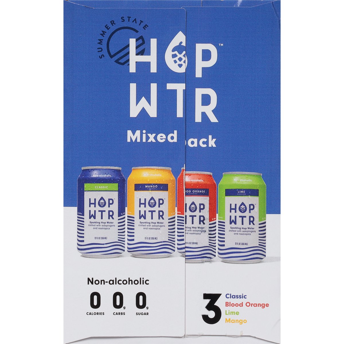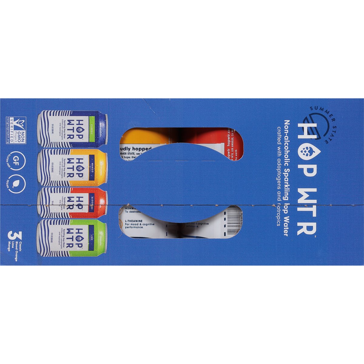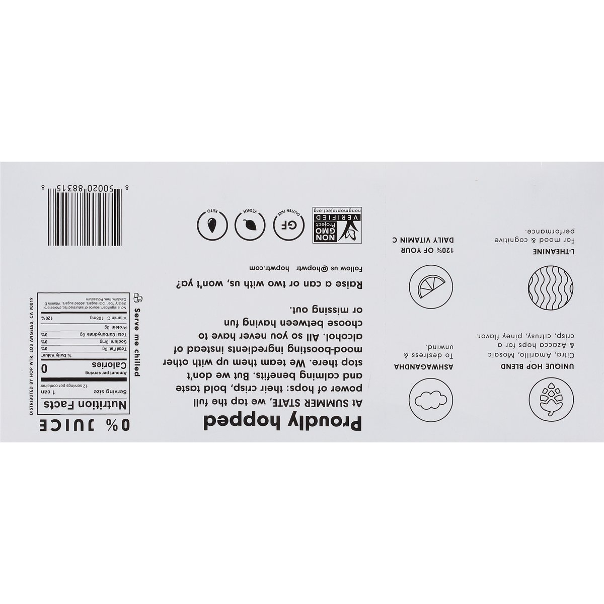 Non-alcoholic sparkling hop water crafted with adaptogens and nootropics. 0 calories; 0 g carbs; 0 g sugars. 120% of your daily Vitamin C. Vegan. Gluten free. Keto. Non-GMO Project verified. nongmoproject.org. 3 Classic, blood orange, lime, mango. Summer state. Thirsty? Unique Hop Blend: Citra, Amarillo, Mosaic & Azacca Hops: For a refreshingly crisp, citrusy, piney flavor. Ashwagandha: To destress & unwind. L-Theanine: For mood & cognitive performance. Proudly hopped. At summer state, we tap the full power of hops: their crisp, bold taste and calming benefits. But we don't stop there. We team them up with other mood-boosting ingredients instead of alcohol. All so you never have to choose between having fun or missing out. Raise a can or two with us, Won't ya? hopwtr.com. Follow us (at)hopwtr.
