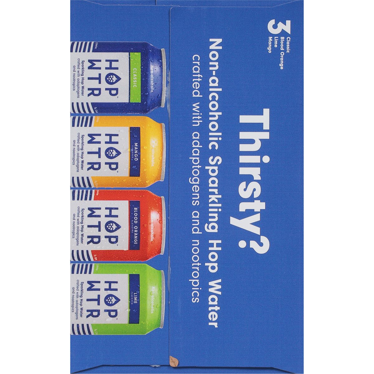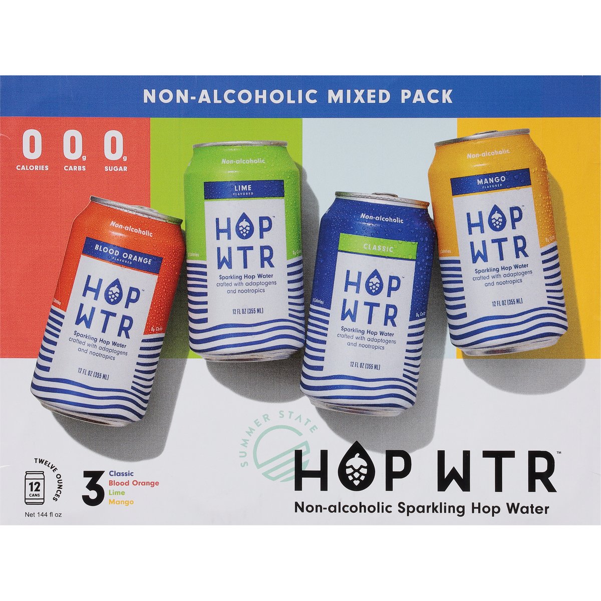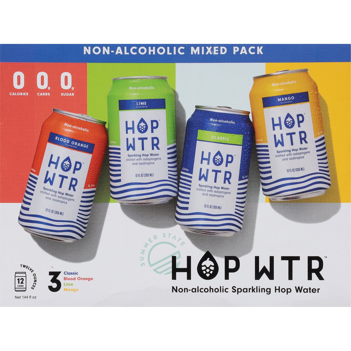 Non-alcoholic sparkling hop water crafted with adaptogens and nootropics. 0 calories; 0 g carbs; 0 g sugars. 120% of your daily Vitamin C. Vegan. Gluten free. Keto. Non-GMO Project verified. nongmoproject.org. 3 Classic, blood orange, lime, mango. Summer state. Thirsty? Unique Hop Blend: Citra, Amarillo, Mosaic & Azacca Hops: For a refreshingly crisp, citrusy, piney flavor. Ashwagandha: To destress & unwind. L-Theanine: For mood & cognitive performance. Proudly hopped. At summer state, we tap the full power of hops: their crisp, bold taste and calming benefits. But we don't stop there. We team them up with other mood-boosting ingredients instead of alcohol. All so you never have to choose between having fun or missing out. Raise a can or two with us, Won't ya? hopwtr.com. Follow us (at)hopwtr.