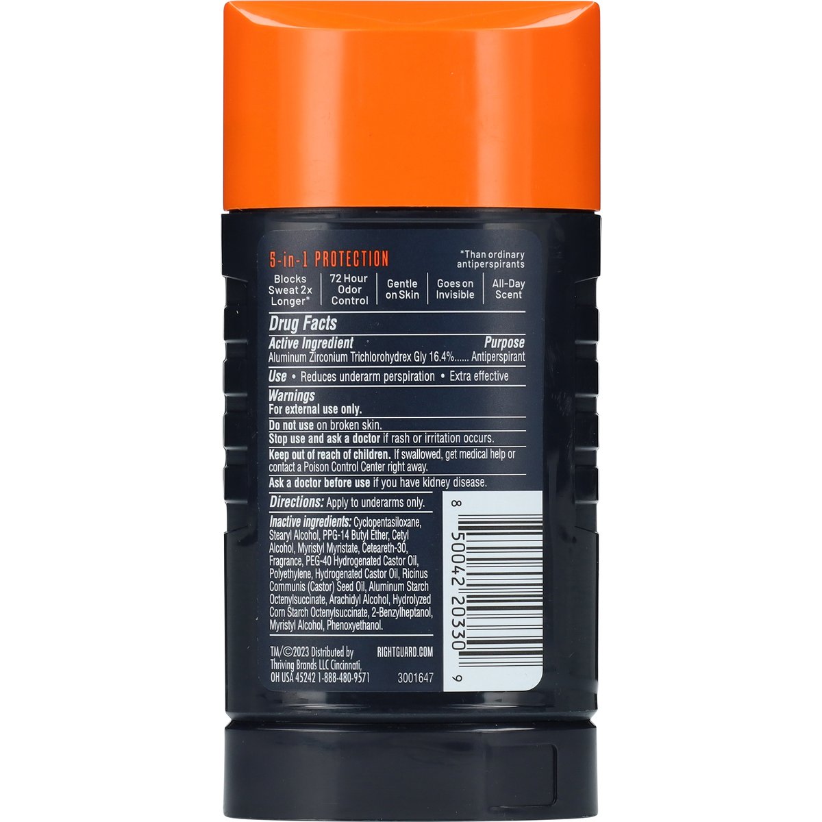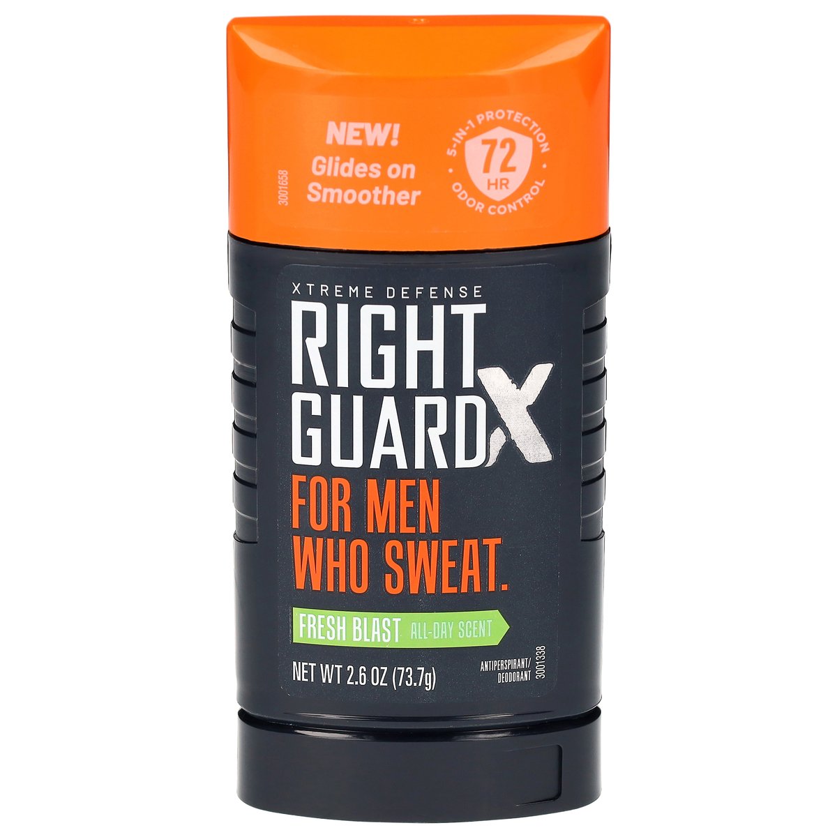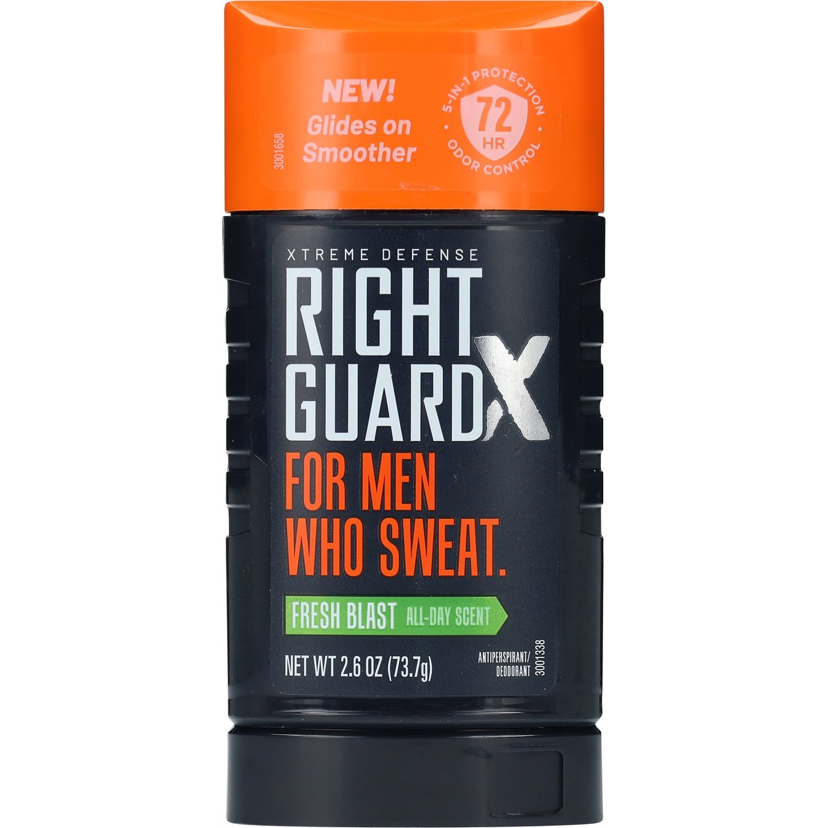 72 hr 5-in-1 protection odor control. New! Glides on smoother. Xtreme defense. For men who sweat. Blocks sweat 2x longer*. 72 hour odor control. Gentle on skin. Goes on invisible. All-day scent. * Than ordinary antiperspirants. rightguard.com.