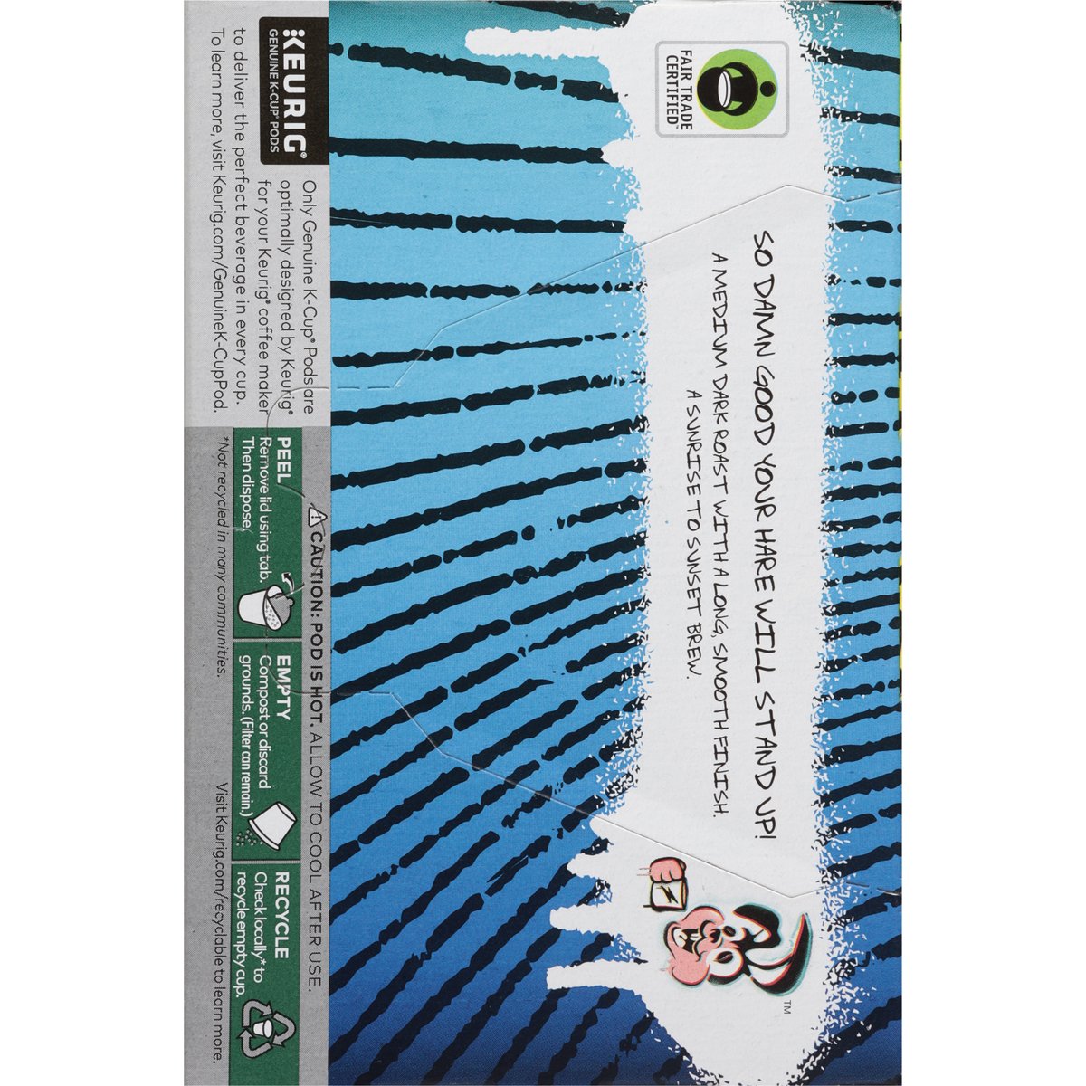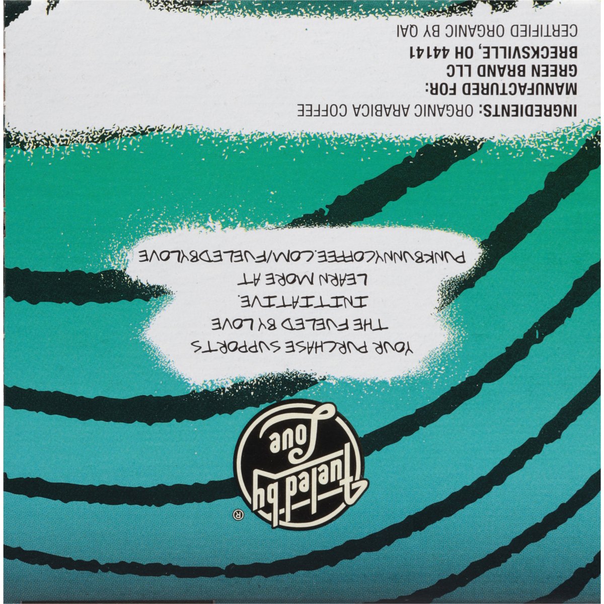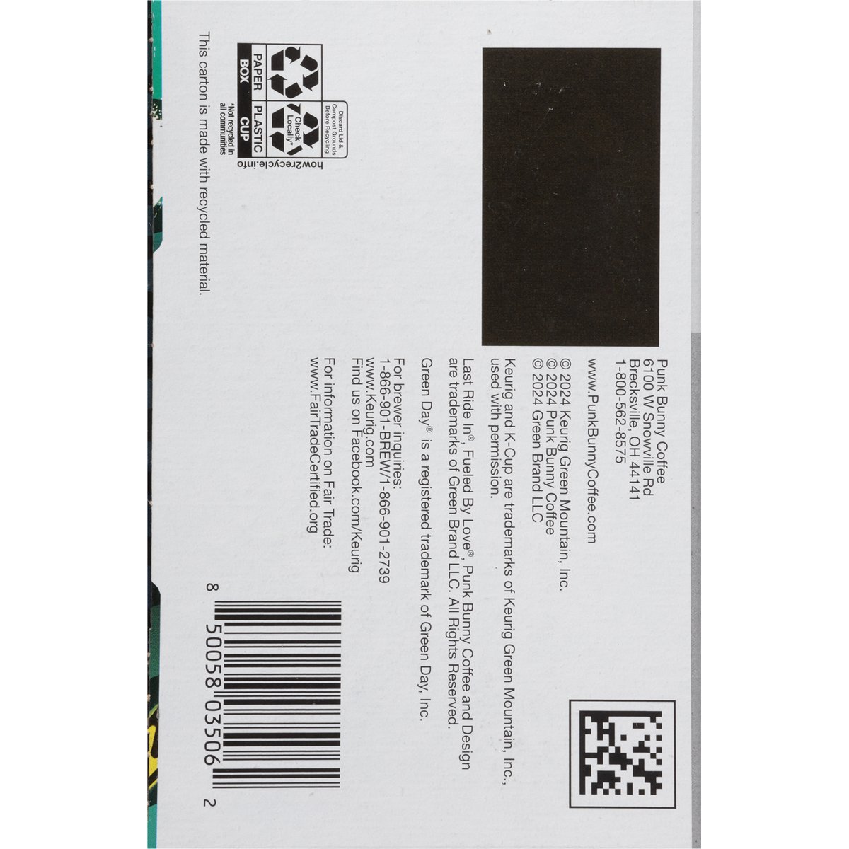 USDA Organic. Certified Organic by QAI. Genuine K-Cup pods. Your purchase supports the fueled by love intiative. So Damn good your hare will stand up! A medium dark roast with a long, smooth finish. A sunrise to sunset brew. Genuine K-cup pods. Only Genuine K-cup pods are optimally designed by Keurig for your Keurig Coffee maker to deliver the perfect beverage in every cup. www.punkbunnycoffee.com. punkbunnycoffee.com/fueledbylove. Keurig.com/GenuineK-CupPod. Find us on Facebook.com/Keurig. Learn more at punkbunnycoffee.com/fueledbylove. 1-800-562-8575. For brewer inquiries: 1-866-901-Brew/1-866-901-2739. www.Keurig.com. To learn more, visit Keurig.com/GenuineK-CupPod. Visit Keurig.com/recyclable to learn more. This carton is made with recycled material. Fair Trade certified. For information on Fair Trade: www.FairTradeCertified.org. Easy-peel. Recyclable K-cup pods. Peel: Remove lid using tab. Then dispose. Empty: Compost or discard grounds. (Filter can remain). Recycle: Check locally* to recycle empty cup.* Check locally - Not recycled in many communities. * Not recycled in many communities.