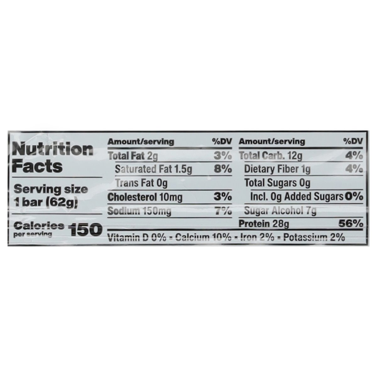 Chocolate chip cookie dough flavored bar. 28 g protein. 150 calories. 0 g sugar. Gluten free. 75% CFP = Calories from protein | Total calories. PDCAAS = 1.0. davidprotein.com.