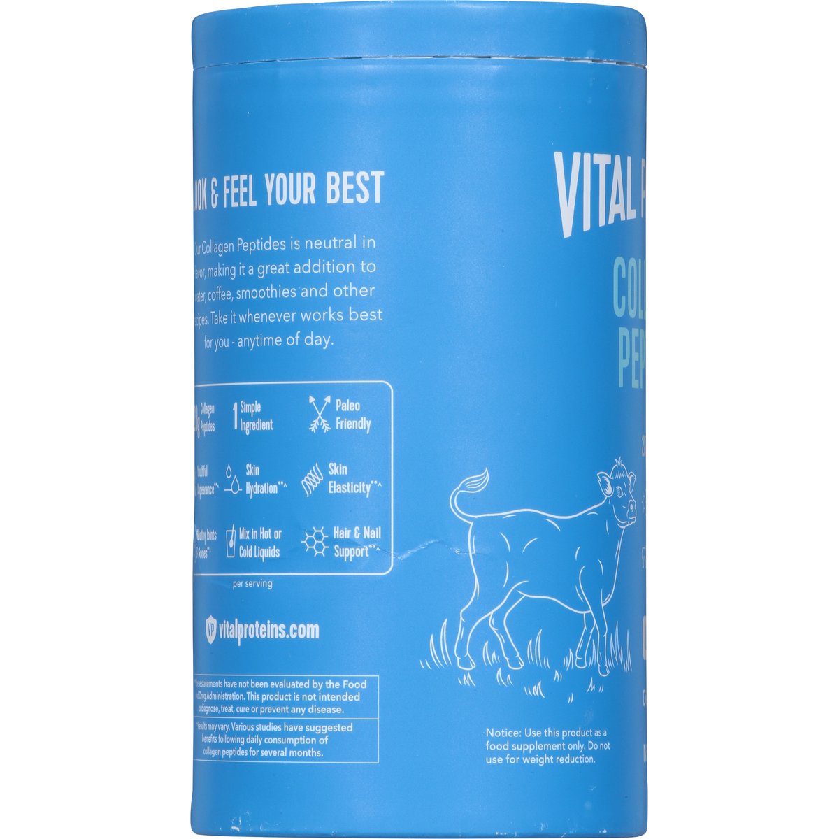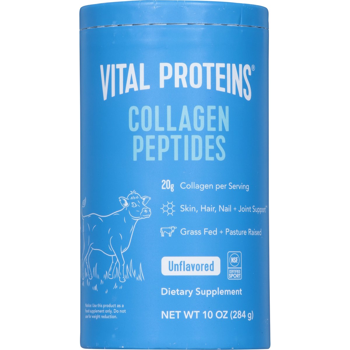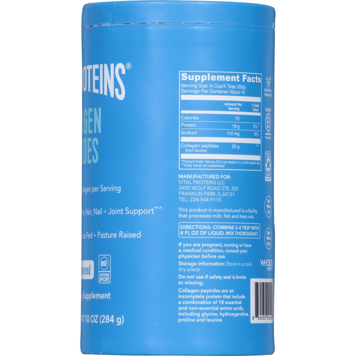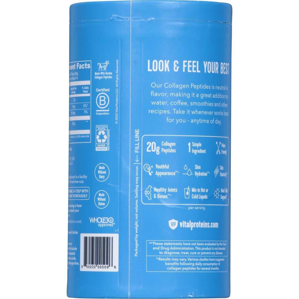 Dietary Supplement. 20 g collagen per serving. Made without gluten. Paleo friendly. Skin, hair, nail + joint support. Grass fed + pasture raised. The same collagen you love, without the plastic. Made without dairy. Packaged by weight, not volume. Settling may occur. Fill line. Look & feel your best. Our collagen peptides is neutral in flavor, making it a great addition to water, coffee, smoothies and other recipes. Take it whenever works best for you - anytime of day. 1 simple ingredient. Youthful appearance (Results may vary. Various studies have suggested benefits following daily consumption of collagen peptides for several months). Skin hydration (Results may vary. Various studies have suggested benefits following daily consumption of collagen peptides for several months). Skin elasticity (Results may vary. Various studies have suggested benefits following daily consumption of collagen peptides for several months). Healthy joints & bones (Results may vary. Various studies have suggested benefits following daily consumption of collagen peptides for several months). Hair and nail support (Results may vary. Various studies have suggested benefits following daily consumption of collagen peptides for several months). Collagen peptides are an incomplete protein that include a combination of 18 essential and non-essential amino acids, including glycine, hydroxyproline-proline and leucine. Whole 30 Approved. NSF: Contents certified. vitalproteins.com. Tel: 224-544-9110. Certified B Corporation. (These statements have not been evaluated by the Food and Drug Administration. This product is not intended to diagnose, treat, cure, or prevent any disease.)
