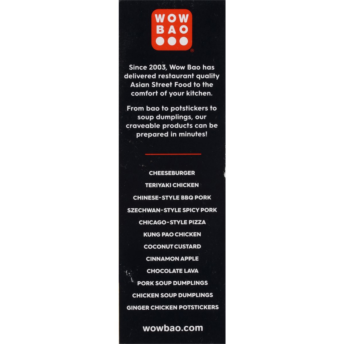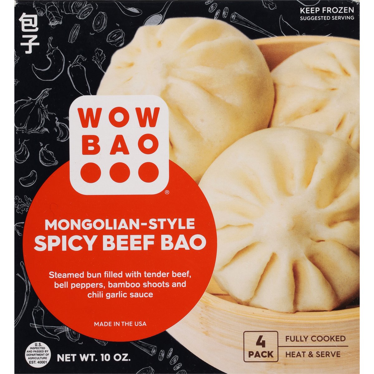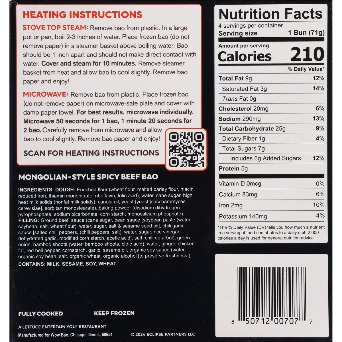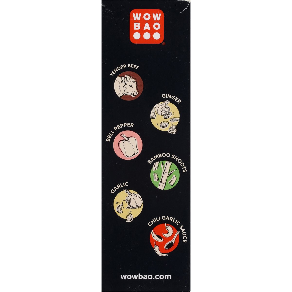Steamed bun filled with tender beef, bell peppers, bamboo shoots and chili garlic sauce. Fully cooked. Tender beef. Ginger. Bell pepper. Bamboo shoots. Garlic. Chili garlic sauce. Since 2003, Wow Bao has delivered restaurant quality Asian Street Food to the comfort of your kitchen. From bao to potstickers to soup dumplings, our craveable products can be prepared in minutes! U.S. inspected and passed by Department of Agriculture. wowbao.com. Scan for heating instructions. Cheeseburger, Teriyaki Chicken, Chinese-style Bbq Pork, Szechwan-style Spicy Pork, Chicago-style Pizza, Kung Pao Chicken, Coconut Custard, Cinnamon Apple, Chocolate Lava, Pork Soup Dumplings, Chicken Soup Dumplings, Ginger Chicken Potstickers. Made in the USA.