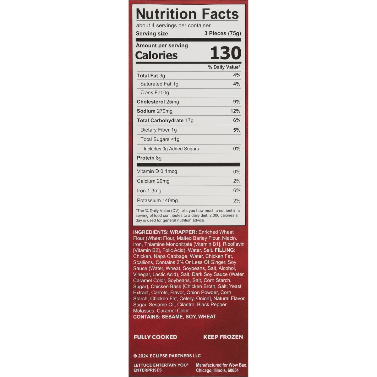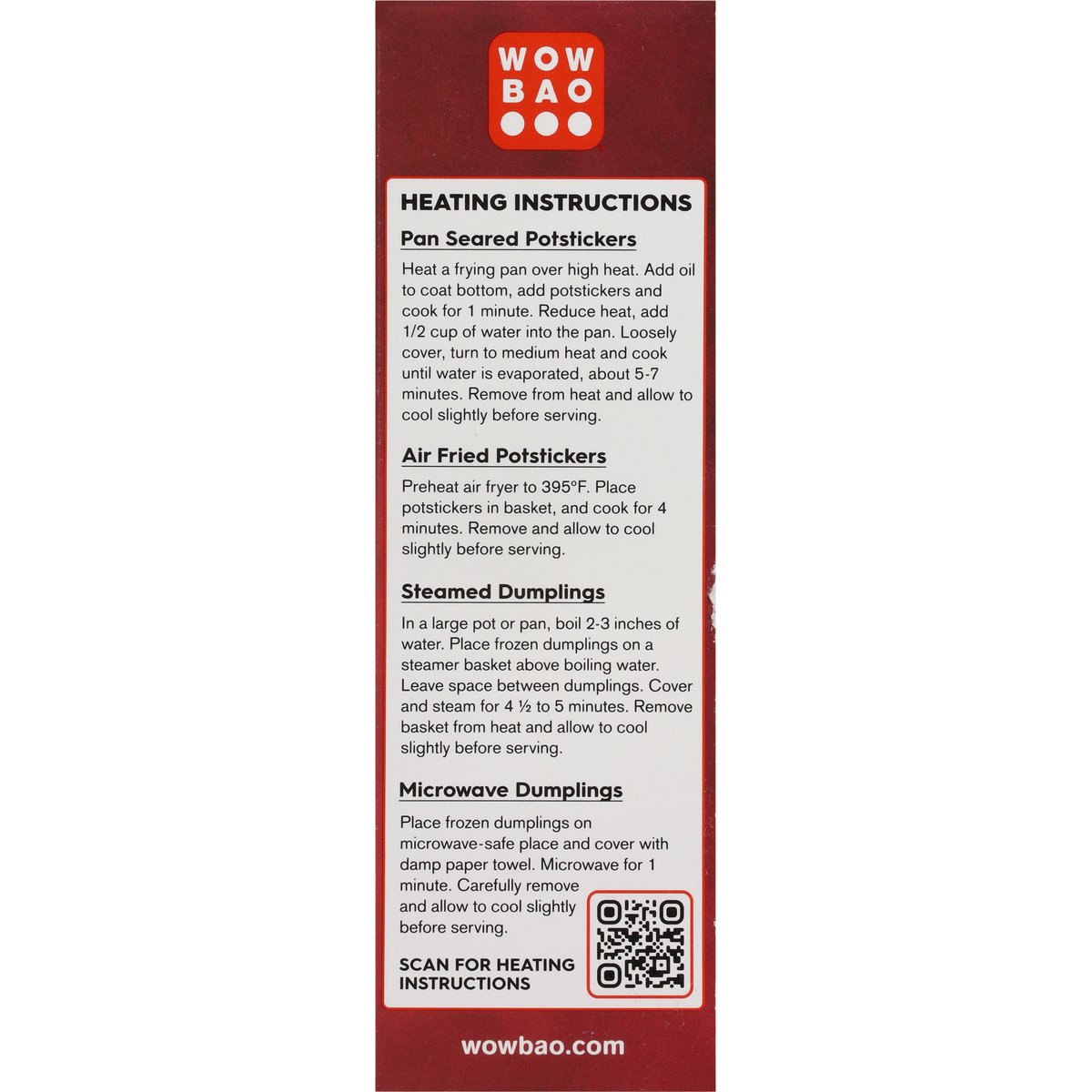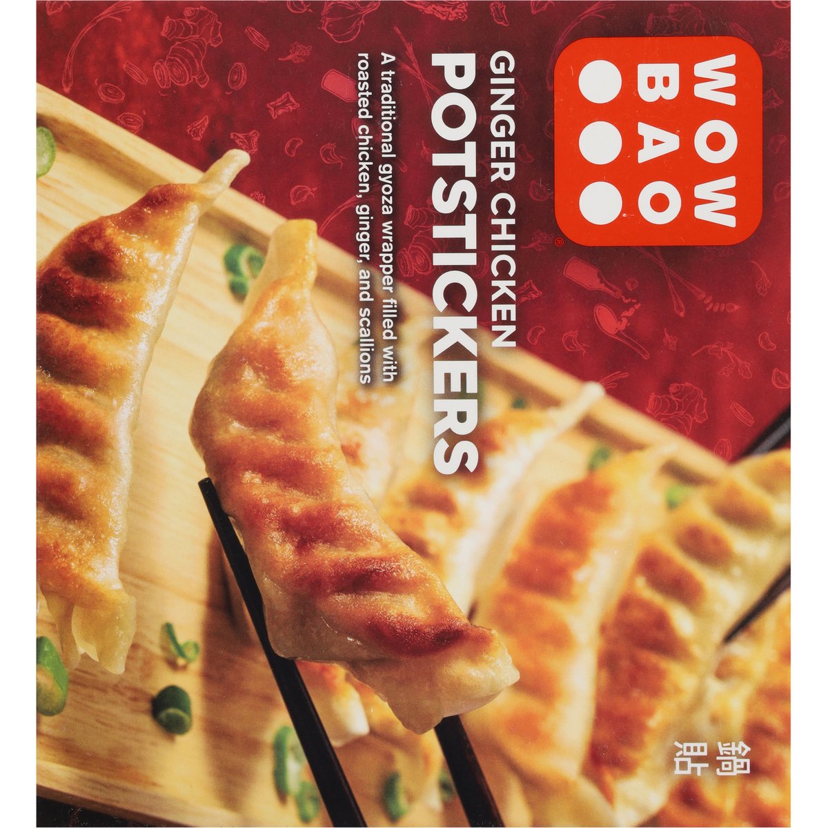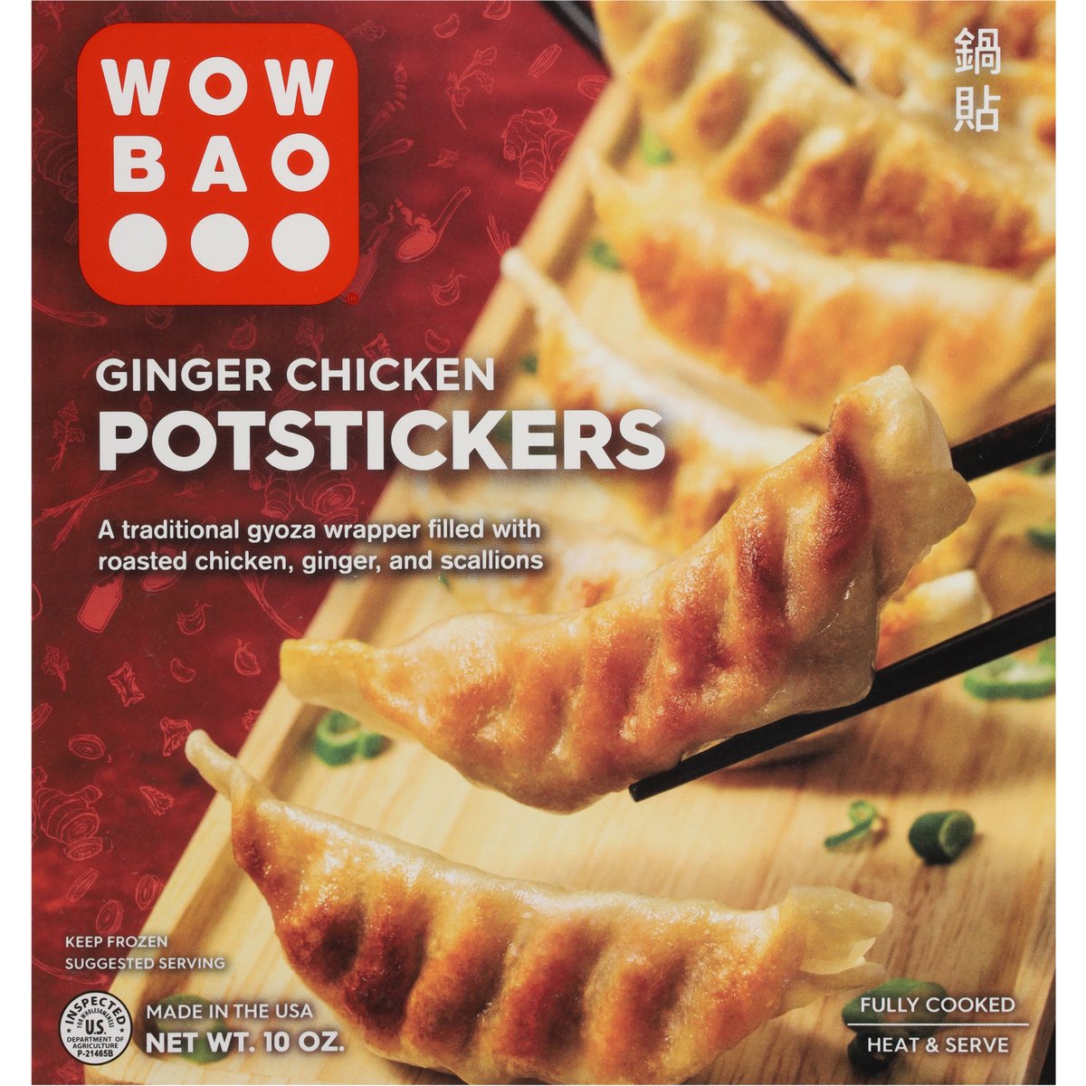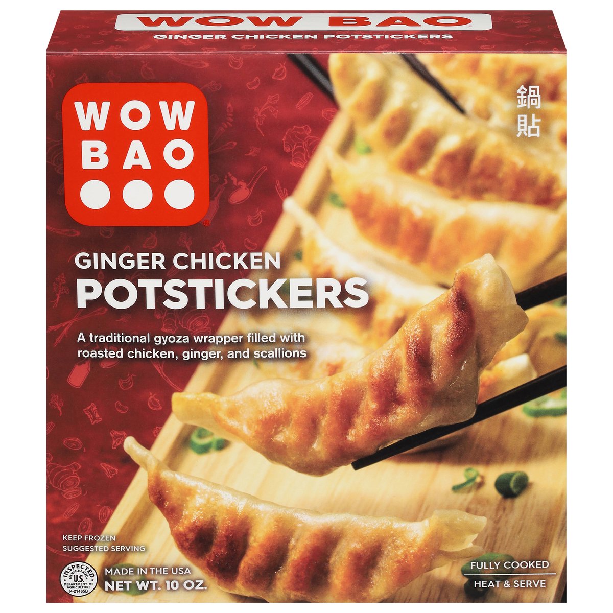 A traditional gyoza wrapper filled with roasted chicken, ginger, and scallions. Wow bao. Fully cooked. Heat & serve. Inspected for wholesomeness by U.S. Department of Agriculture. wowbao.com. Scan for heating instructions. Made in the USA.