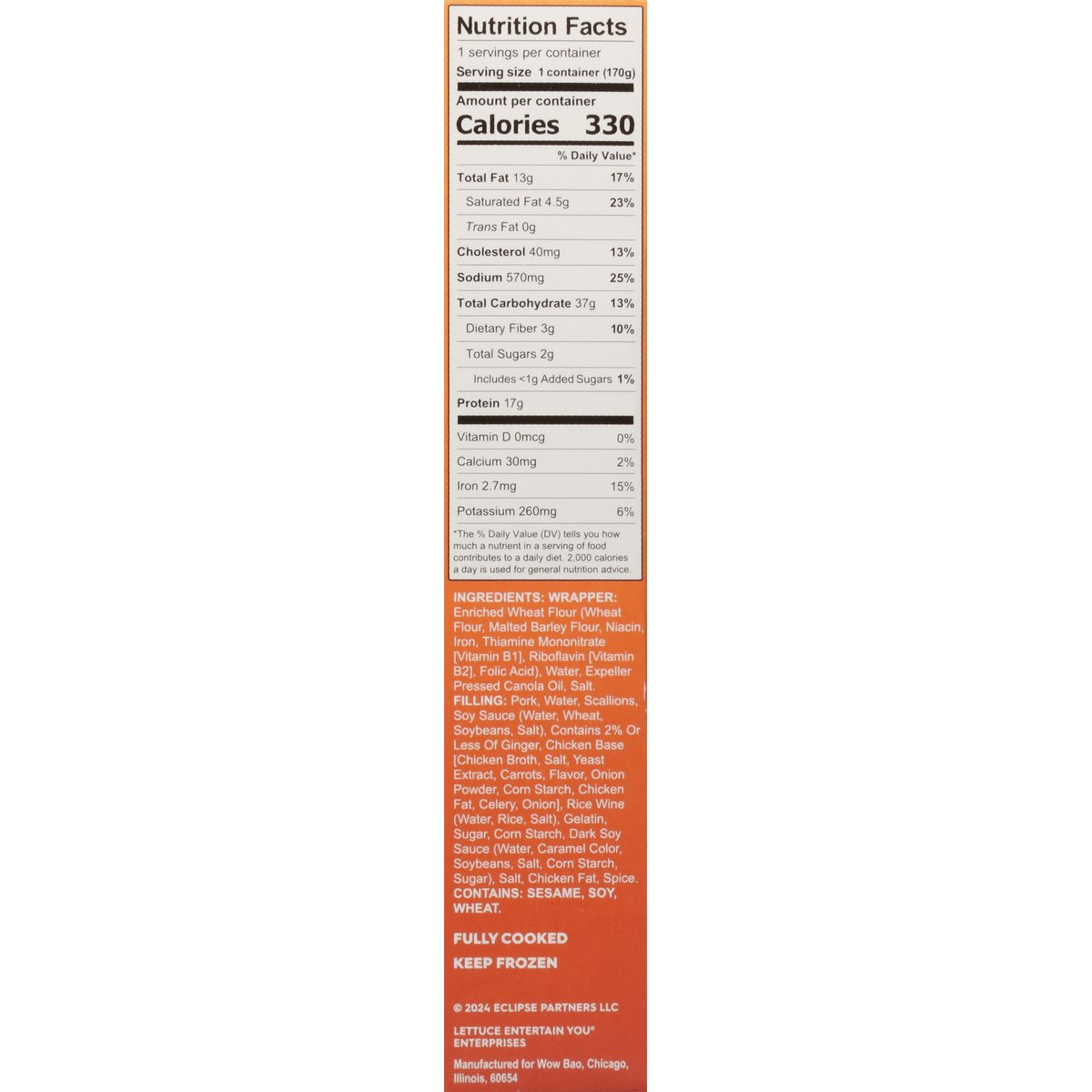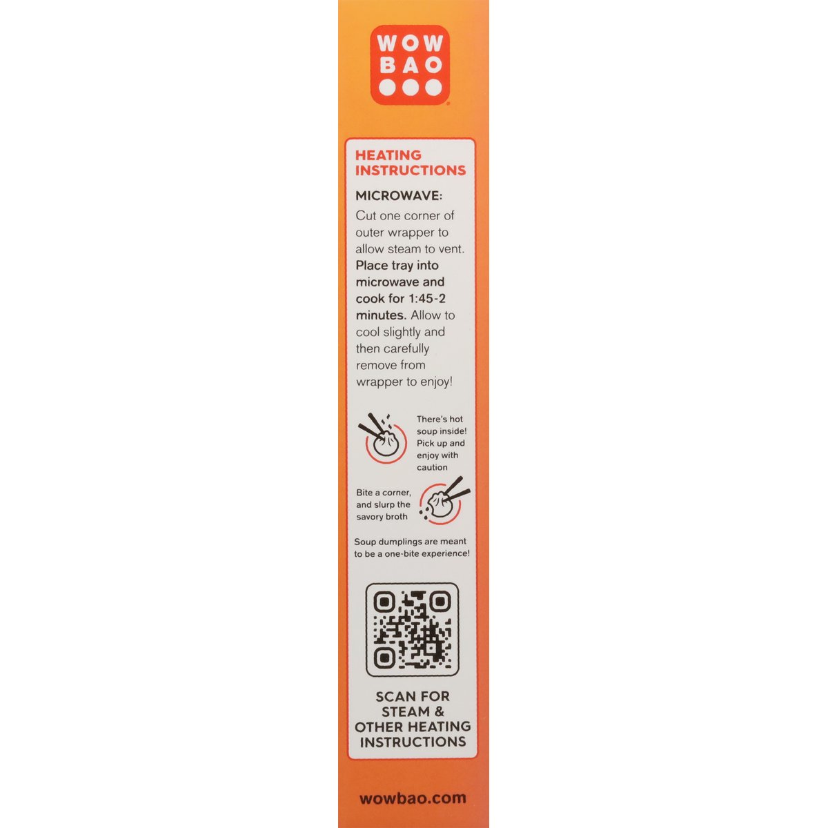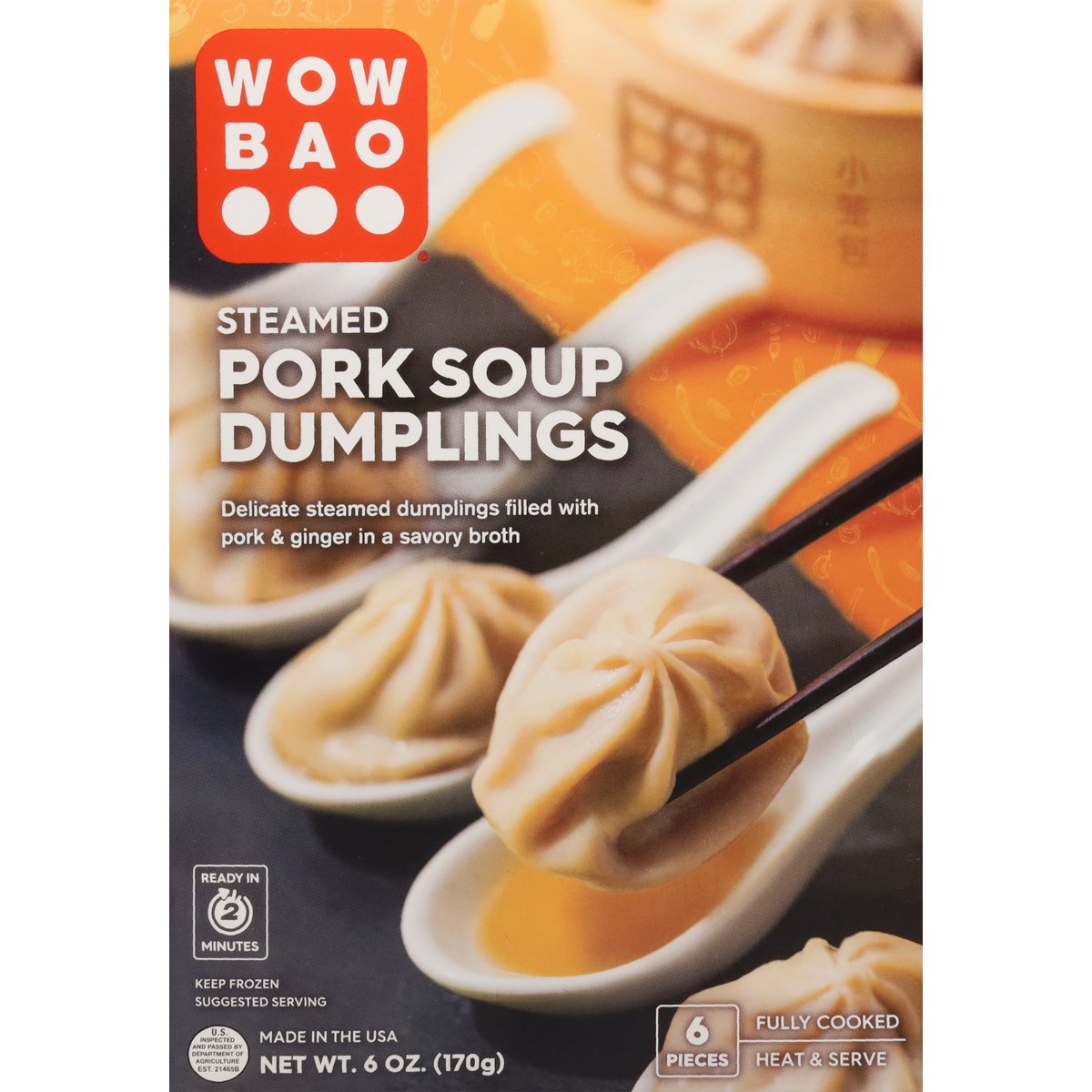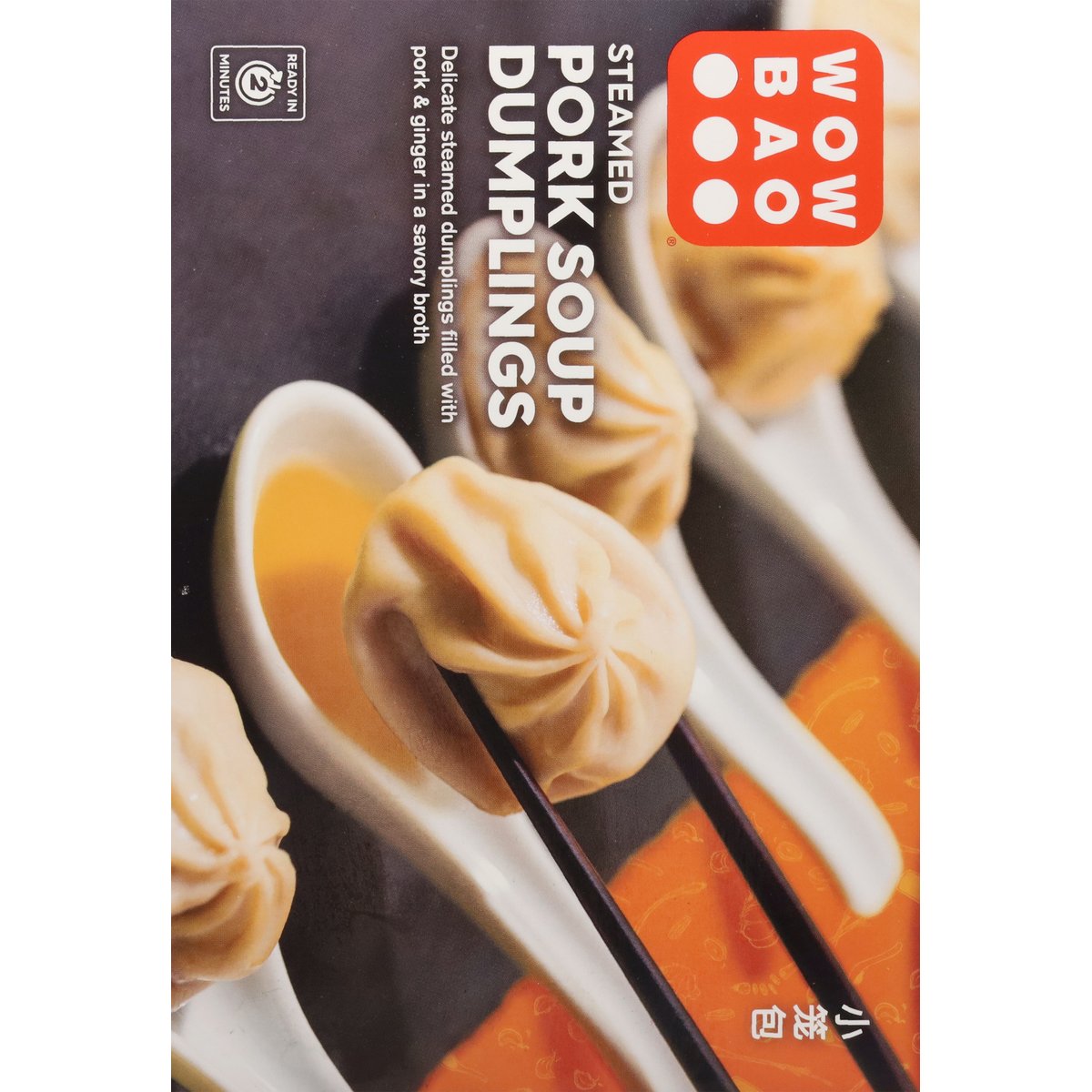 Delicate steamed dumplings filled with pork & ginger in a savory broth. Ready in 2 minutes. Heat & serve. Fully cooked. Xiao Long Bao, or soup dumplings, are the perfect package of pork and broth infused with scallions, garlic and ginger inside a delicate wrapper. Enjoy the savory flavor combination in one bite. Wow Bao delivers restaurant quality Asian Street Food to the comfort of your kitchen. From bao to potstickers to soup dumplings, our craveable products can be prepared in minutes for a tasty meal or snack. U.S. inspected and passed by Department of Agriculture. wowbao.com. Scan for steam & other heating instructions Made in the USA.