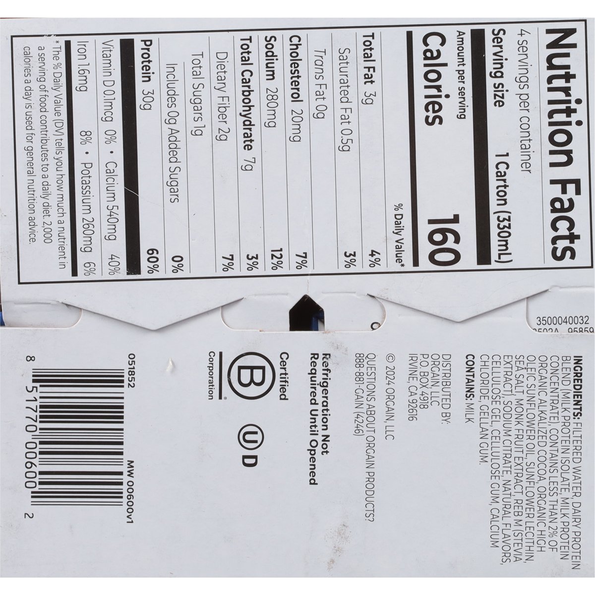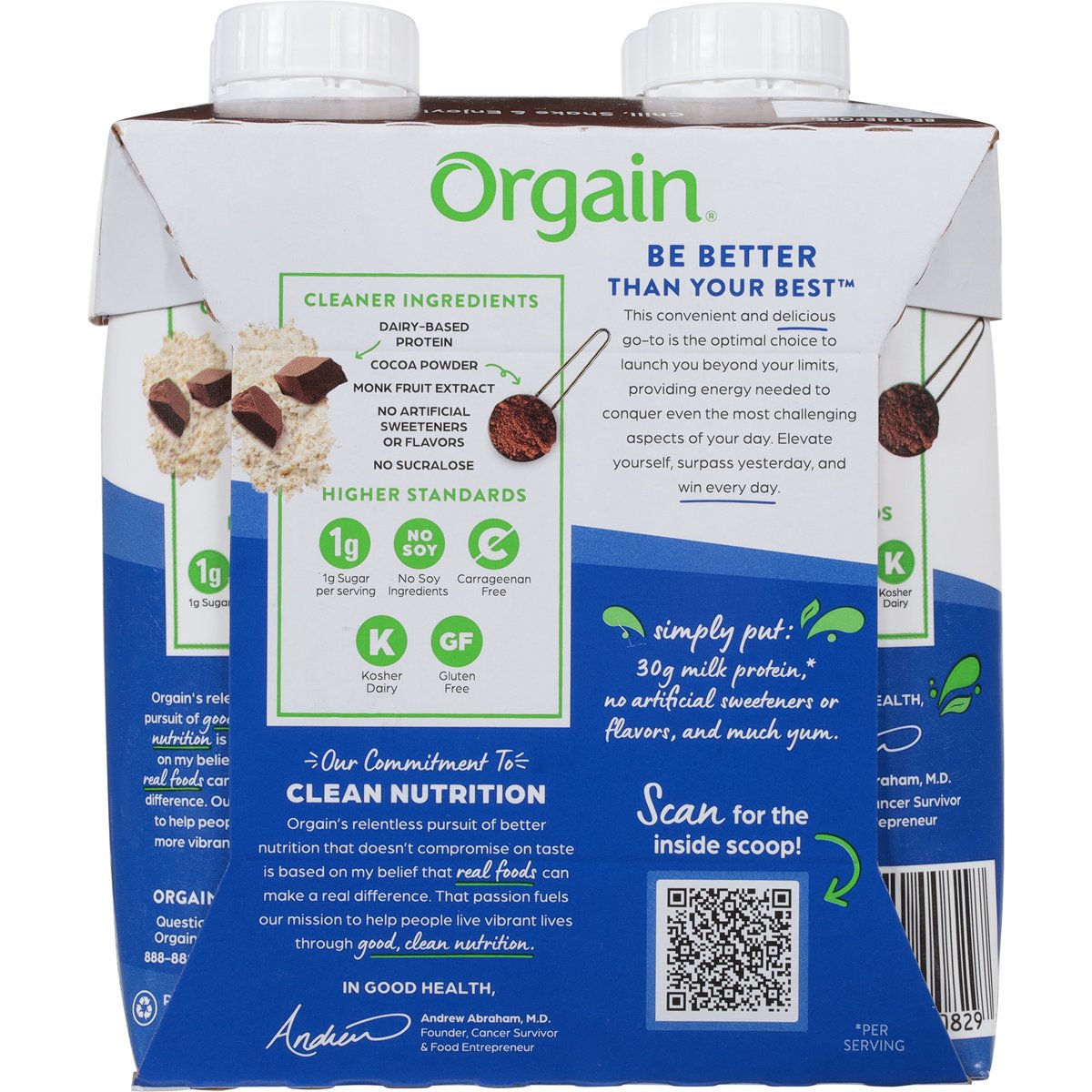 No artificial sweeteners or flavors. 30 g protein* shake. 160 calories*. 1 g sugar*. 1 g sugar per serving. * per serving. Gluten free. No soy ingredients. Be Better Than Your Best: This convenient and delicious go-to is the optimal choice to launch you beyond your limits, providing energy needed to conquer even the most challenging aspects of your day. Elevate yourself, surpass yesterday, and win every day. Simply put: 30 g milk protein*, no artificial sweeteners or flavors, and much yum. Cleaner Ingredients: Dairy-based protein; cocoa powder; monk fruit extract; no artificial sweeteners or flavors; no sucralose. Higher standards. Carrageenan free. Our commitment to clean nutrition Orgain’s relentless pursuit of better nutrition that doesn't compromise on taste is based on my belief that real foods can make a real difference. That passion fuels our mission to help people live vibrant lives through good, clean nutrition. In good health, - Andrew Abraham, M.D. Founder, Cancer Survivor & Food Entrepreneur. * Per serving. Scan for the inside scoop! Questions about Orgain products? 888-881-Gain (4246). Certified B Corporation.