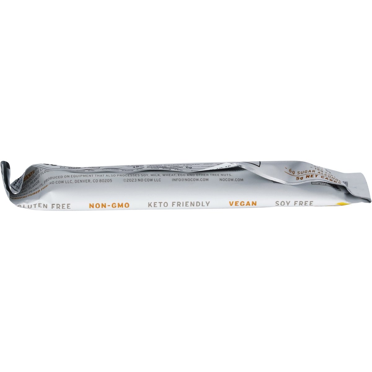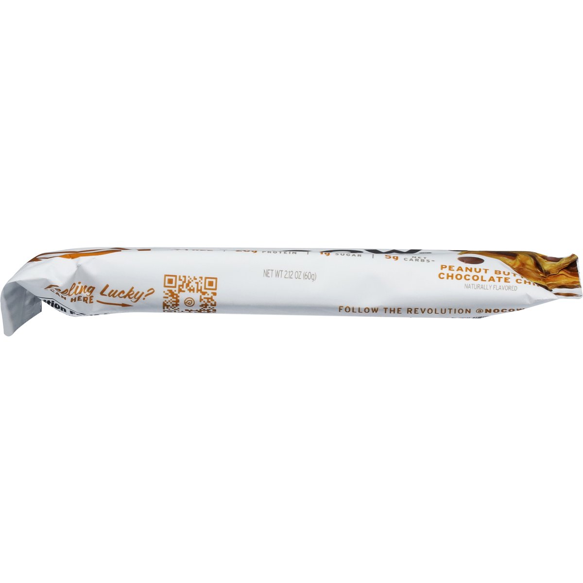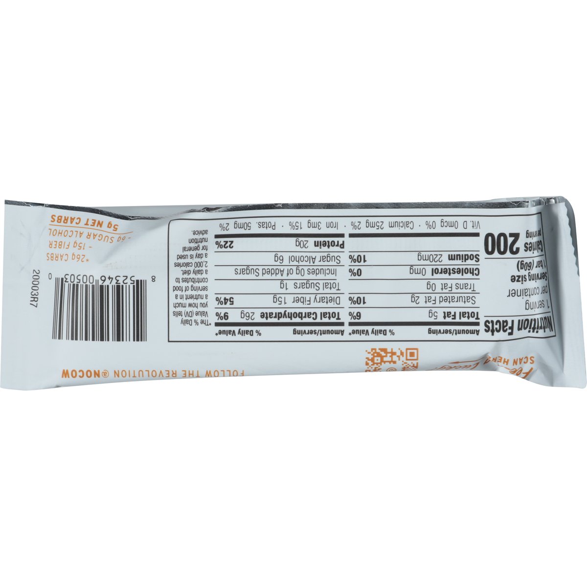 Naturally flavored. 20 g plant protein. 1 g sugar. 5 g net carbs*. * 26 g carbs - 15 g fiber - 6 g sugar alcohol = 5 g net carbs. Dairy free. Gluten free. Vegan. Soy free. Certified gluten free. gfco.org. Keto friendly. Non-GMO. Non-GMO Project verified. nongmoproject.org. nocow.com. Feeling lucky? Scan here. Follow the revolution @nocow. info@nocow.com.