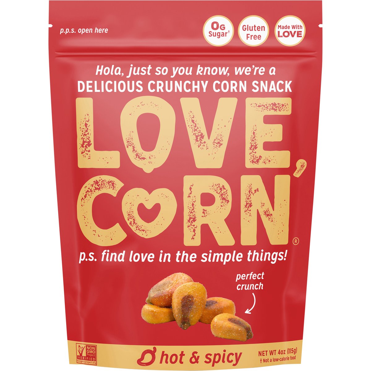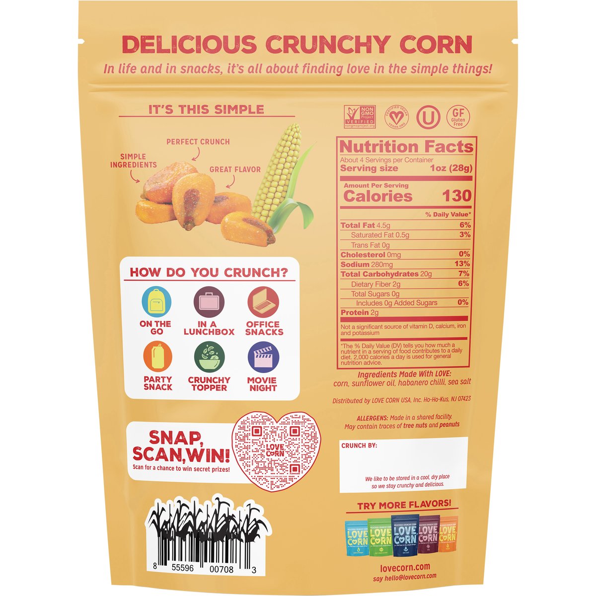 0 g sugar (a). (a) Not a low-calorie food. Certified vegan. Vegan.org. Gluten free. Non-GMO Project verified. nongmoproject.org. Made with love. Hola, just so you know, we're delicious crunchy corn. P.S. find love in the little things! Perfect crunch. Delicious crunchy corn. In life and in snacks, it's all about finding love in the simple things! It's this simple: simple ingredients. Perfect crunch. Great flavor. How do you crunch? On the go. In a lunchbox. Office snacks. Party snack. Crunchy topper. Movie night. lovecorn.com. Snap, scan, win! Scan for a chance to win secret prizes! Crunch share smile! tag @lovecorn_snacks. Say hello@lovecorn.com. For T&Cs and more info visit lovecorn.com/secret. Try more flavors!