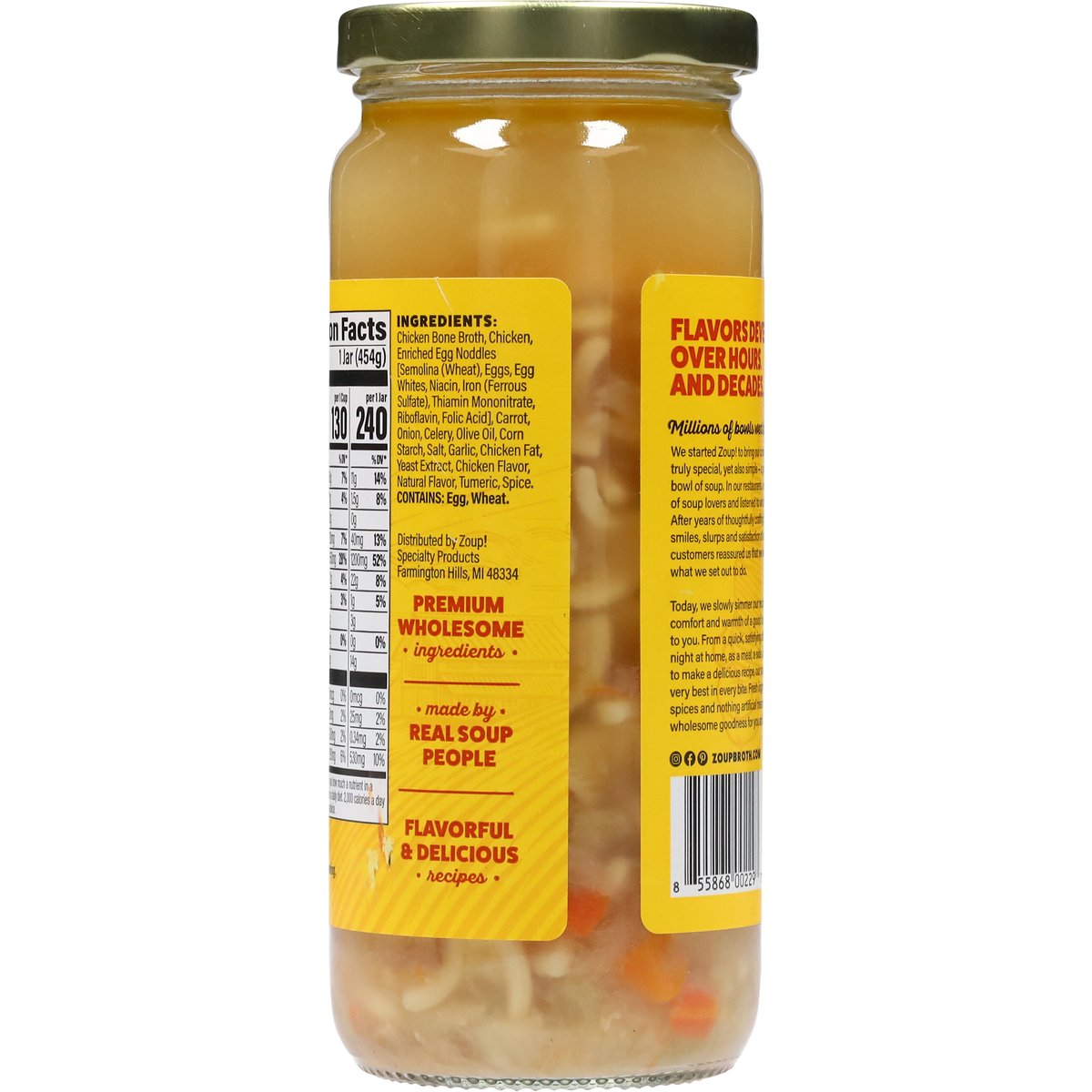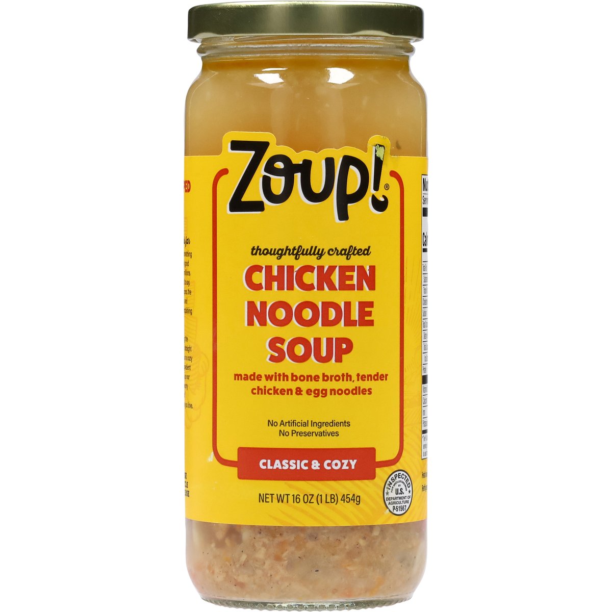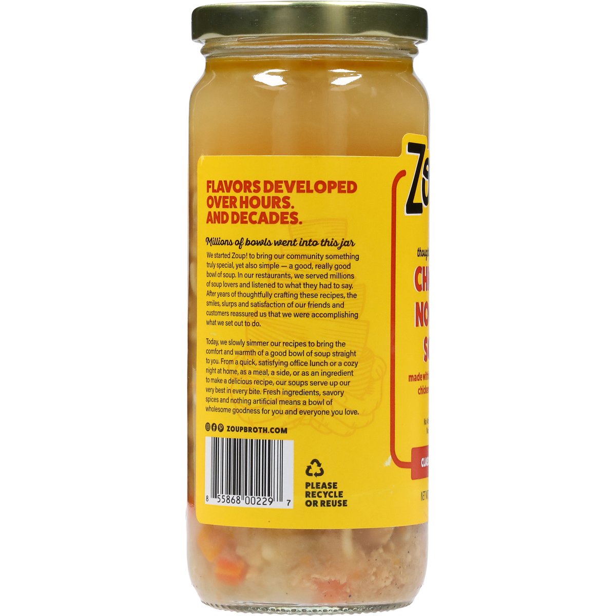 Thoughtfully crafted. No preservatives. Premium wholesome ingredients. Made by real soup people. Flavorful & delicious recipes. Millions of bowls went into this jar We started Zoup! to bring our community something truly special, yet also simple - a good, really good bowl of soup. In our restaurants, we served millions of soup lovers and listened to what they had to say. After years of thoughtfully crafting these recipes, the smiles, slurps and satisfaction of our friends and customers reassured us that we were accomplishing what we set out to do. Today, we slowly simmer our recipes to bring the comfort and warmth of a good bowl of soup straight to you. From a quick, satisfying office lunch or a cozy night at home, as a meal, a side, or as an ingredient to make a delicious recipe, our soups serve up our very best in every bite. Fresh ingredients, savory spices and nothing artificial means a bowl of wholesome goodness for you and everyone you love. Inspected for wholesomeness by U.S. Department of Agriculture. zoupbroth.com. Facebook. Instagram. Pinterest. Please recycle or reuse.