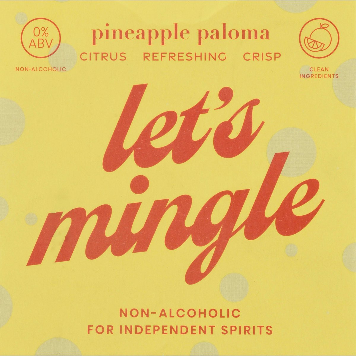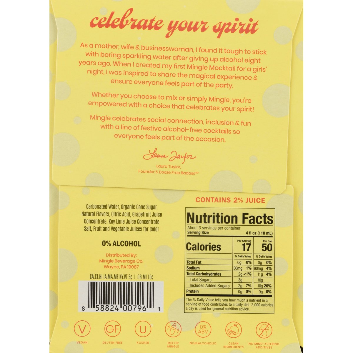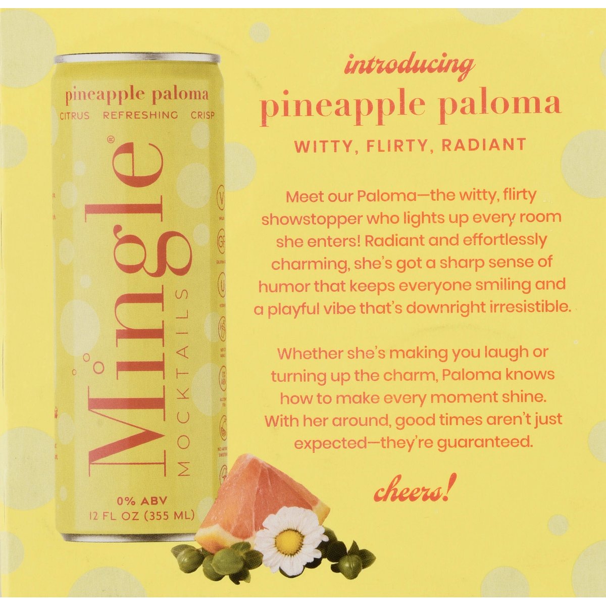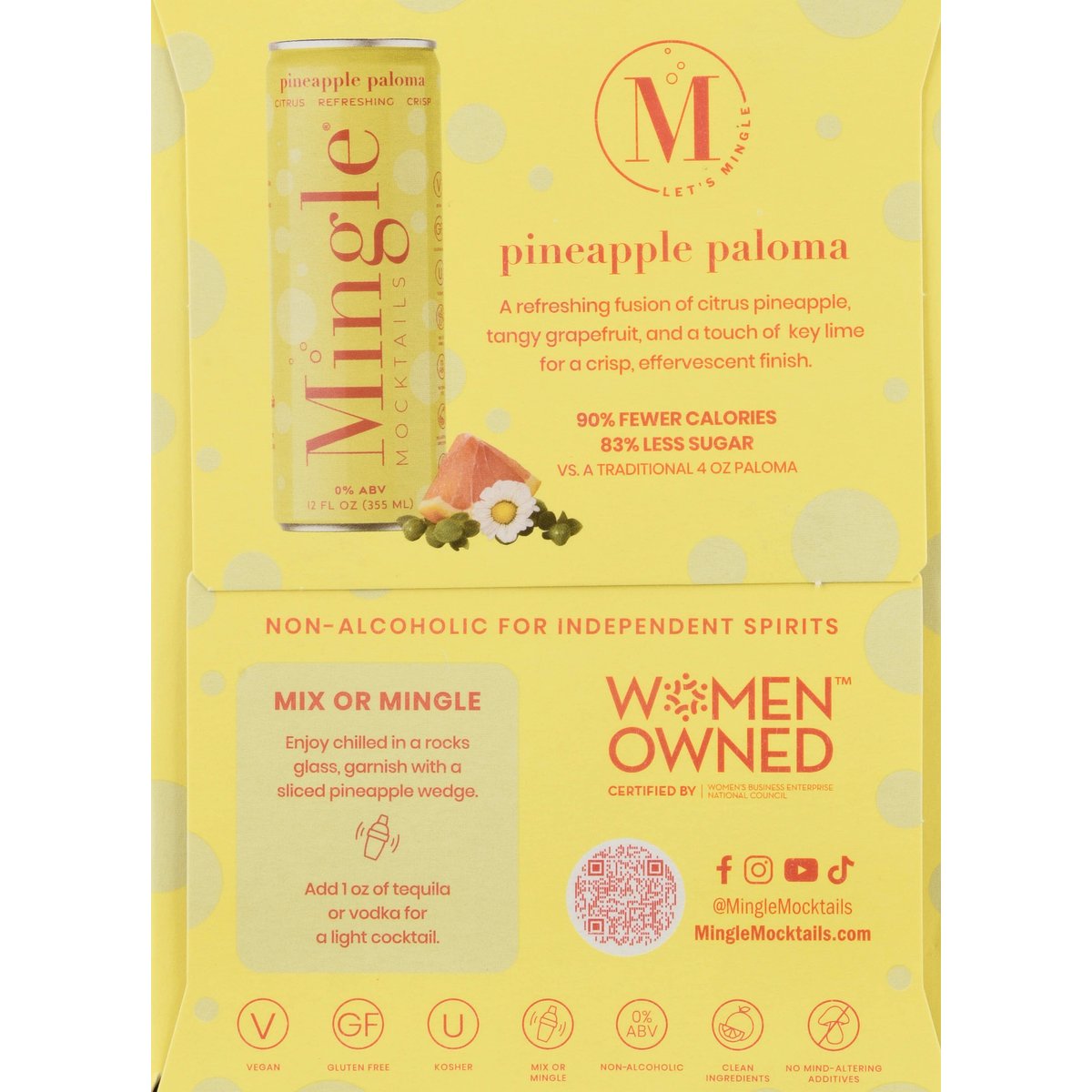 Vegan. 90% fewer calories, 83% less sugar vs. a traditional 4 oz paloma. Citrus. Refreshing. Crisp. Clean ingredients. Mix or mingle. No mind-altering additives. Let's mingle. Non-alcoholic for independent spirits. A refreshing fusion of citrus pineapple, tangy grapefruit, and a touch of key lime for a crisp, effervescent finish. Celebrate your spirit. As a mother, wife & businesswoman, I found it tough to stick with boring sparkling water after giving up alcohol eight years ago. When I created my first Mingle Mocktail for a girls' night, I was inspired to share the magical experience & ensure everyone feels part of the party. Whether you choose to mix or simply Mingle, you're empowered with a choice that celebrates your spirit! Mingle celebrates social connection, inclusion & fun with a line of festive alcohol-free cocktails so everyone feels part of the occasion. - Laura Taylor, Founder & Booze Free Badass. Introducing Pineapple Paloma witty, flirty, radiant. Meet our Paloma-the witty, flirty showstopper who lights up every room she enters! Radiant and effortlessly charming, she's got a sharp sense of humor that keeps everyone smiling and a playful vibe that's downright irresistible. Whether she's making you laugh or turning up the charm, Paloma knows how to make every moment shine. With her around, good times aren't just expected-they're guaranteed. Cheers! MingleMocktails.com. Facebook. Instagram. YouTube. TikTok. @MingleMocktails. Women Owned Certified by Women's Business Enterprise National Council. 0% ABV. 0