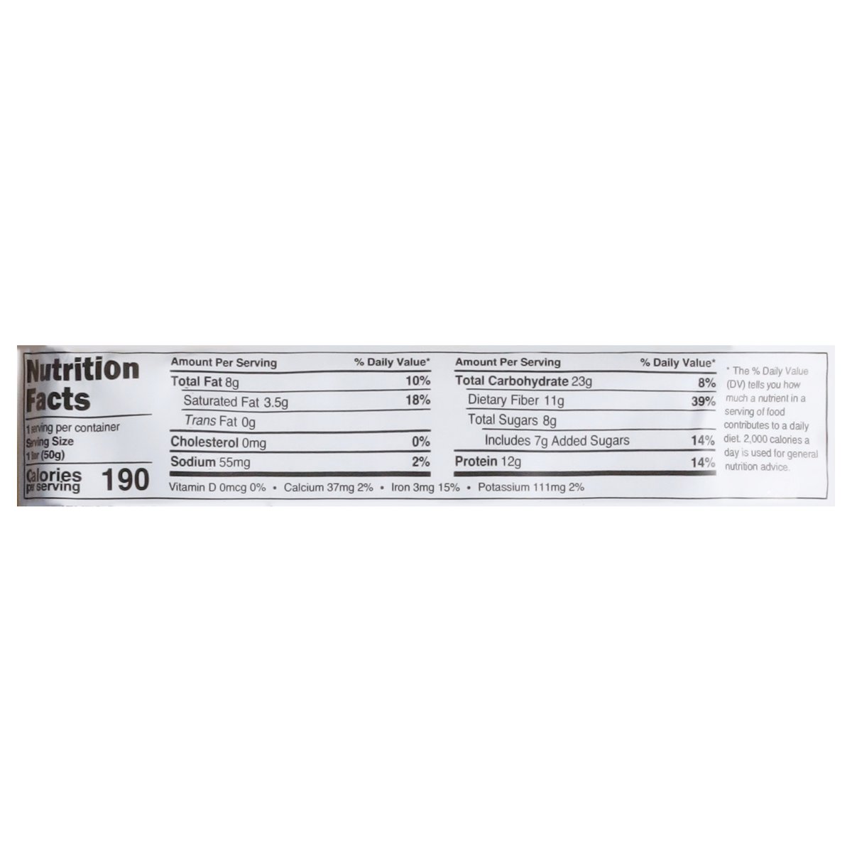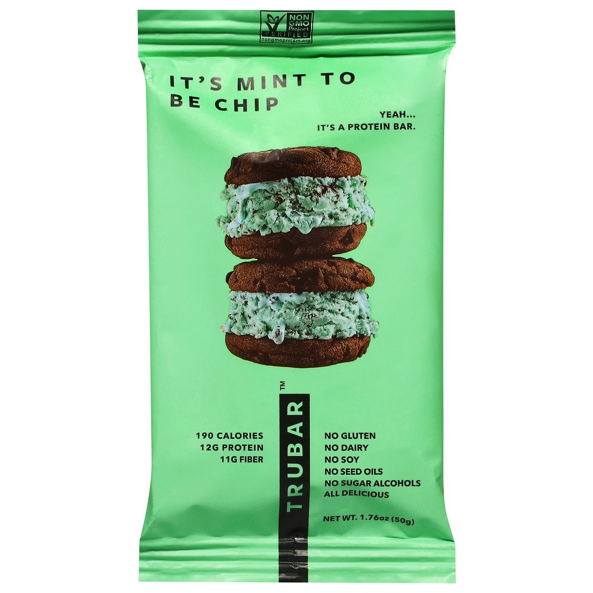 190 calories; 12 g protein; 11 g fiber. Certified gluten free. Certified vegan. vegan.org. No dairy. No soy. No sugar alcohols. Non-GMO Project verified. nongmoproject.org. Yeah - it's a protein bar. All delicious. P.S. Keep me cool. Plant based and delicious! And no junk. trubar.com. 1-800-473-2144. Join us at trubar.com.