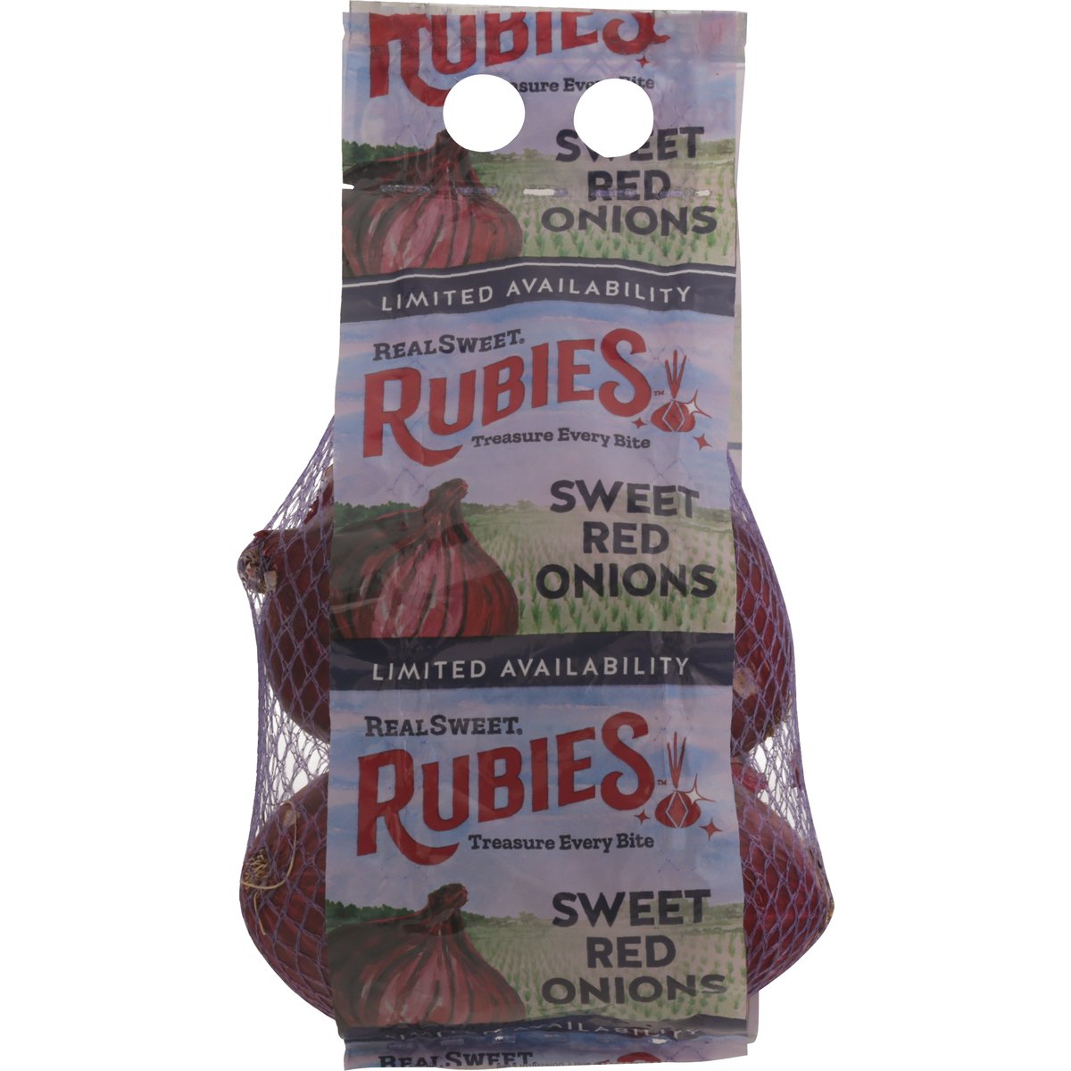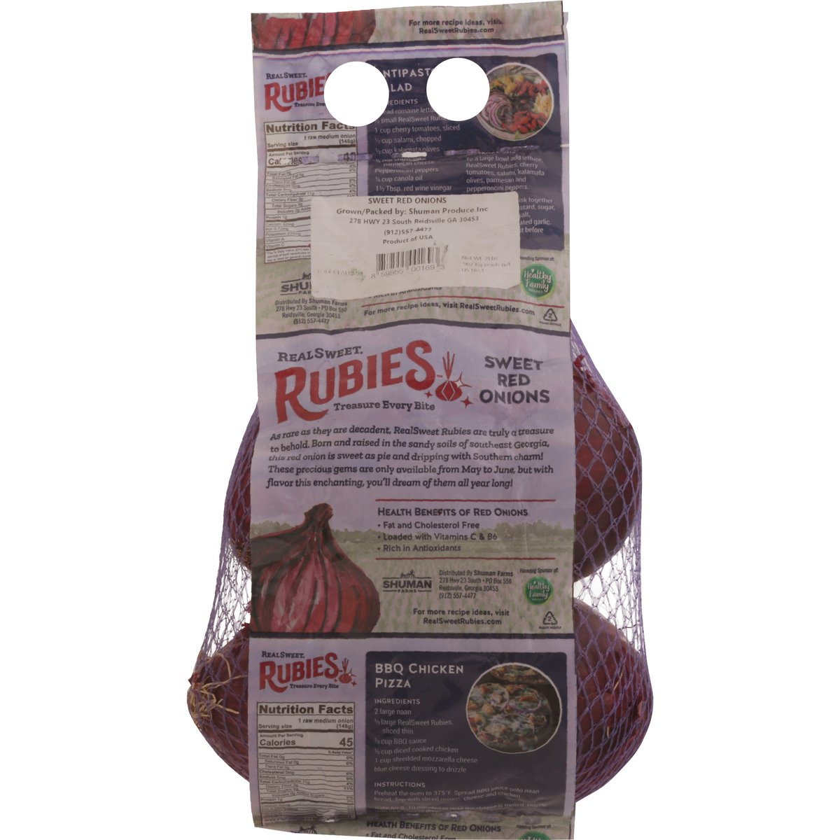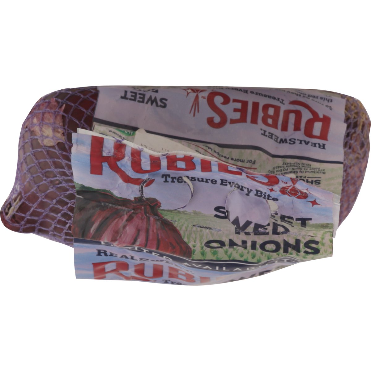 Health Benefits of Red Onions: Fat and cholesterol free; Loaded with vitamins C & B6; Rich in antioxidants. Treasure every bite. Limited availability. As rare as they are decadent, RealSweet Rubies are truly a treasure to behold. Born and raised in the sandy soils of southeast Georgia, this red onion is sweet as pie and dripping with Southern charm! These precious gems are only available from May to June, but with flavor this enchanting, you'll dream of them all year long! RealSweetRubies.com. (912) 557-4477. For more recipe ideas, visit RealSweetRubies.com. Founding Sponsor of: Healthy family project. Please recycle. Product of USA.