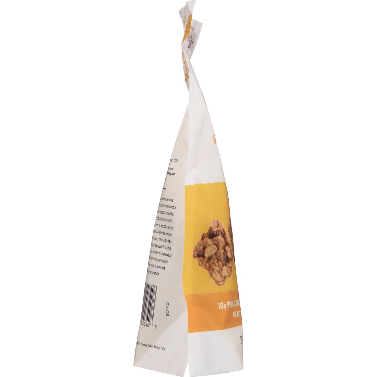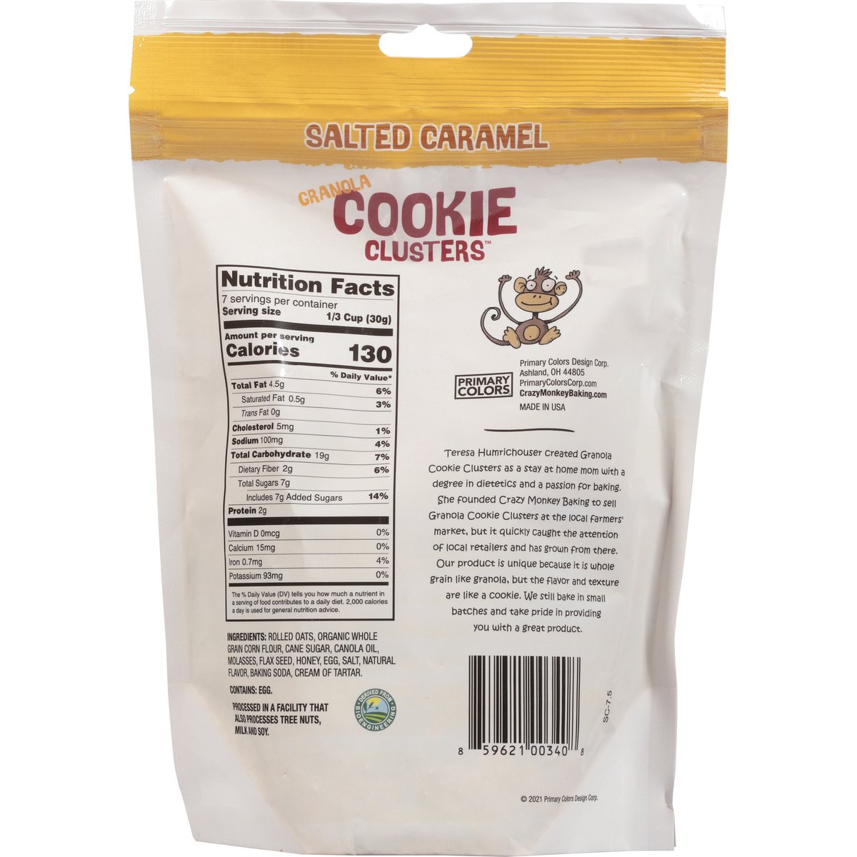 No artificial colors or flavors. Per 1/3 Cup Serving: 130 calories, 0.5 g sat fat (3% DV), 100 mg sodium (4% DV), 7 g sugars. 18 g whole grain per serving. Derived from Bioengineering. Snacking never tasted so good! No preservatives. Teresa Humrichouser created Granola Cookie Clusters as a stay at home mom with a degree in dietetics and a passion for baking. She founded Crazy Monkey Baking to sell Granola Cookie Clusters at the local farmers' market, but it quickly caught the attention of local retailers and has grown from there. Our product is unique because it is whole grain like granola, but the flavor and texture are like a cookie. We still bake in small batches and take great pride in providing you with a great product. PrimaryColorsCorp.com. CrazyMoneyBaking.com. Made in USA.