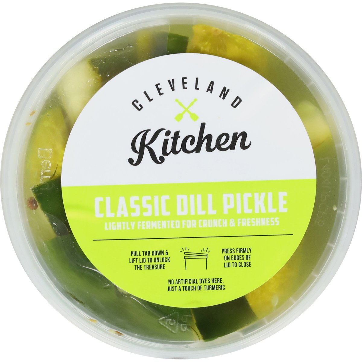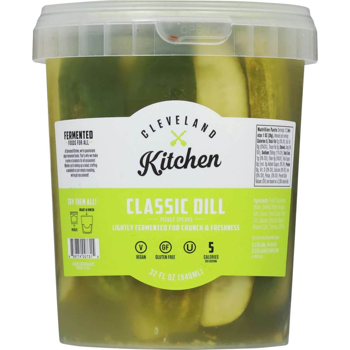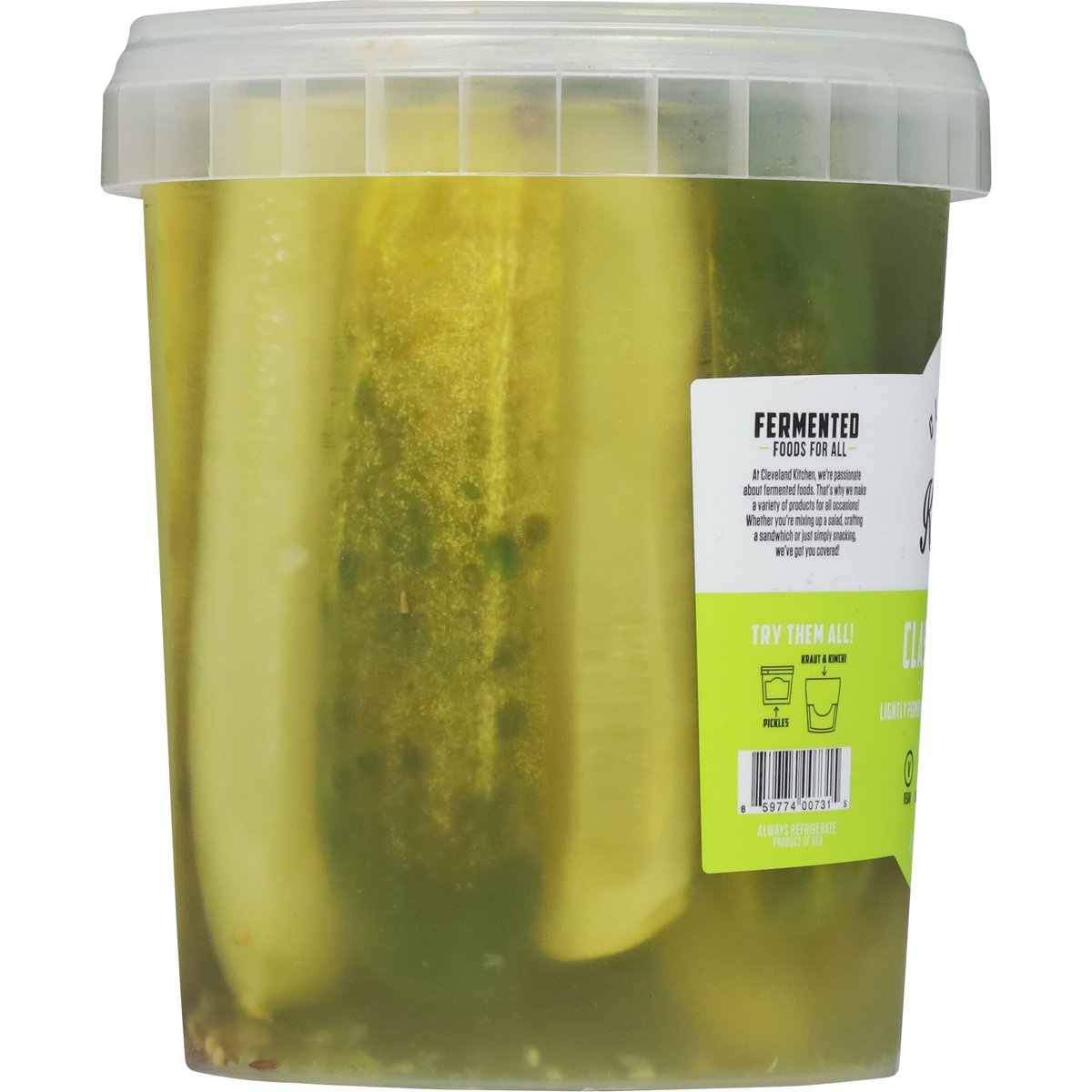 5 calories per serving. Vegan. Gluten free. Lightly fermented for crunch & freshness. Fermented foods for all. At Cleveland Kitchen, we're passionate about fermented foods. That's why we make 8 variety of products for all occasions! Whether you're mixing up a salad, crafting 8 sandwich or just simply snacking, we've got you covered! No artificial dyes here, just a touch of turmeric. clevelandkitchen.com. Instagram. Facebook. Twitter. (at)clevelandkitchen. Try them all! Kraut & kimchi. Pickles. Product of USA.