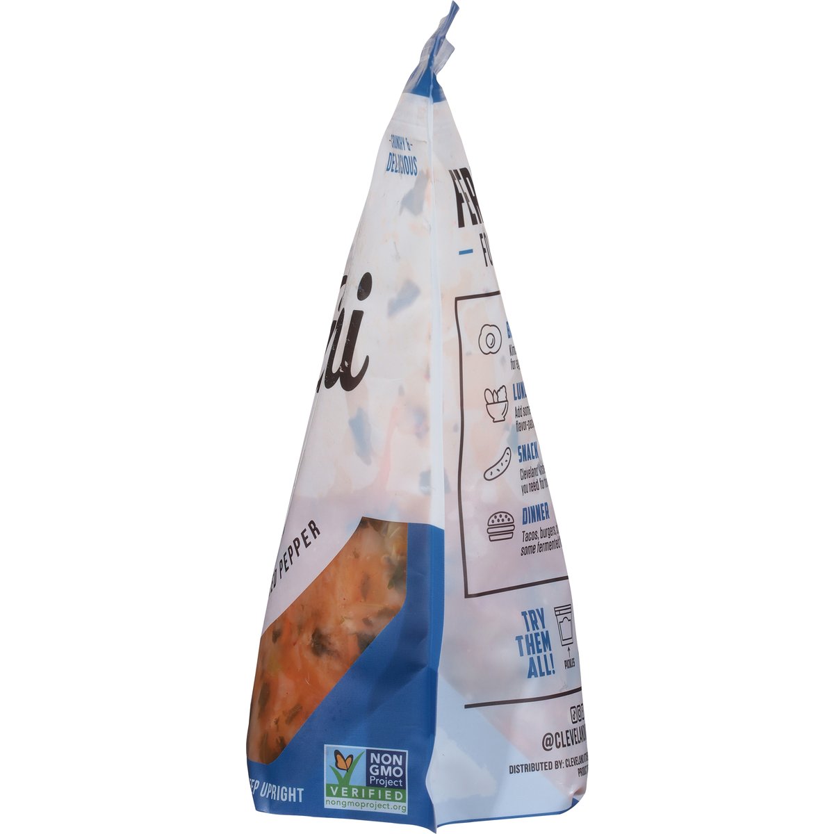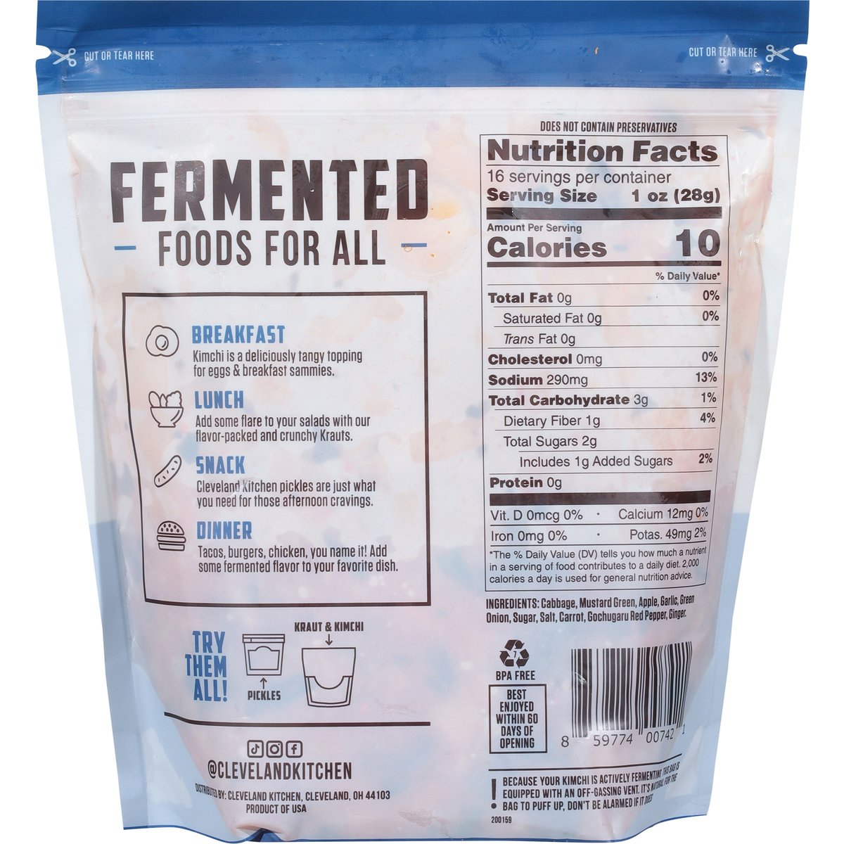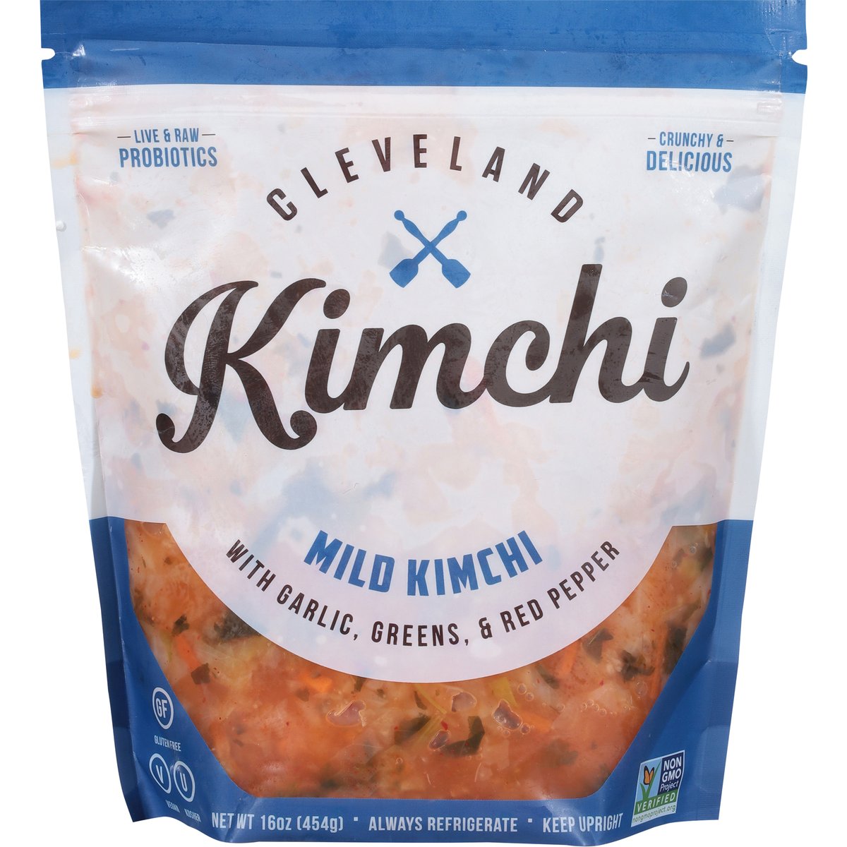 Mild kimchi with garlic, greens, & red pepper. Gluten free. Vegan. Non-GMO Project verified. nongmoproject.org. Live & raw probiotics. Crunchy & delicious. Breakfast: Kimchi is a deliciously tangy topping for eggs & breakfast sammies. Lunch: Add some flare to your salads with our flavor-packed and crunchy Krauts. Snack: Cleveland Kitchen pickles are just what you need for those afternoon cravings. Dinner: Tacos, burgers, chicken, you name it! Add some fermented flavor to your favorite dish. Does not contain preservatives. TikTok. Instagram. Facebook. (at)clevelandkitchen. BPA free. Product of USA.