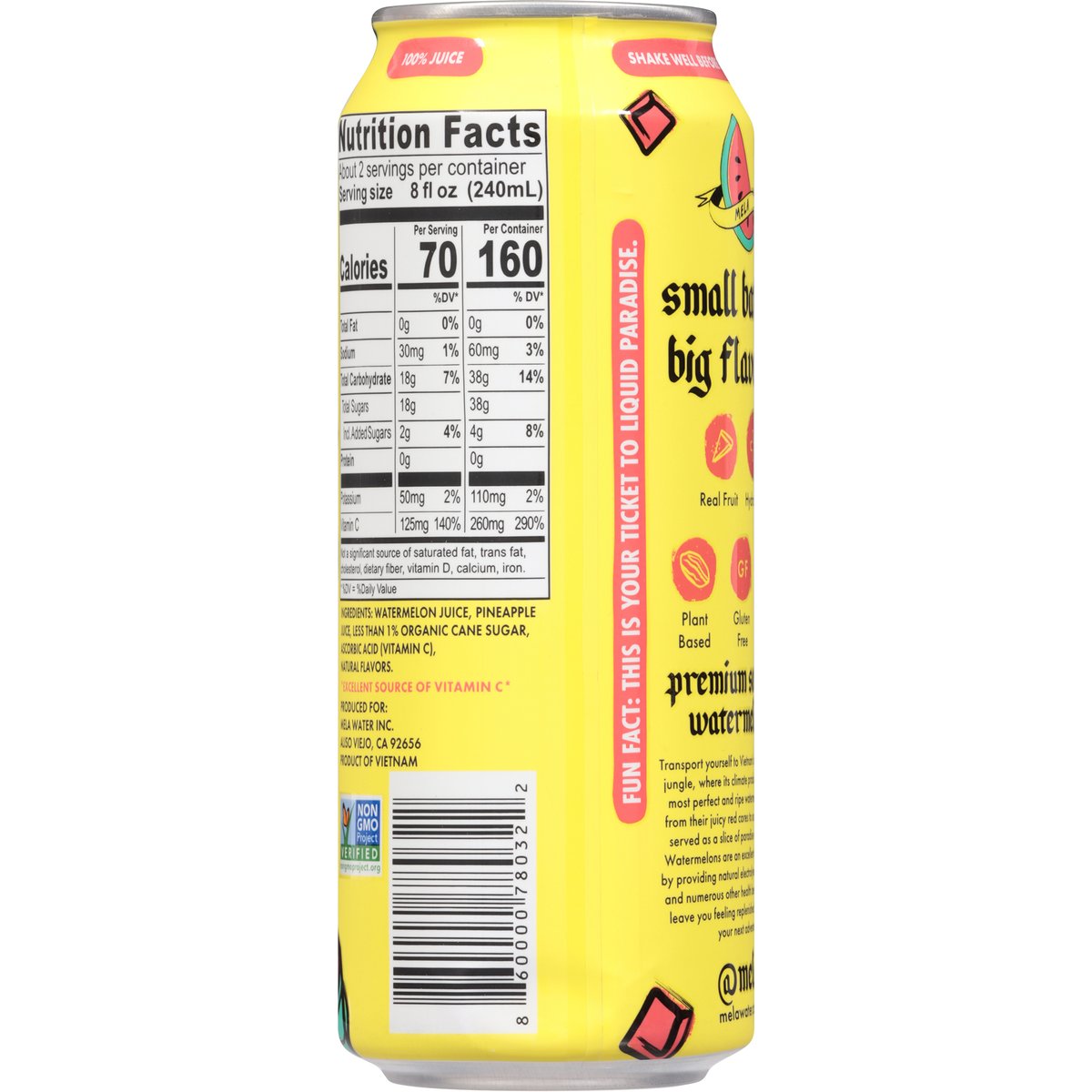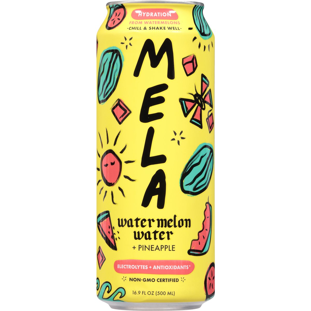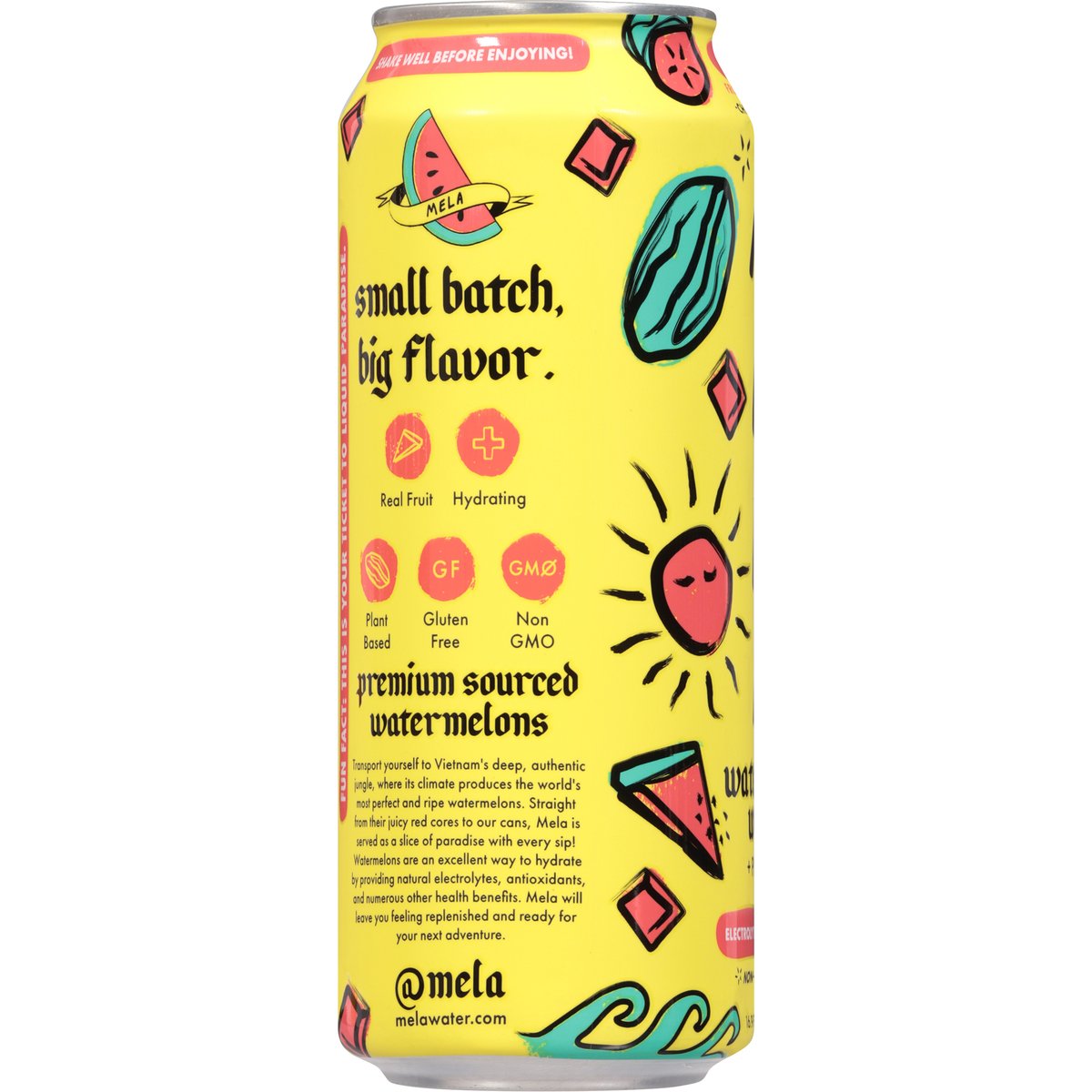 Gluten free. Non-GMO Project verified. nongmoproject.org. Non-GMO Certified. Non GMO. Hydration from watermelons. Electrolytes + antioxidants*. Fun Fact: This is your ticket to liquid paradise. Small batch, big flavor. Real fruit. Hydrating. Plant based. Premium sourced watermelons. Transport yourself to Vietnam’s deep, authentic jungle, where its climate produces the world’s most perfect and ripe watermelons. Straight from their juicy red cores to our can, Mela is served as a slice of paradise with every sip! Watermelons are an excellent way to hydrate by providing natural electrolytes, antioxidants, and numerous other health benefits. Mela will leave you feeling replenished and ready for your next adventure. * Excellent source of vitamin C. melawater.com. @mela. Product of Vietnam.