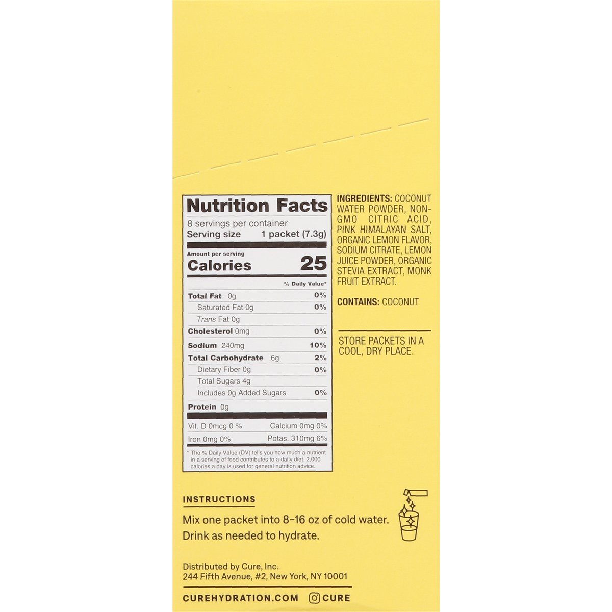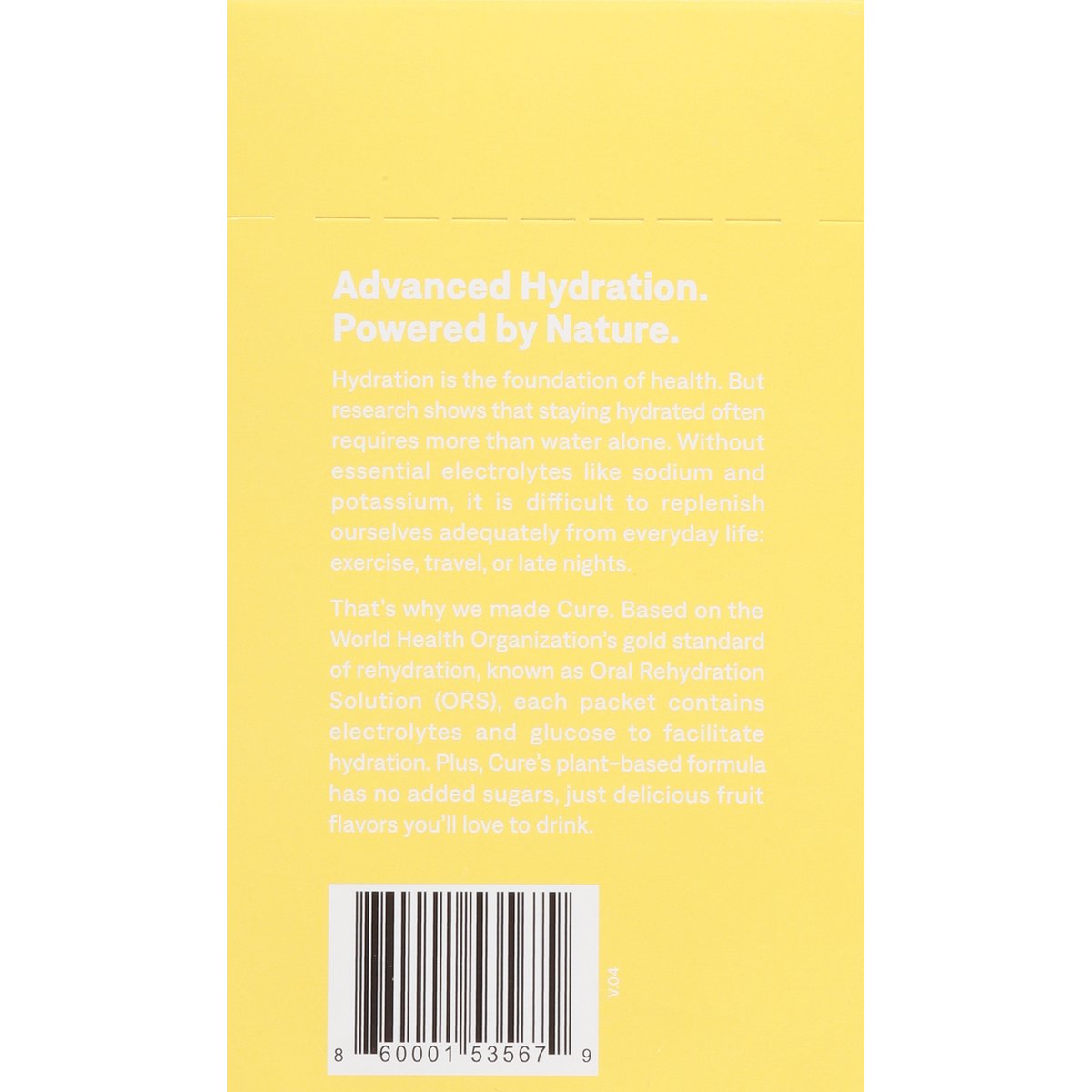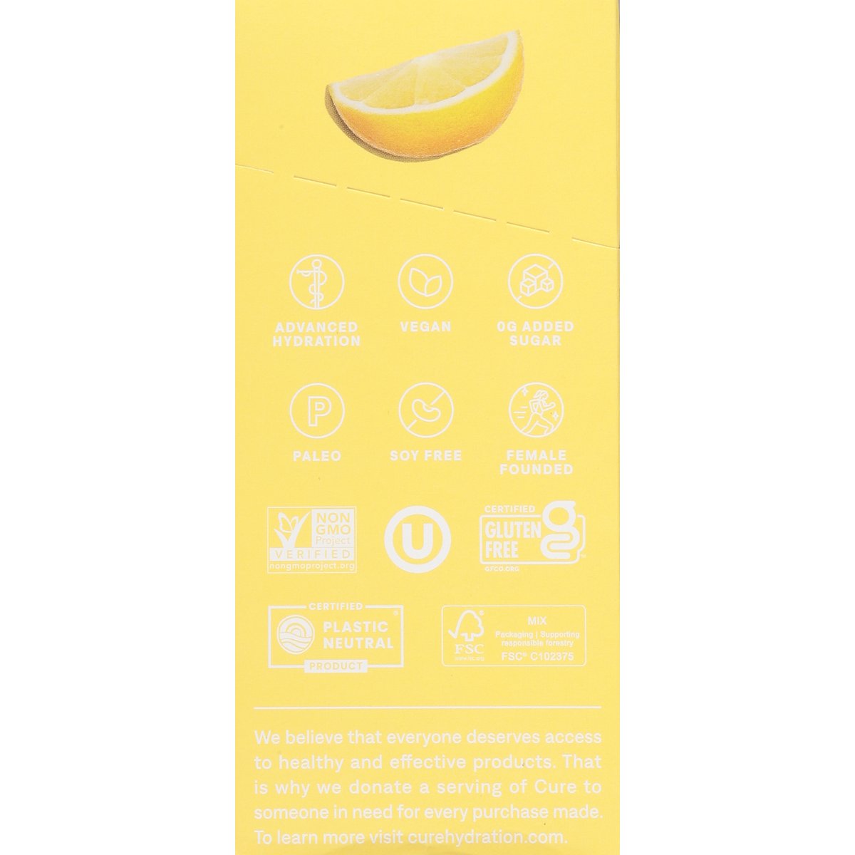Rehydrate with electrolytes from coconut water and pink Himalayan salt. Flavored with other natural flavors. 0 g added sugar. Certified gluten free. gfco.org. Vegan. Paleo. Soy free. Non-GMO Project verified. nongmoproject.org. Plant-based. Rehydrate with electrolytes from coconut water and pink Himalayan salt. Advanced hydration. Powered by nature. Hydration is the foundation of health. But research shows that staying hydrated often requires more than water alone. Without essential electrolytes like sodium and potassium, it is difficult to replenish ourselves adequately from everyday life: exercise, travel, or late nights. That’s why we made Cure. Based on the World Health Organization’s gold standard of rehydration, known as Oral Rehydration Solution (ORS), each packet contains electrolytes and glucose to facilitate hydration. Plus, Cure’s plant-based formula has no added sugars, just delicious fruit flavors you’ll love to drink. Advanced hydration. curehydration.com. Instagram cure. To learn more visit curehydration.com. Female founded. We believe that everyone deserves access to healthy and effective products. That is why we donate a serving of Cure to someone in need for every purchase made. To learn more visit curehydration.com. Certified plastic neutral product. FSC: Mix - Packaging. Supporting responsible forestry. www.fsc.org. Please recycle.