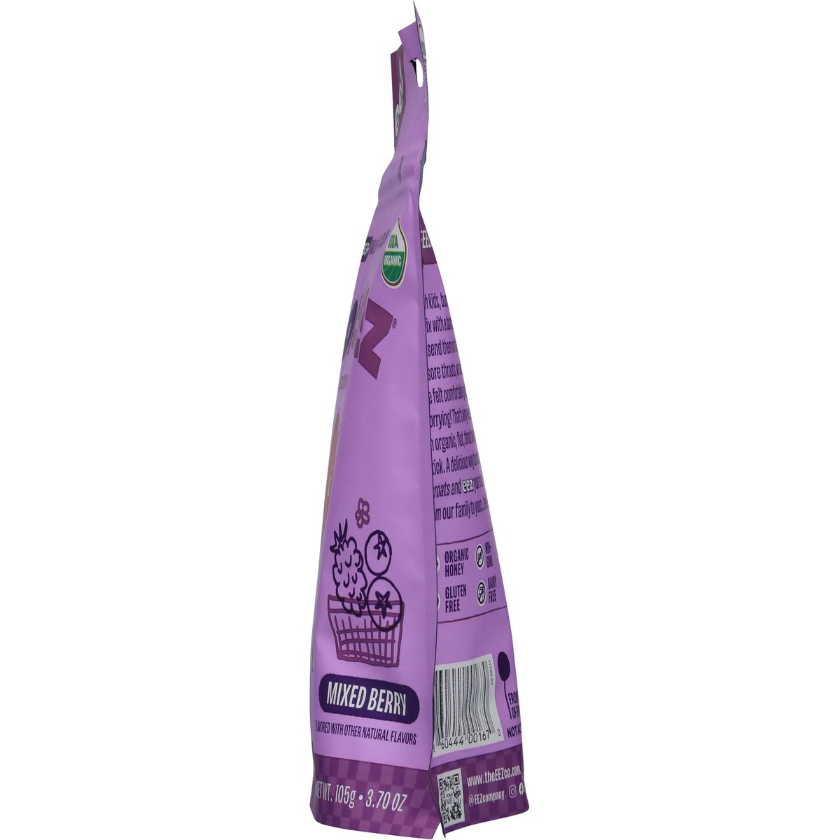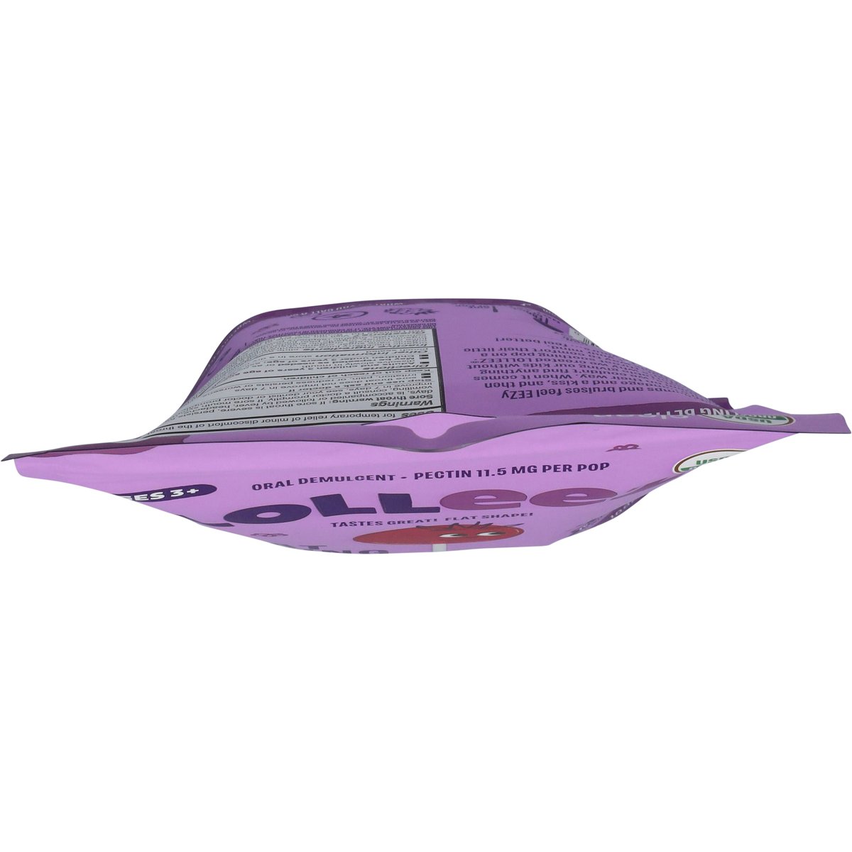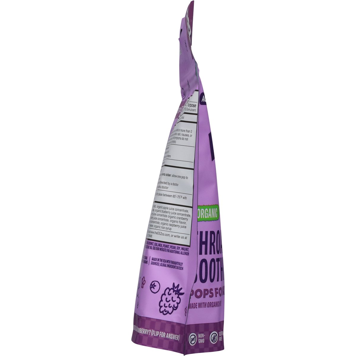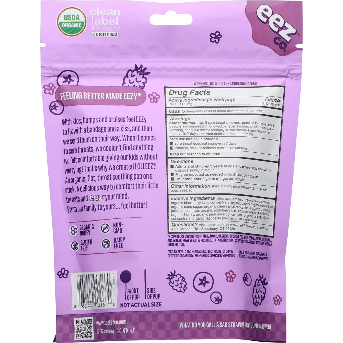 (in each pop) Other Information: Store in a dry place between 65 degrees - 75 degrees F with pouch sealed. Ages 3+. Oral Demulcent. Pectin 11.5 mg per pop. Flavored with other natural flavors. USDA Organic. Certified Organic by: Where Food Comes From Organic. Gluten free. Dairy free. Non-GMO. Tastes great! Flat shape! Feeling better made eezy. With kids, bumps and bruises feel Eezy to fix with a bandage and a kiss, and then we send them on their way. When it comes to sore throats, we couldn't find anything we felt comfortable giving our kids without worrying! That's why we created Lolleez. An organic, flat, throat soothing pop on a stick. A delicious way to comfort their little throats and eez your mind. From our family to yours - feel better! Front of pop. Side of pop. What do you call a sad strawberry? (Flip for answer). A blueberry. www.theEEZco.com. Scan me. @EEZcompany. Instagram. Facebook. TikTok. Questions? Visit our website at www.theEEZco.com, or write us at 450 Heritage Rd., Southbury, CT 06488. Clean Label Project certified. Made in the USA with thoughtfully sourced, global ingredients.