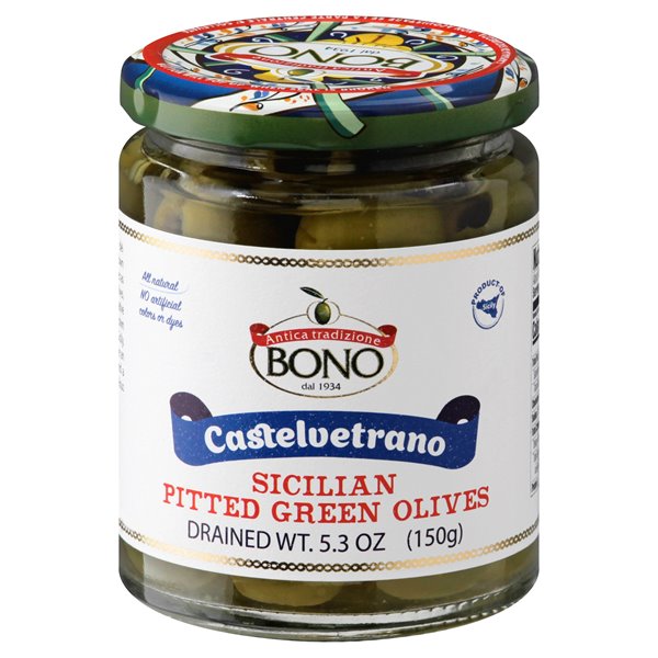 Non-GMO Project verified. nongmoproject.org. No artificial colors or dyes. The Nocellara del Belice olives, known in the United States as Castelvetrano olives, are cultivated exclusively in their native environment in and around the town of Castelvetrano in the West of Sicily. These all-natural green olives have an incredible buttery-sweet flavor and a crisp, firm texture. They are marvelous whether as an appetizer or an ingredient of your meal. www.bonousainc.com. Facebook. Instagram. Pinterest. (at)bonodisicilausa.com. Please, recycle your empty jar. Product of Sicily. Packed in Castelvetrano (TP), Sicily - Italy. Product of Italy.