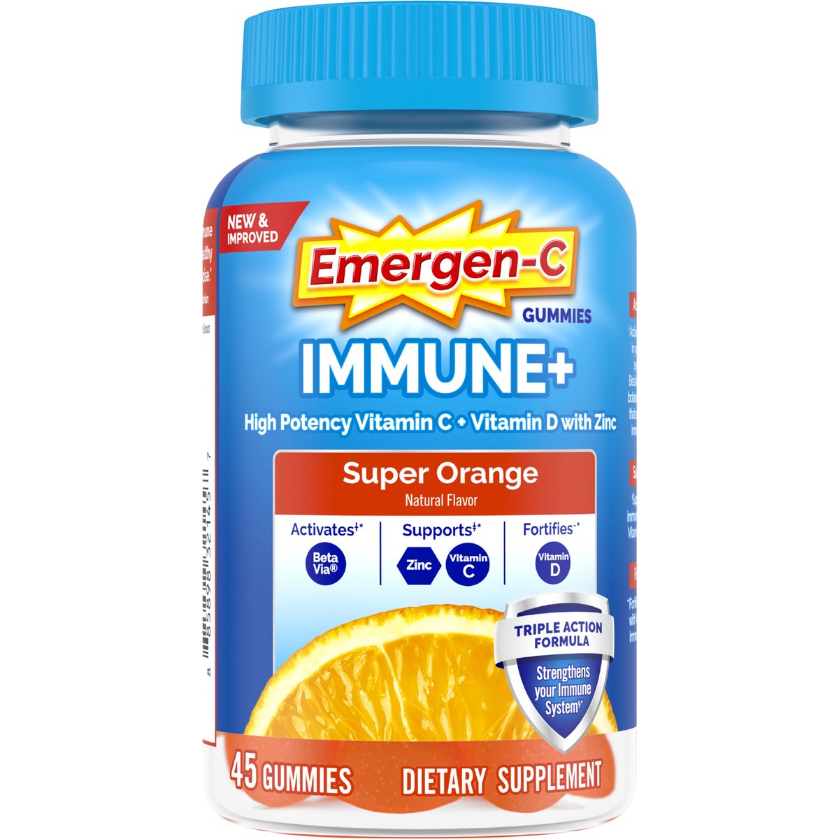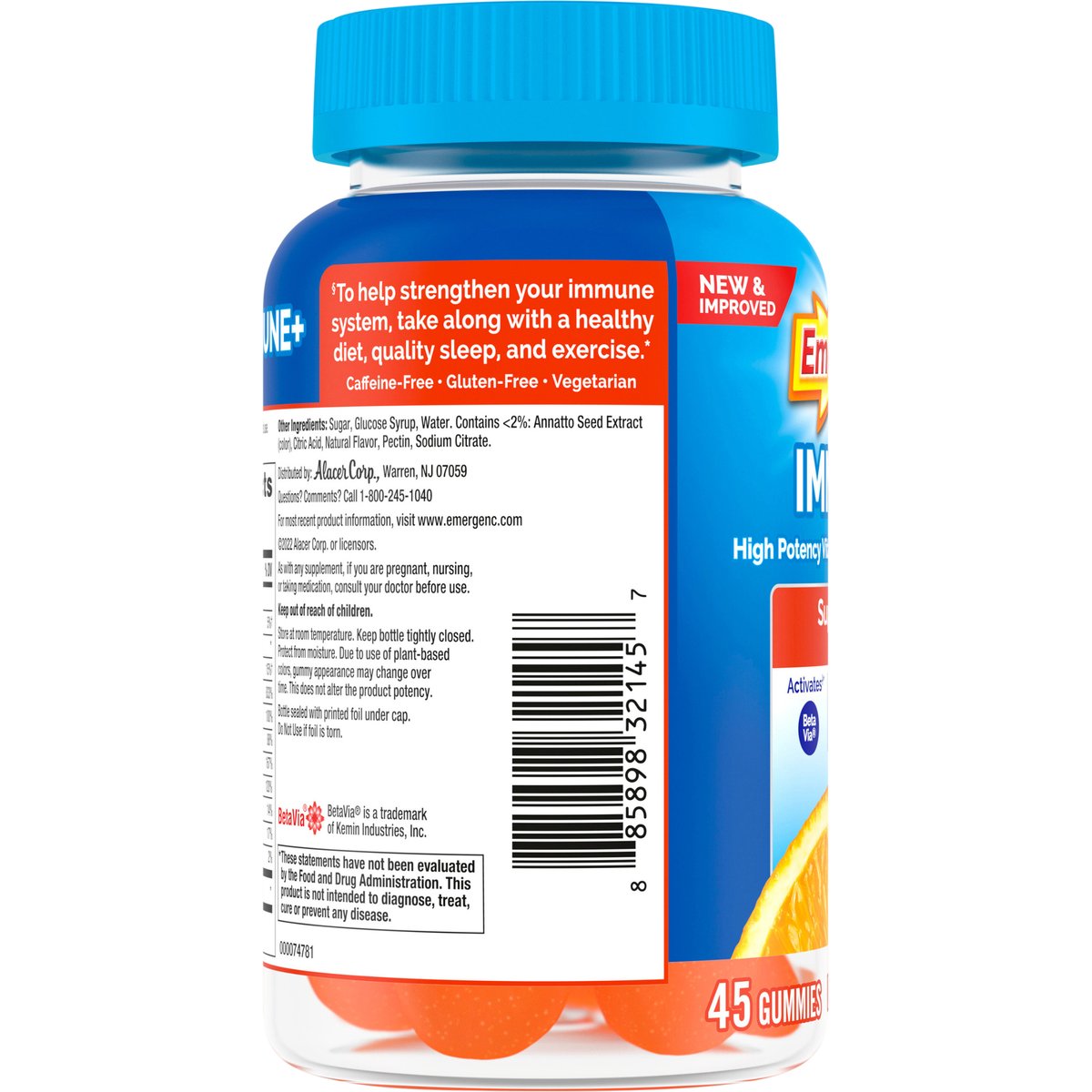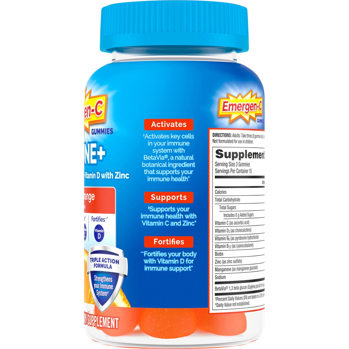 Dietary Supplement. Gluten free. Caffeine-free. Vegetarian. New & improved. Activates (a)*: Beta via. Support (b)*: zinc; vitamin C; Fortifies (c)*: vitamin D. Triple Action Formula: Strengthens your immune system (d)*. Protect from moisture. Due to use of plant-based colors, gummy appearance may change over time. This does not alter the product potency. Activates: (a) Activates key cells in your immune system with BetaVia, a natural botanical ingredient that supports your immune health*. Supports: (b) Supports your immune health with Vitamin C and Zinc*. Fortifies: (c) Fortifies your body with Vitamin D for immune support*. (d) To help strengthen your immune system, take along with a healthy diet, quality sleep, and exercise*. www.emergenc.com. Questions? Comments? Call 1-800-245-1040. For most recent product information, visit www.emergenc.com. *These statements have not been evaluated by the Food and Drug Administration. This product is not intended to diagnose, treat, cure or prevent any disease.