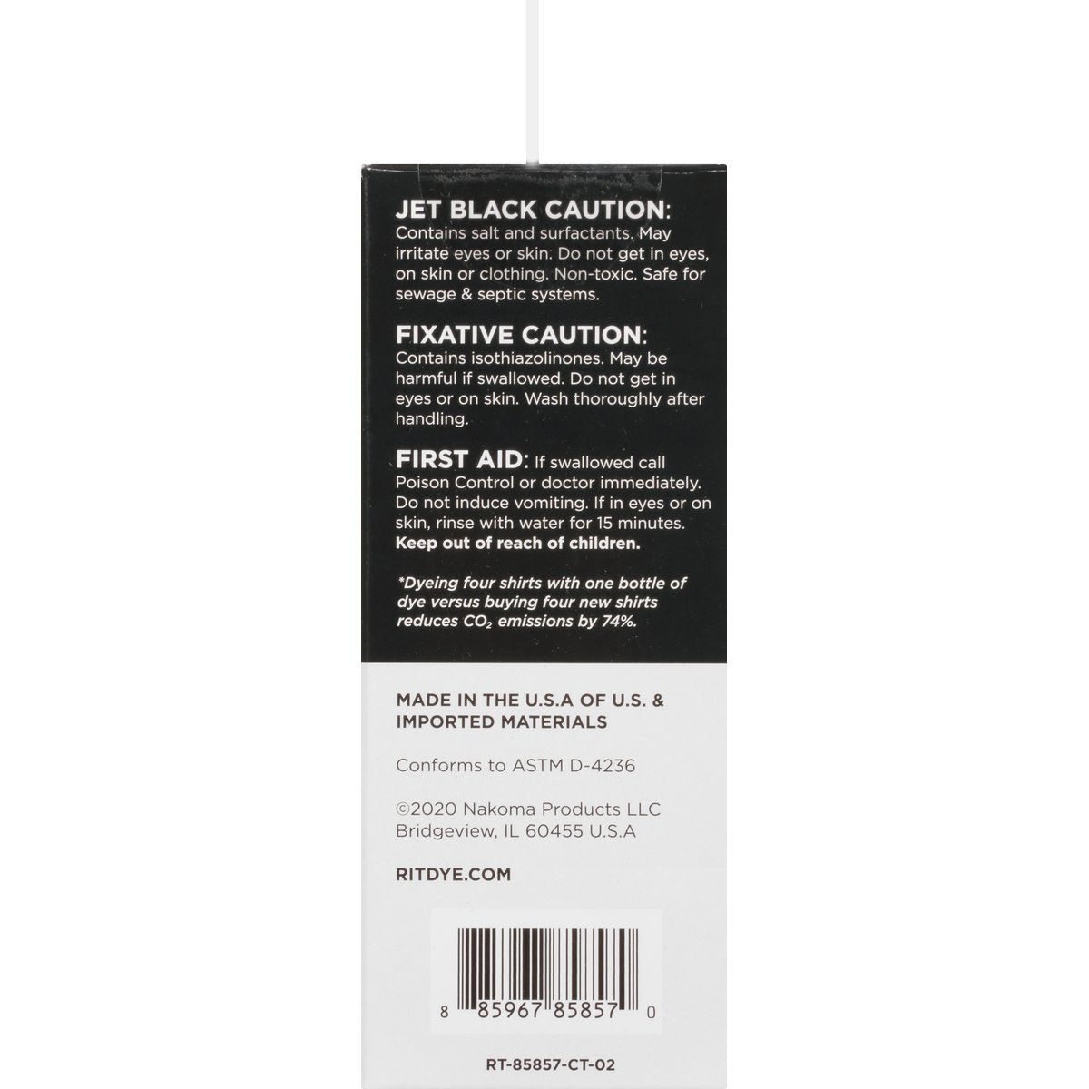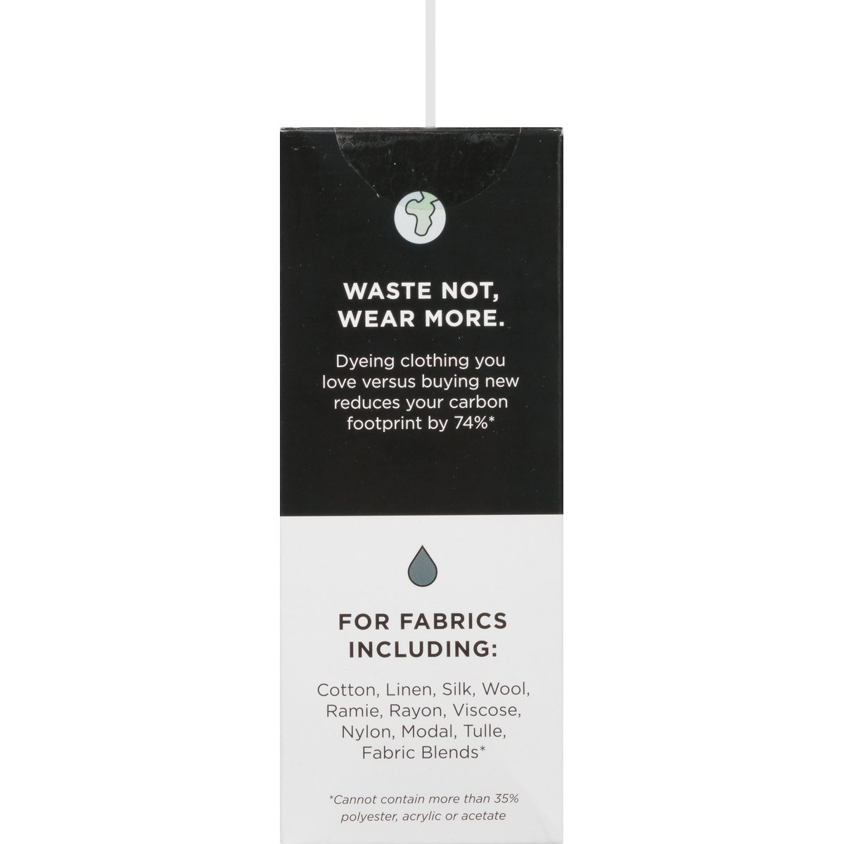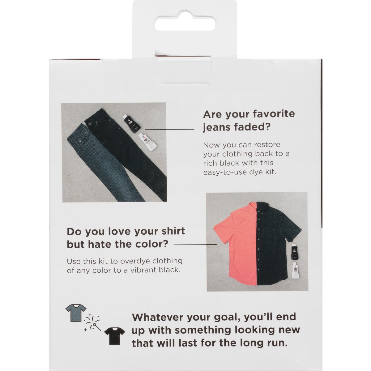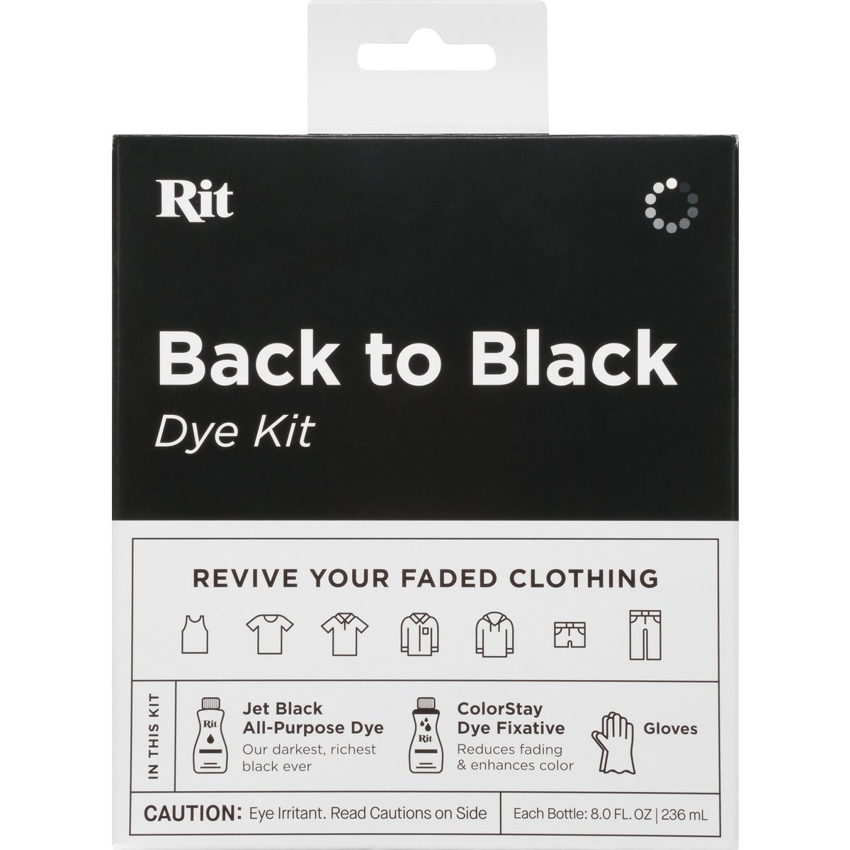 Each Bottle: 8.0 FL. OZ 236 mL. Revive your faded clothing. Jet Black All-Purpose Dye: Our darkest, riches black ever. Color Stay Dye Fixative: Reduced fading & enhances color. Gloves. Are your favorite jeans faded? Now you can restore your clothing back to a rich black with this easy-to-use dye kit. Do you love your shirt but hate the color? Use this kit to over dye clothing of any color to a vibrant black. Whatever your goal, you'll end up with something looking new that will last for the long run. For Fabrics Including Conforms to ASTM D-4236. ritdye.com. Waste not, wear more. Dyeing clothing you love versus buying new reduces your carbon footprint by 74% (Cannot contain more than 35% polyester, acrylic or acetate). For Fabrics Including: Cotton, Linen, Silk, Wool, Ramie, Rayon, Viscose, Nylon, Modal Tulle, Fabric Blends (Dyeing four shirts with one bottle of dye versus buying four new shirts reduces CO2 emissions by 74%). Made in the U.S.A. of U.S. & imported materials.