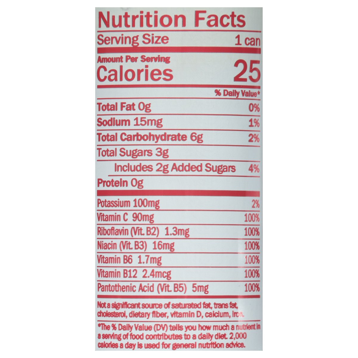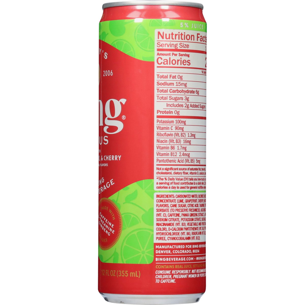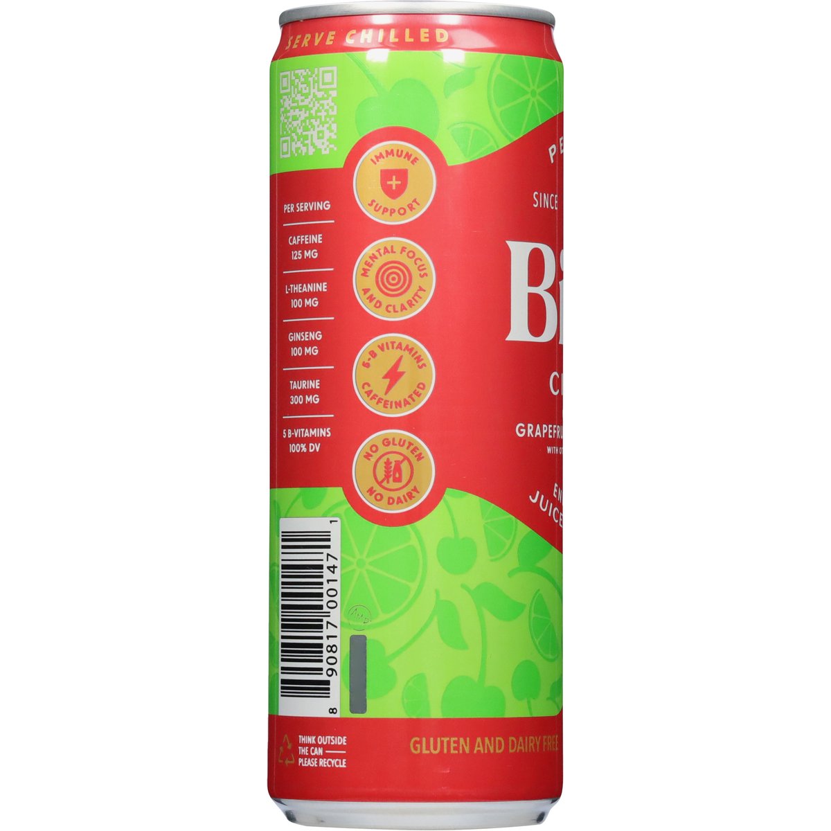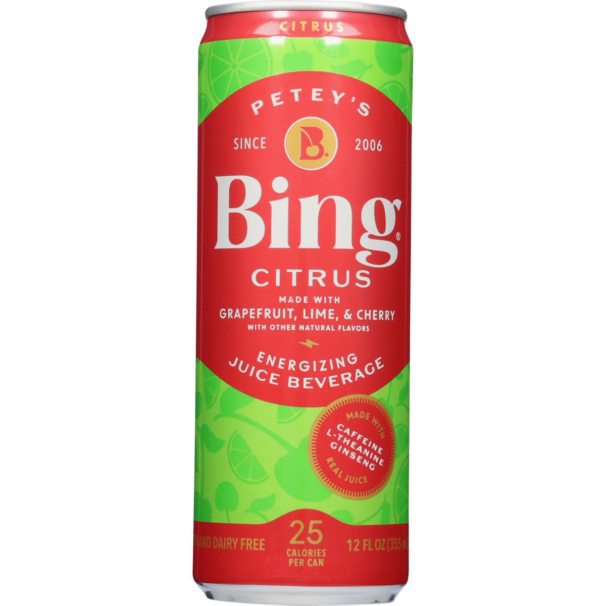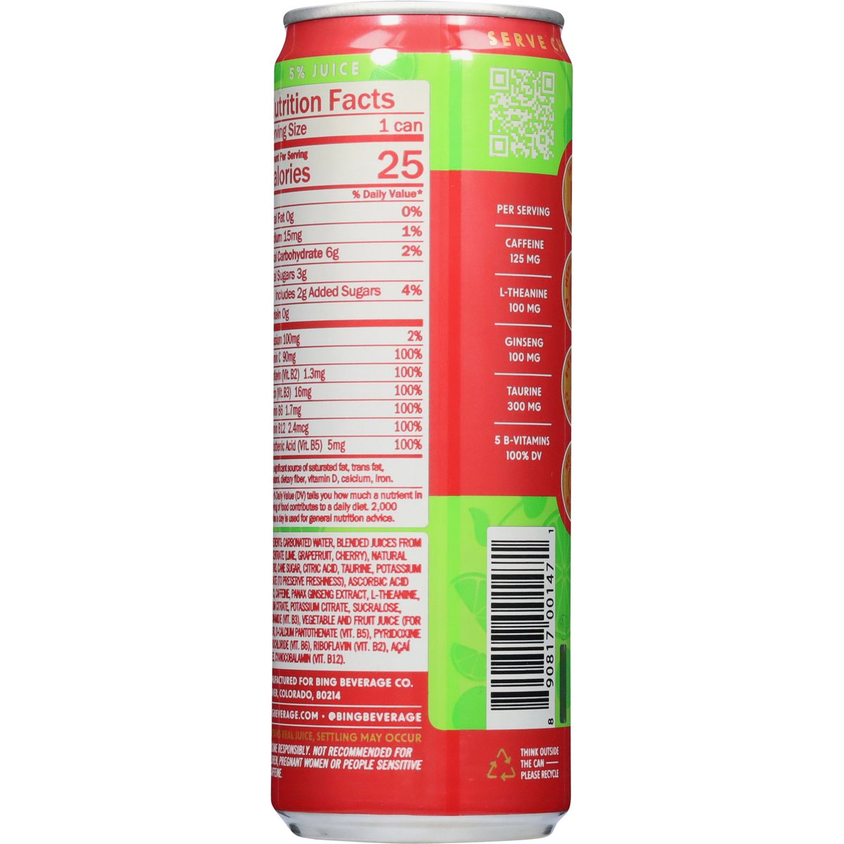 Energizing juice beverage. With other natural flavors. 25 calories per can. Per Serving: Caffeine 125 mg; L-Theanine 100 mg; Ginseng 100 mg; Taurine 300 mg; 5 B-vitamins (100% DV). Gluten and dairy free. No gluten. Caffeine; L-Theanine; Ginseng. 5-B vitamins caffeinated. No dairy. Since 2006. Immune support. Mental focus and clarity. Contains real juice, settling may occur. bingbeverage.com. @bingbeverage. Think outside the can. Please recycle.