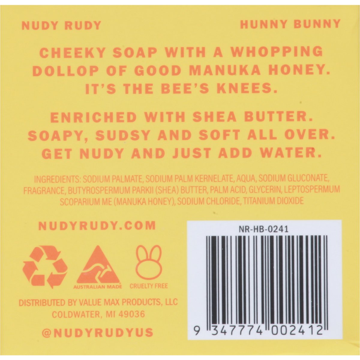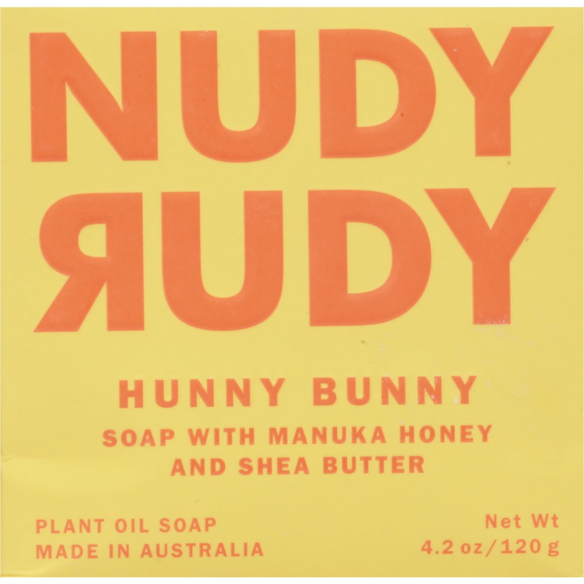 Soap with manuka honey and shea butter. Good. Cheeky. Soap. Just soap. No opera. Cheeky soap with a whopping dollop of good manuka honey. It's the bee's knees. Enriched with shea butter. Soapy, sudsy and soft all over. Get nudy and just add water. No artificial preservatives. No plastics. No slow-motion shower ads. No weird chemical number thingies. Just good, sustainable soap. nudyrudy.com. (at)nudyrudyus. Cruelty free. Made in Australia. Australian made.